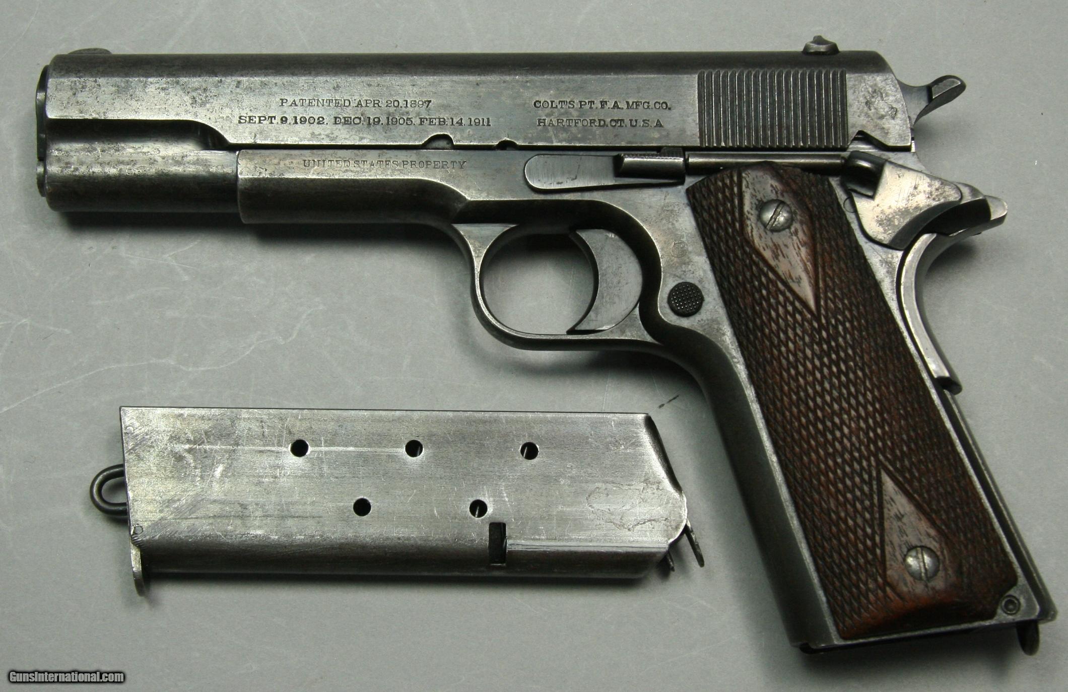 Description: This Colt M-1911 is a rare survivor from 1913. The gun was purchased from a Pawn shop over 30 years ago. It is The Pawn Shop owner was told that it was from the USS TEXAS, this is an unsubstantiated rumor but perhaps better research is available. These early guns saw service in two world wars, how many have survived intact, without arsenal re-build? The parts, (excluding the Mag.) are original and correct to this gun. The remaining finish is original and the gun has not been rebuilt. There is the expected finish wear for a 100 year old service pistol, with very light minor pitting scattered mostly on the slide. A holstered pistol in a salt air environment will not survive like most Army guns. Surprisingly it has lasted for 100 years without an idiot scratch from the takedown lever. The bore is very good with minor frosting. This is a rare opportunity to add a 1913 dated U.S. NAVY marked pistol to your collection. .45 ACP Cal. with a 5 ½” Barrel. Serial Number 38861. FFL Required. Beaver Creek Arms TERMS & CONDITIONS Objective: As a collector of 35 years and Licensed Firearms Dealer since 1989 I have a clear definition of a satisfactory transaction. I will be paid as we agreed to, and you will be satisfied with your purchase. My goal is to establish a client list of satisfied repeat customers who will recommend me to other collectors. It’s just that simple. Exiled Saudi princes with secret funds needing change from an over paid purchase need not apply. Notice: ALL Federal, State, & Local firearms laws will be followed. I will take NO shortcuts in the process of a legal sale or transfer, so please don’t ask. SHIPPING: Normally shipments are made via U.S.P.S. Priority Mail, Insured, with a return receipt. Typical Packing, Shipping and Insurance cost for a handgun is $30.00, and for a Long Gun is $45.00. Availability: All items are in stock and available for immediate shipment. Please call or email and an Item will be held up to a week with your Name, Address, & Phone Number. Items marked Reserved are being held for awaiting payment or on layaway. If you are interested in a reserved item, please call or E-Mail to be placed on a backup list. FIREARMS: Modern firearms, post 1898, can only be shipped to a Type 01 Federal Firearms License address. Curio-Relic firearms, as defined by the BATF list, can usually be shipped to a Type 03 Collectors License address. Some states have additional restrictions such as CA, CT, DC, IL, MD, NJ and NY. A signed valid FFL license copy either mailed or emailed will be required for shipment to only the license address. Antique firearms, pre 1898 do not require a Federal License. For purchase, a copy of a Government Issued Identification (Drivers License, Etc), showing date of birth and current address will be required. GUARANTEE: Your complete satisfaction is assured, see objective above. If you are not satisfied, please contact me within 3 days of receipt. Please don’t fire the weapon, safety, function and accuracy are NOT Guaranteed. Any weapon offered by Beaver Creek Arms is never test fired nor is there any representation the gun is functional and safe to fire. These guns are sold for collectors and only represented as used firearms that must be checked by a competent person, observe all the necessary safety precautions prior to attempting to load and fire one of these weapons RETURNS: Returns must be made within 3 days of receipt. They must be received in exactly the same condition with no parts exchanged. If it has been altered, damaged, or fired, a refund will not be made. Packing, shipping and insurance cost will not be refunded. All layaway purchases are returnable for merchandise credit only. Sales: All sales are made with the buyer’s full acceptance of the stated terms of sale. All sales are made in strict compliance with all Federal Firearms Laws. No items contained in thissite are offered for sale where prohibited by any Federal, State or Local laws. By ordering, the buyer certifies that their purchase will be in full compliance with all Federal, State and Local laws. All transactions shall be deemed to occur in Pennsylvania regardless whether by telephone, mail, internet or the physical location of the buyer. All transactions will be subject only to Federal and Pennsylvania State law. Any disputes will be resolved in a Pennsylvania Court. PAYMENT: Bank check, Personal check, and Money Orders are preferred. Visa and MasterCard are accepted with a 3% processing fee. For Visa and MasterCard orders please provide the account number, code number, expiration date, name on card, phone number and card billing address. This information can be phoned in, or E-Mailed. All orders must be paid in advance, C.O.D. orders are not accepted. Checks, both Bank and Personal must clear before the order will be shipped, usually a 2 week delay. LAYAWAYS: A 20% deposit is required. Balance is due in 60 days. Deposits are non-refundable and are forfeited after 60 days. Layaway sales are returnable for merchandise credit only. SALES TAX: Pennsylvania state sales tax is 6% for in state purchases. The payment of other states sales tax, if applicable, for shipped items is the buyers responsibility. DISCREET: Client information will remain Confidential. Your privacy is protected. SOLD Curio/Relic: Yes |