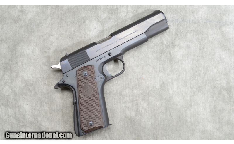 Description: This 1911 features low profile fixed post and notch sights, checkered Colt wood grips with molded-in Rampant Colt medallion, blued steel frame and slide, in a well-maintained package. In fact, it doesn't appear to have been fired much at all. SOLD Manufacturer: 1969 based upon the S/N 326xxx-C Caliber Info: .45 ACP. Chambers: 7 + 1 capacity semi-automatic. Metal Condition: Excellent. It could pass for new. Wood Condition: Excellent. It could pass for new. Bore Condition: Shiny and bright with good rifling. Barrels: 5 inch blue barrel with factory sights. Triggers: Factory single action trigger. Stock: Checkered Colt wood grips. Weight: 39 oz. Sights: Factory low profile post and notch sights. Extras: Box. Item Location: Rogers,, MN |