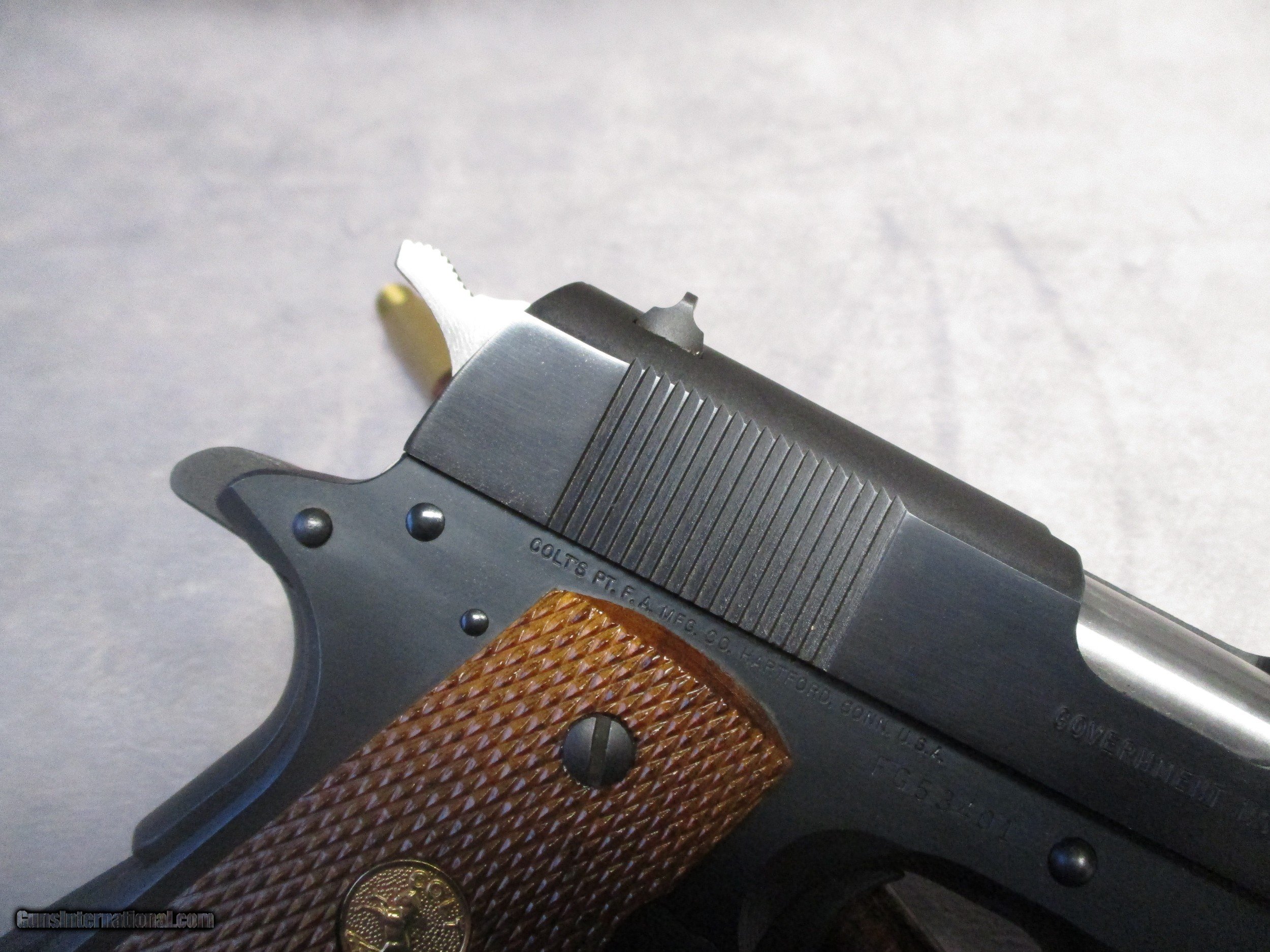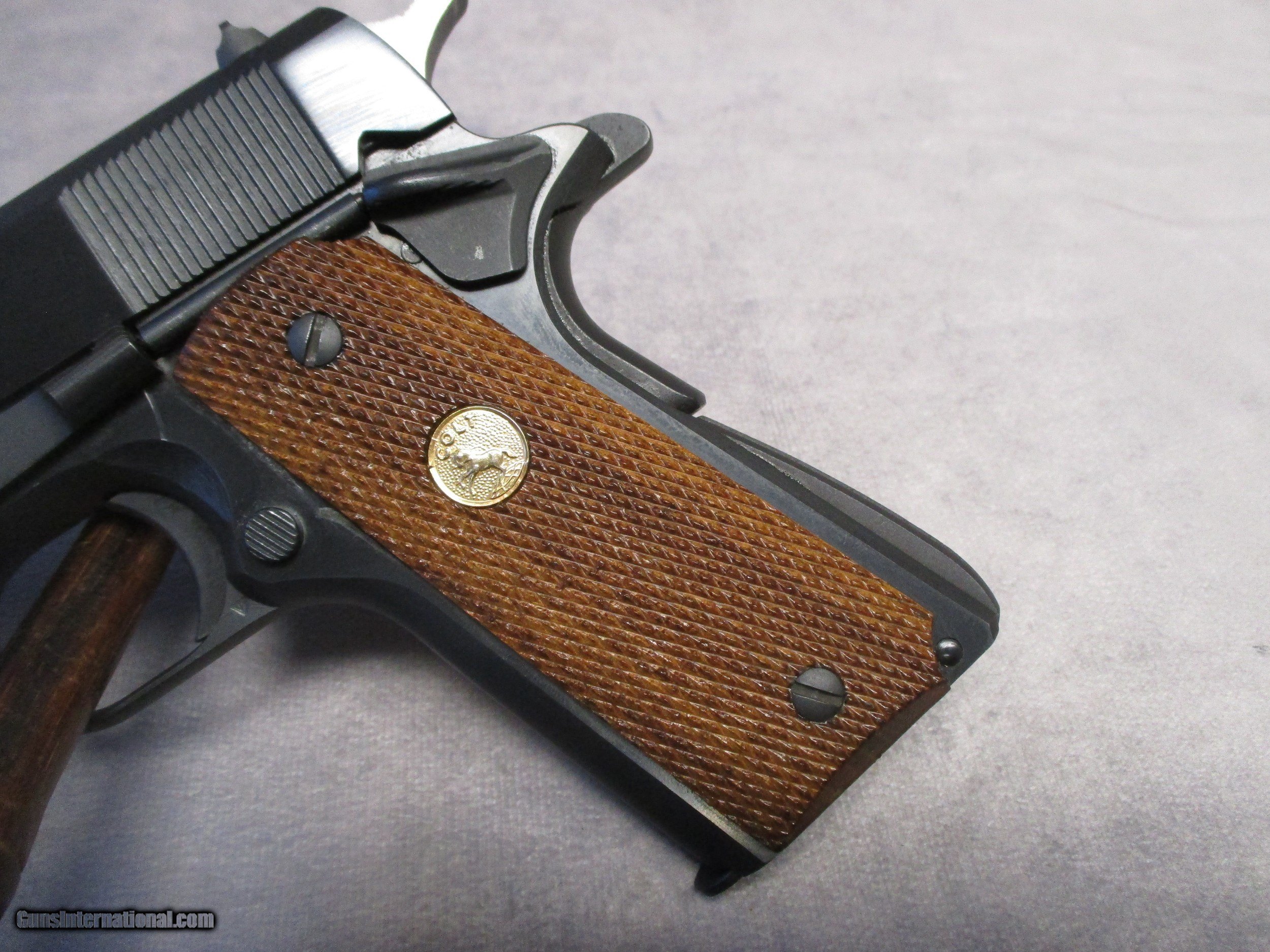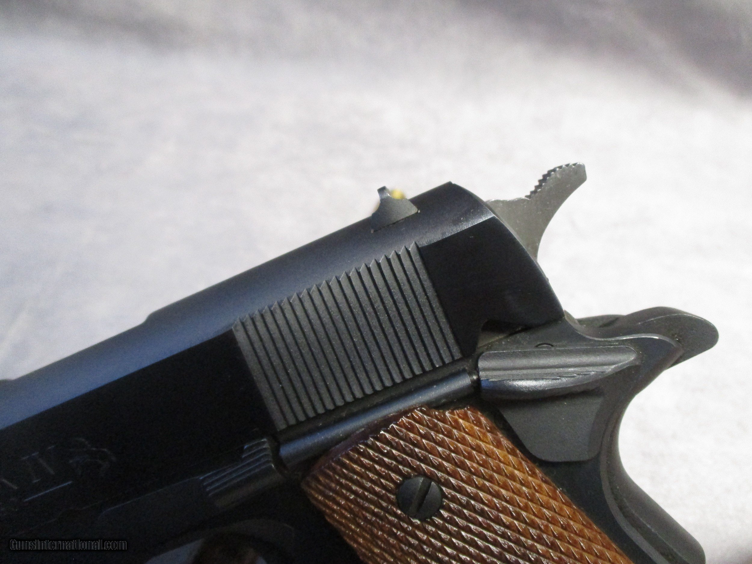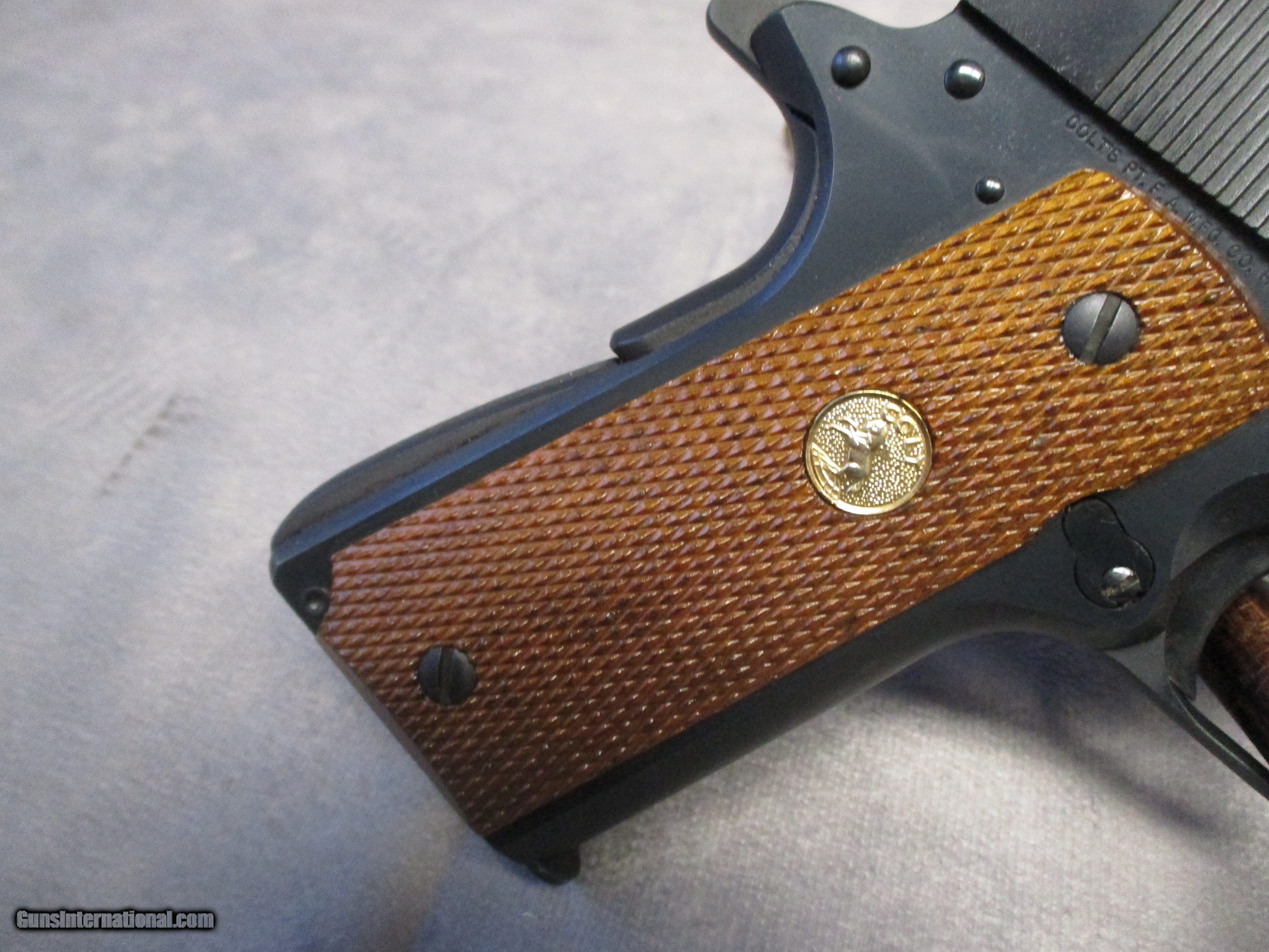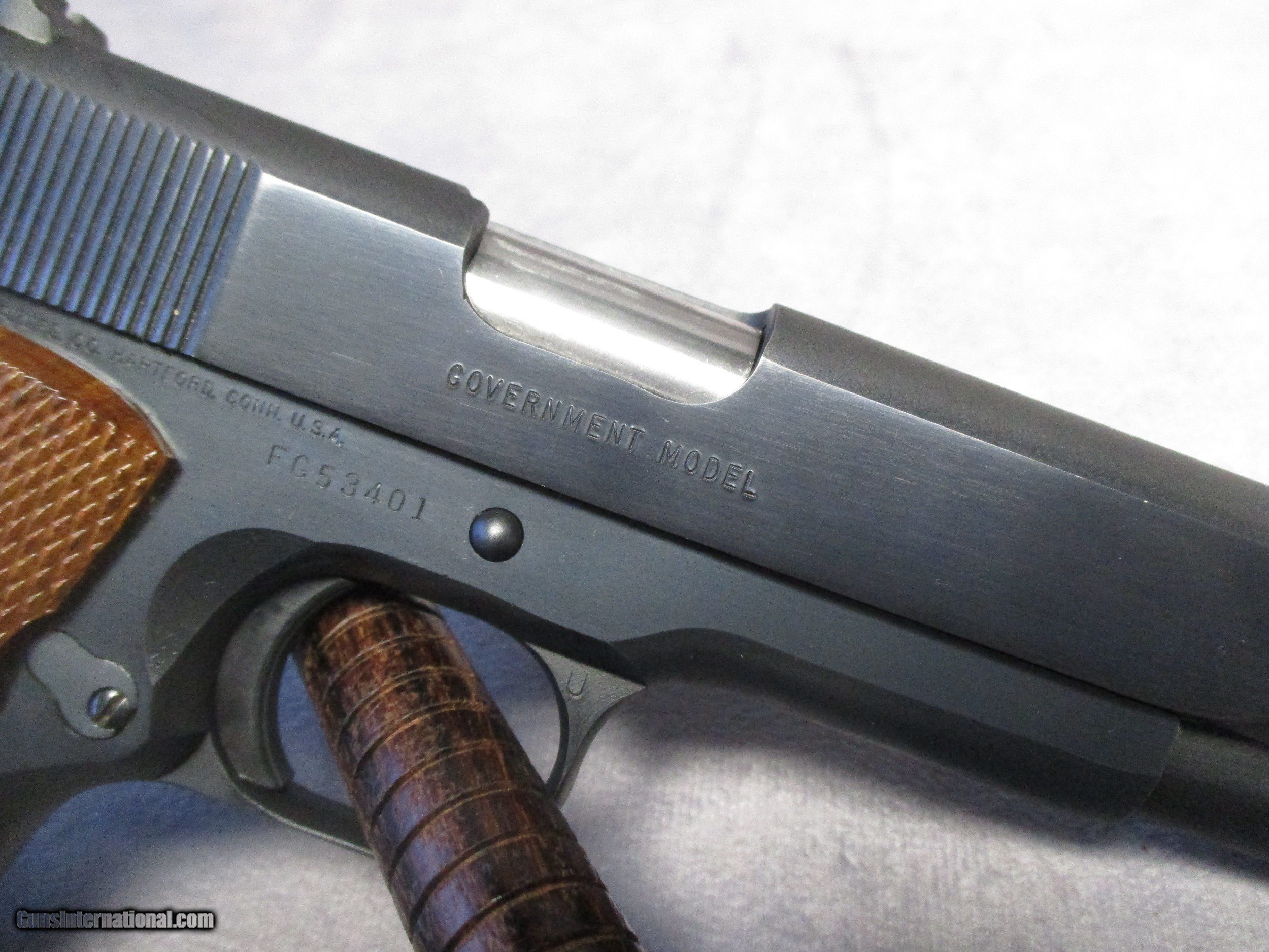 Description: The Colt 1911 is perhaps the most famous semi-automatic pistol ever made having a long and successful carrier in both military and civilian use. The 1911 and its cartridge, the famous .45 ACP, were designed by John Moses Browning to fulfill a requirement by the U.S. Army for a new service pistol which would also become the first semi-automatic to be officially adopted by the U.S. Army, replacing the M1909 revolver in .45 Colt in service. The 1911 proved to be one of the most reliable and durable semi-automatic pistols ever designed, successfully serving the U.S. Armed Forces through World War I, World War II, Korea, and Vietnam. This nice pistol is a Mark IV Series 80, which according to the Coltsite, was produced in 1985. It is in excellent condition and comes with its original box. There are only three signs of wear. The first is a mark on the let side of the frame underneath the slide lock. This is a type of mark that is frequently seen on 1911s and is a result of improper reassembly of the pistol. The second is some light wear in the finish on the front strap. The third is a modest amount of finish loss on the barrel from the cycling of the slide. This is not visible when the slide is all the way forward. Otherwise, the pistol appears as it did the day it left the factory. SOLD Handgun Caliber: .45 ACP (.45 Auto) Manufacturer: Colt's PT. F.A. Mfg. Co. Model: Mark IV Series 80 Serial Number: FG53401 Bore: Rifled Condition: Excellent Barrel Type: Tilting Action: Semi-Auto, Short recoil, Locked Breech Triggers: Crescent moon trigger w/serrations Stock: Checkered walnut with CO Finish: Blued Sights: Dovetailed front and rear, sight radius 6.5 inches (165 mm) Manufacture Date: 1985 Case: Colt box |