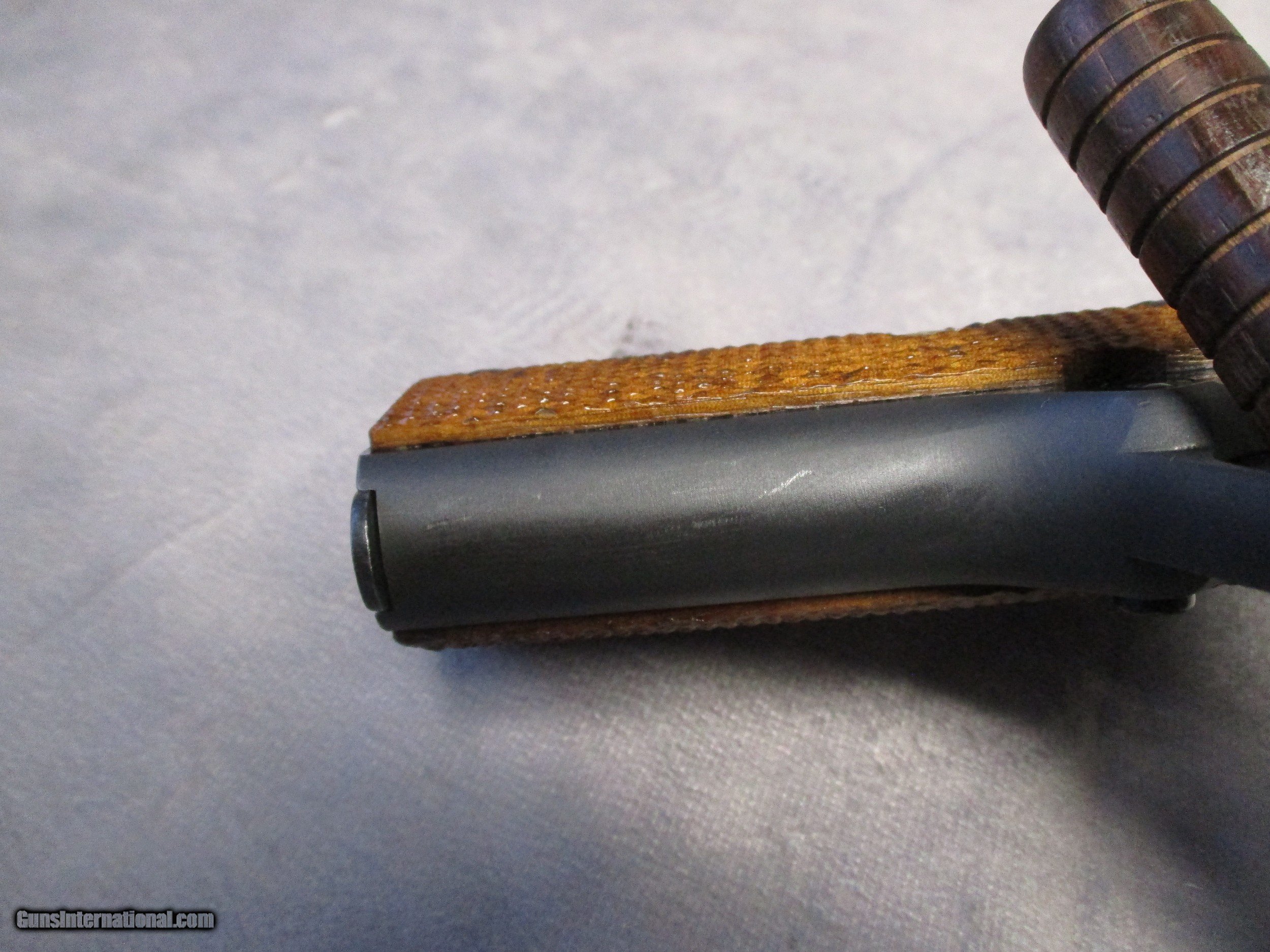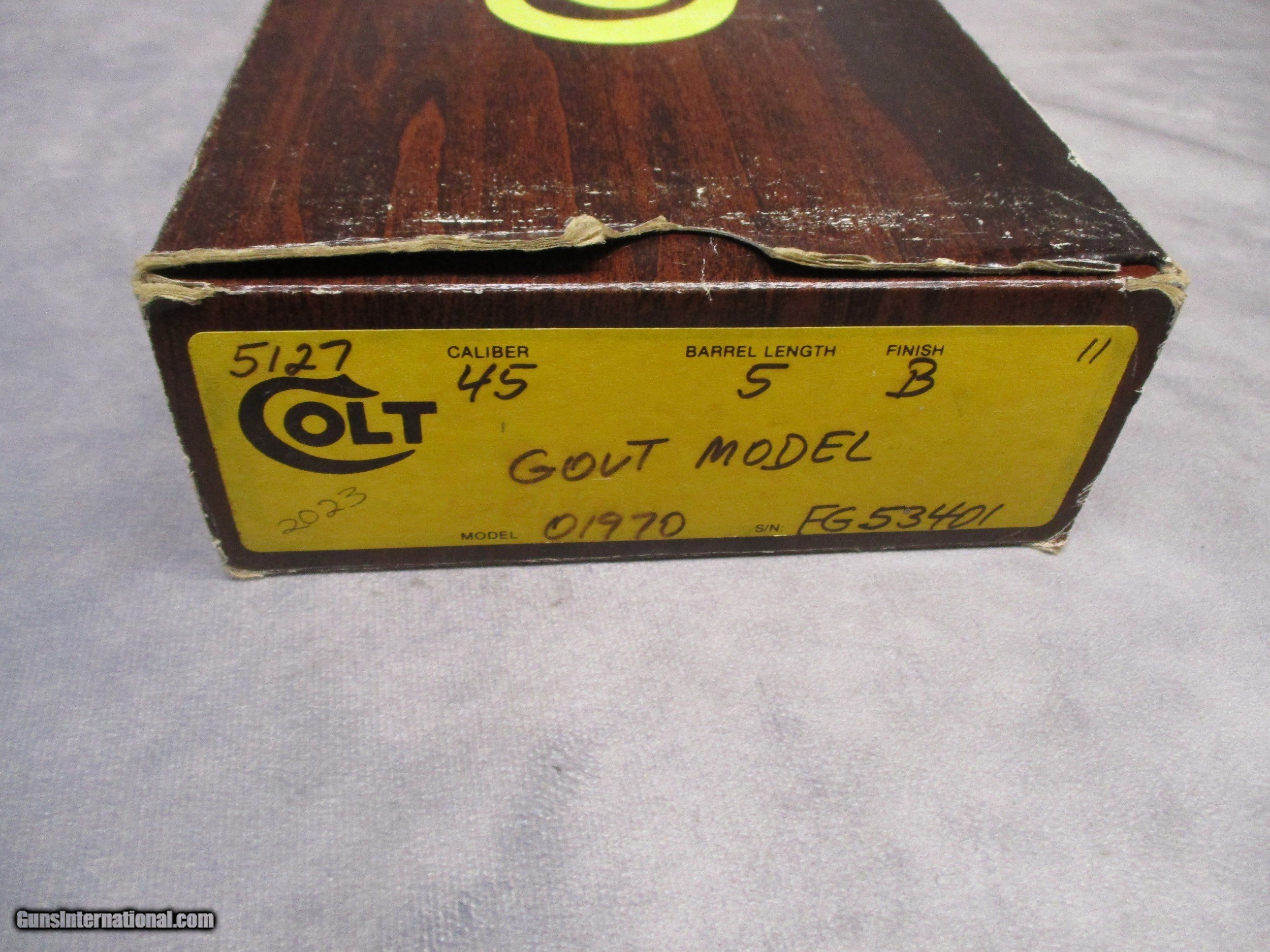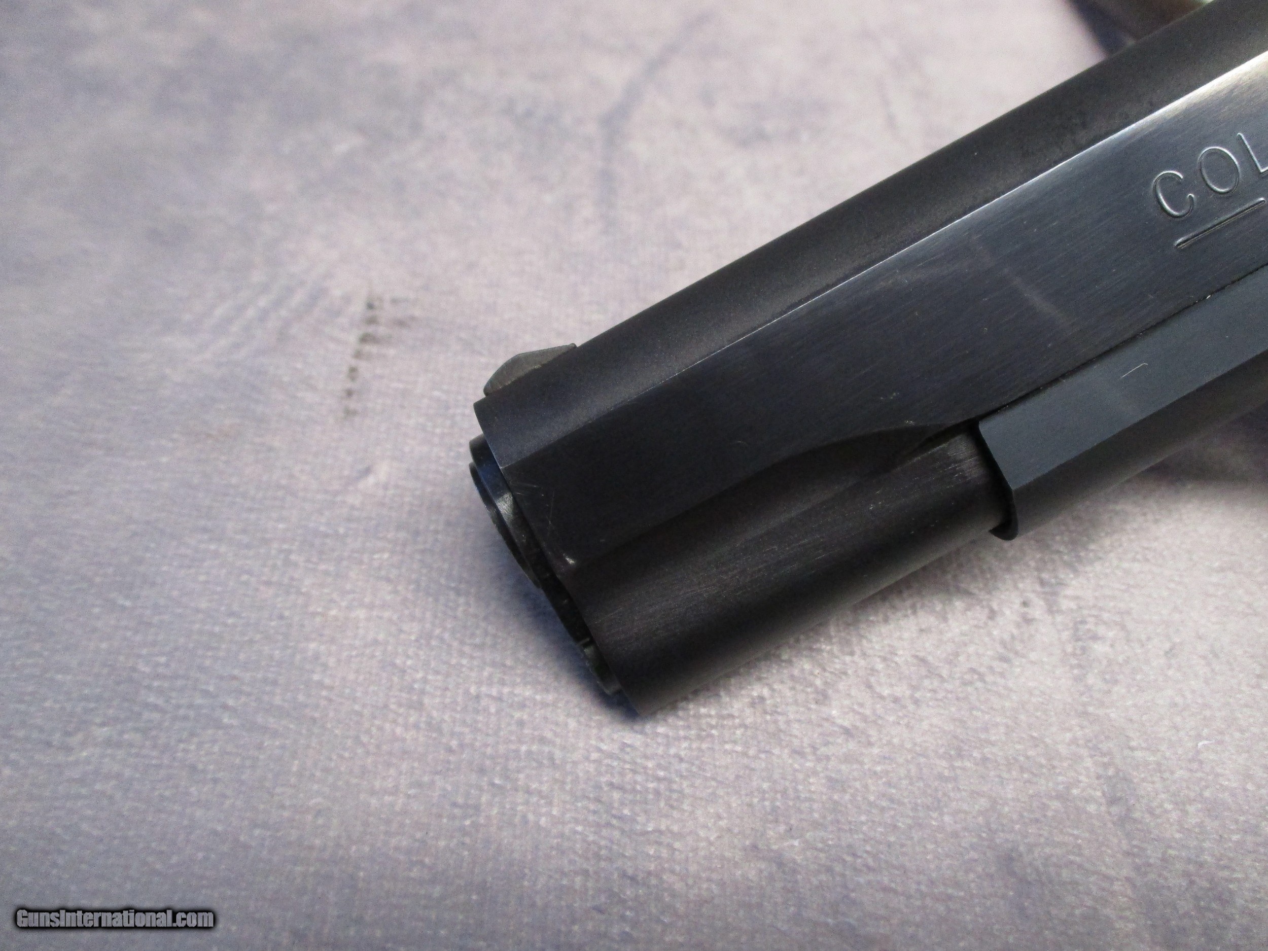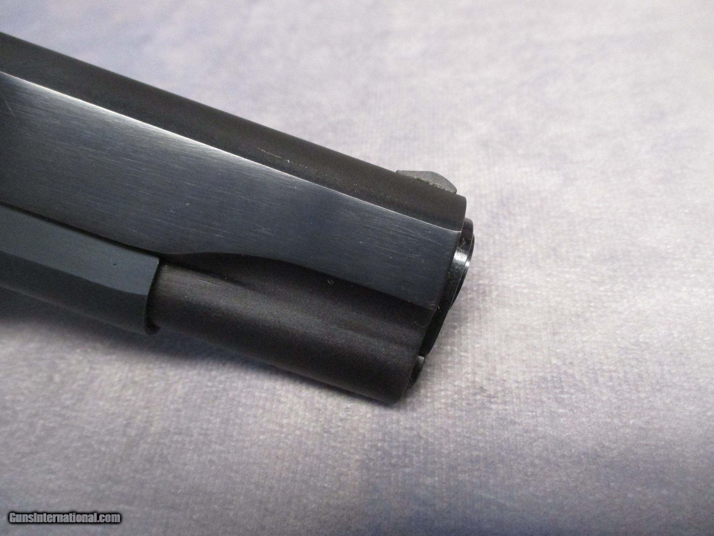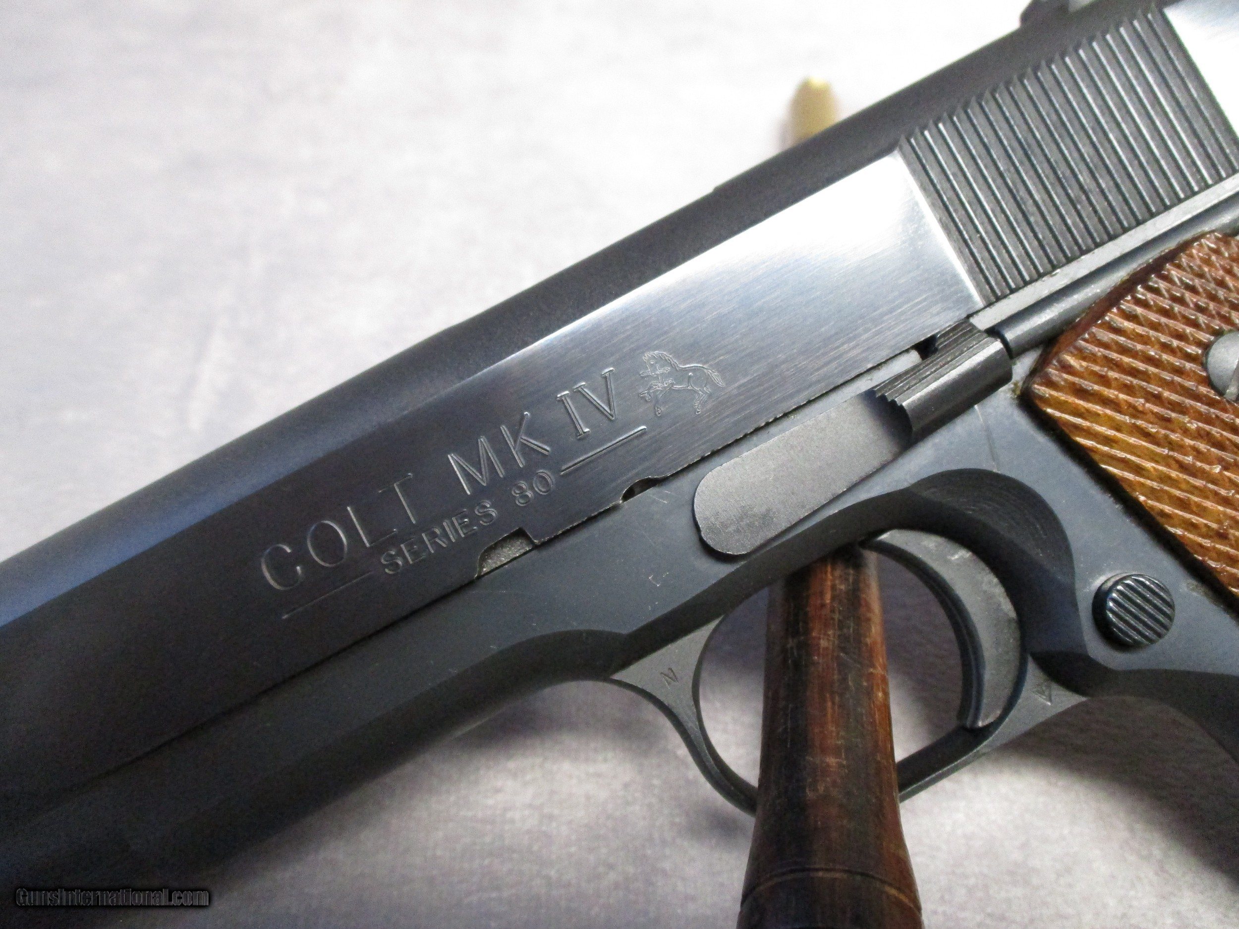 Description: The Colt 1911 is perhaps the most famous semi-automatic pistol ever made having a long and successful carrier in both military and civilian use. The 1911 and its cartridge, the famous .45 ACP, were designed by John Moses Browning to fulfill a requirement by the U.S. Army for a new service pistol which would also become the first semi-automatic to be officially adopted by the U.S. Army, replacing the M1909 revolver in .45 Colt in service. The 1911 proved to be one of the most reliable and durable semi-automatic pistols ever designed, successfully serving the U.S. Armed Forces through World War I, World War II, Korea, and Vietnam. This nice pistol is a Mark IV Series 80, which according to the Coltsite, was produced in 1985. It is in excellent condition and comes with its original box. There are only three signs of wear. The first is a mark on the let side of the frame underneath the slide lock. This is a type of mark that is frequently seen on 1911s and is a result of improper reassembly of the pistol. The second is some light wear in the finish on the front strap. The third is a modest amount of finish loss on the barrel from the cycling of the slide. This is not visible when the slide is all the way forward. Otherwise, the pistol appears as it did the day it left the factory. SOLD Handgun Caliber: .45 ACP (.45 Auto) Manufacturer: Colt's PT. F.A. Mfg. Co. Model: Mark IV Series 80 Serial Number: FG53401 Bore: Rifled Condition: Excellent Barrel Type: Tilting Action: Semi-Auto, Short recoil, Locked Breech Triggers: Crescent moon trigger w/serrations Stock: Checkered walnut with CO Finish: Blued Sights: Dovetailed front and rear, sight radius 6.5 inches (165 mm) Manufacture Date: 1985 Case: Colt box |