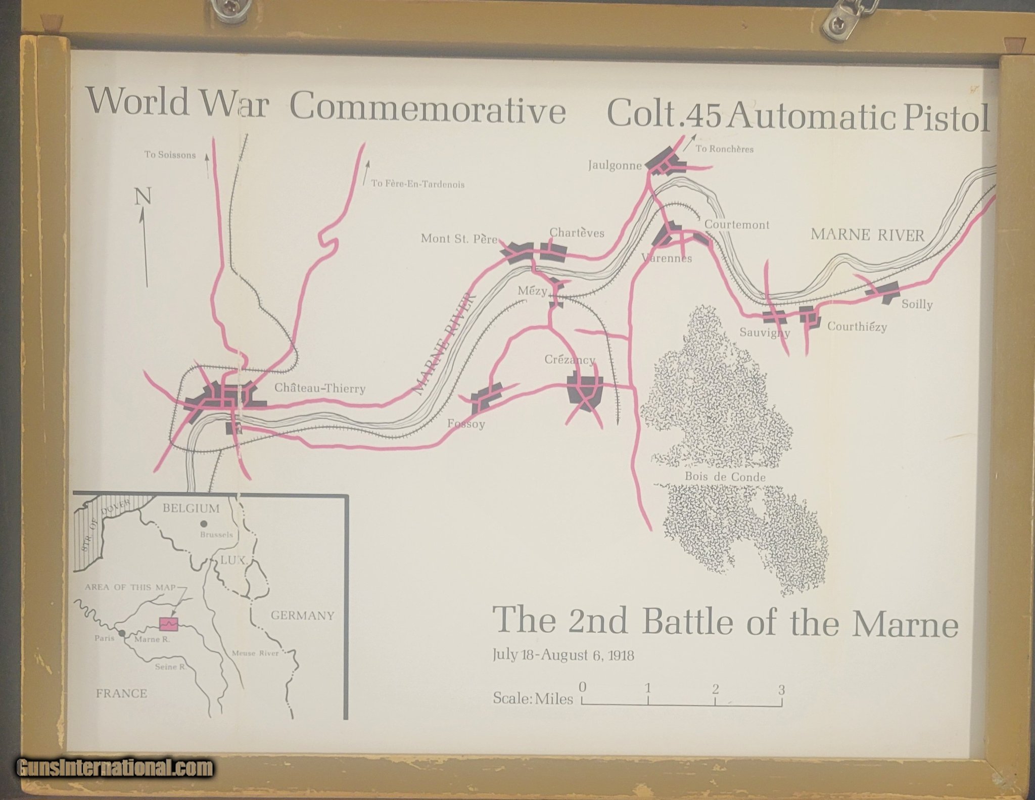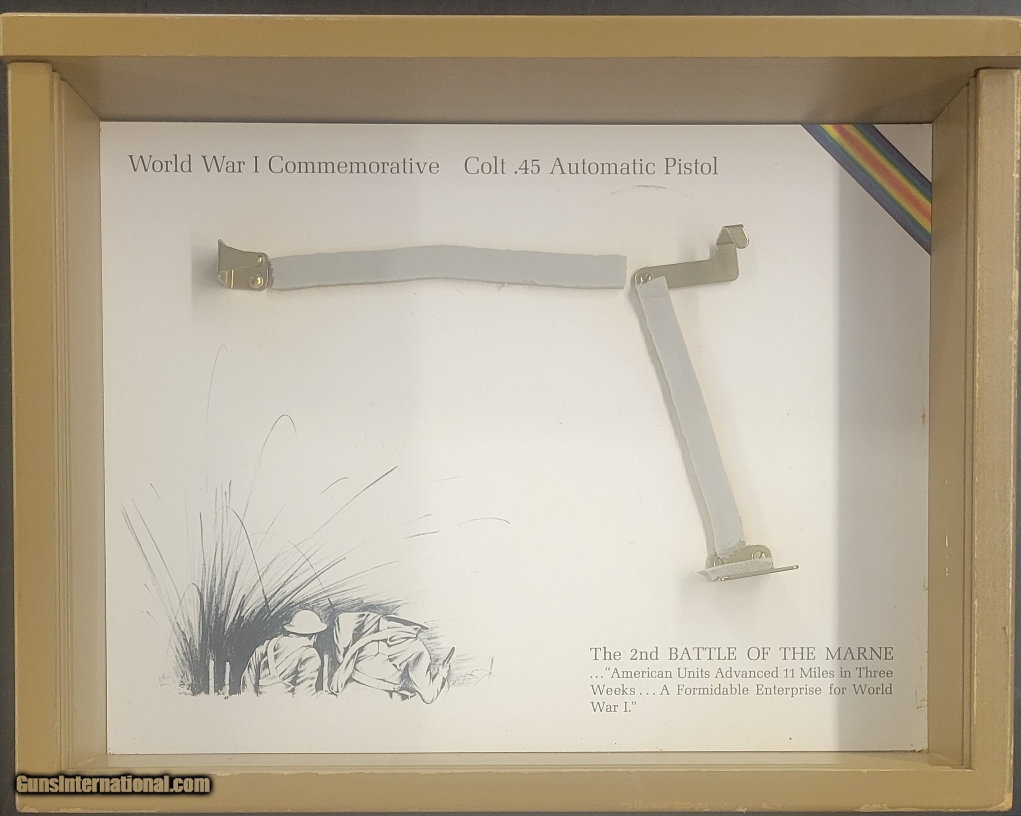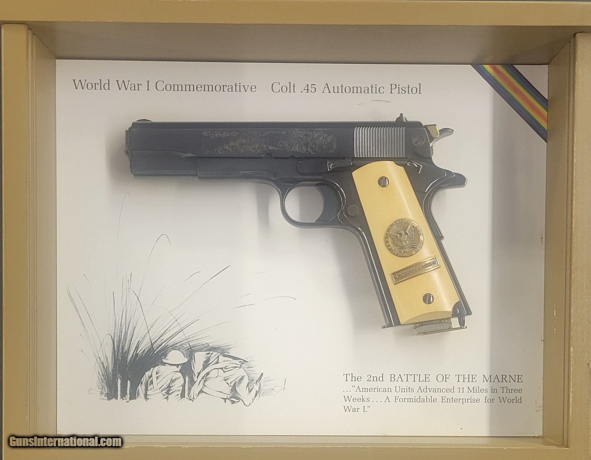 Description: Guns Listing ID: 491089 Available - this fantastic Commemorative Colt 1911 standard model pistol. Manufactured by Colt in 1968. The original 70 series. Honoring the 2nd battle of the Marne, this is the Standard Model with gold inlay and hand engraving.Production of this Commemorative totaled 7500 pieces - this is serial # 161-M2. Detailed, glass front display case is included. SOLD Manufacturer: COLT Model: MFG 1911 WWI Reproduction Condition: Used - Non-Certified Barrels: 5 Gauge Info: .45 ACP Finish: blued w/ engraving |