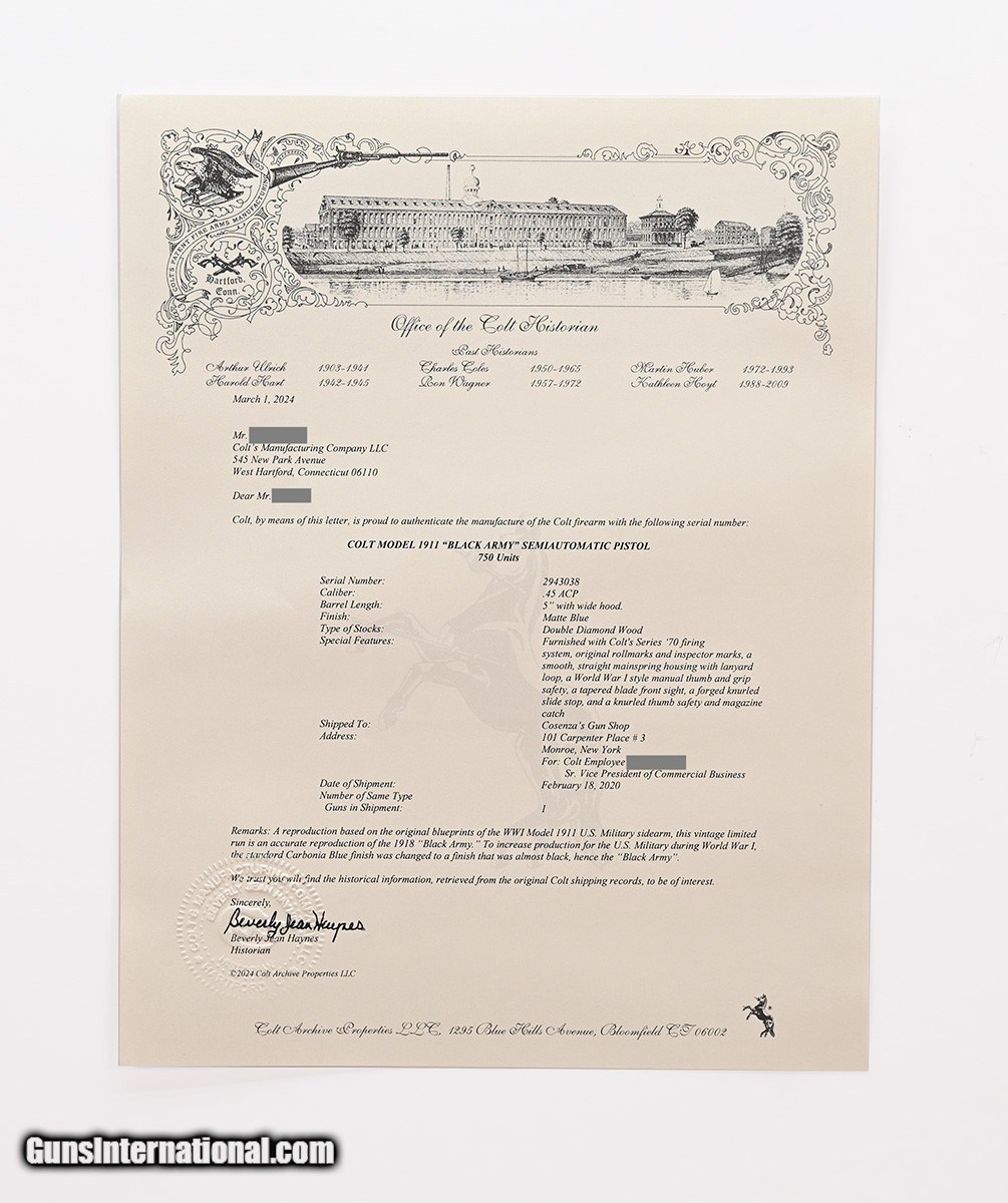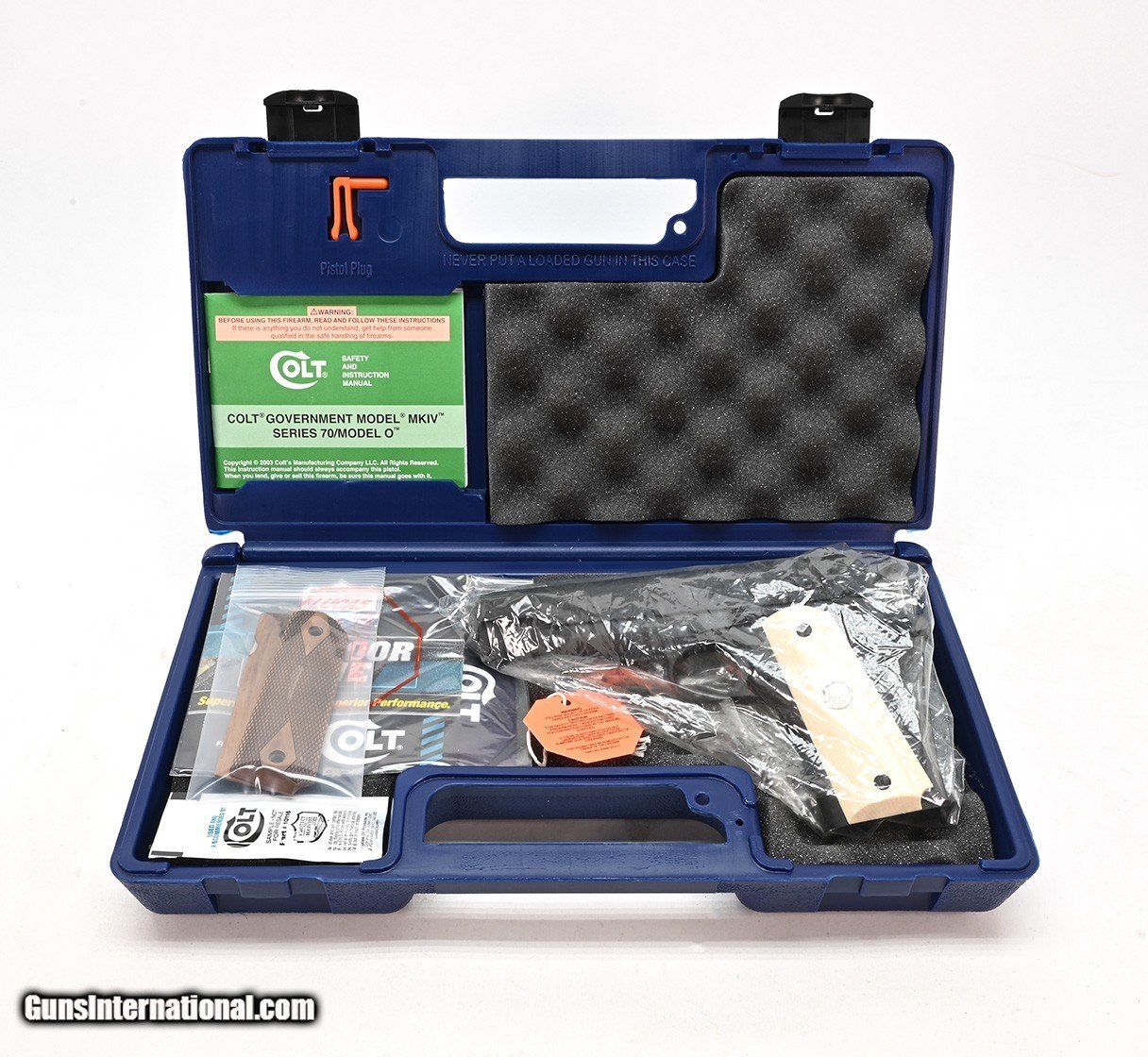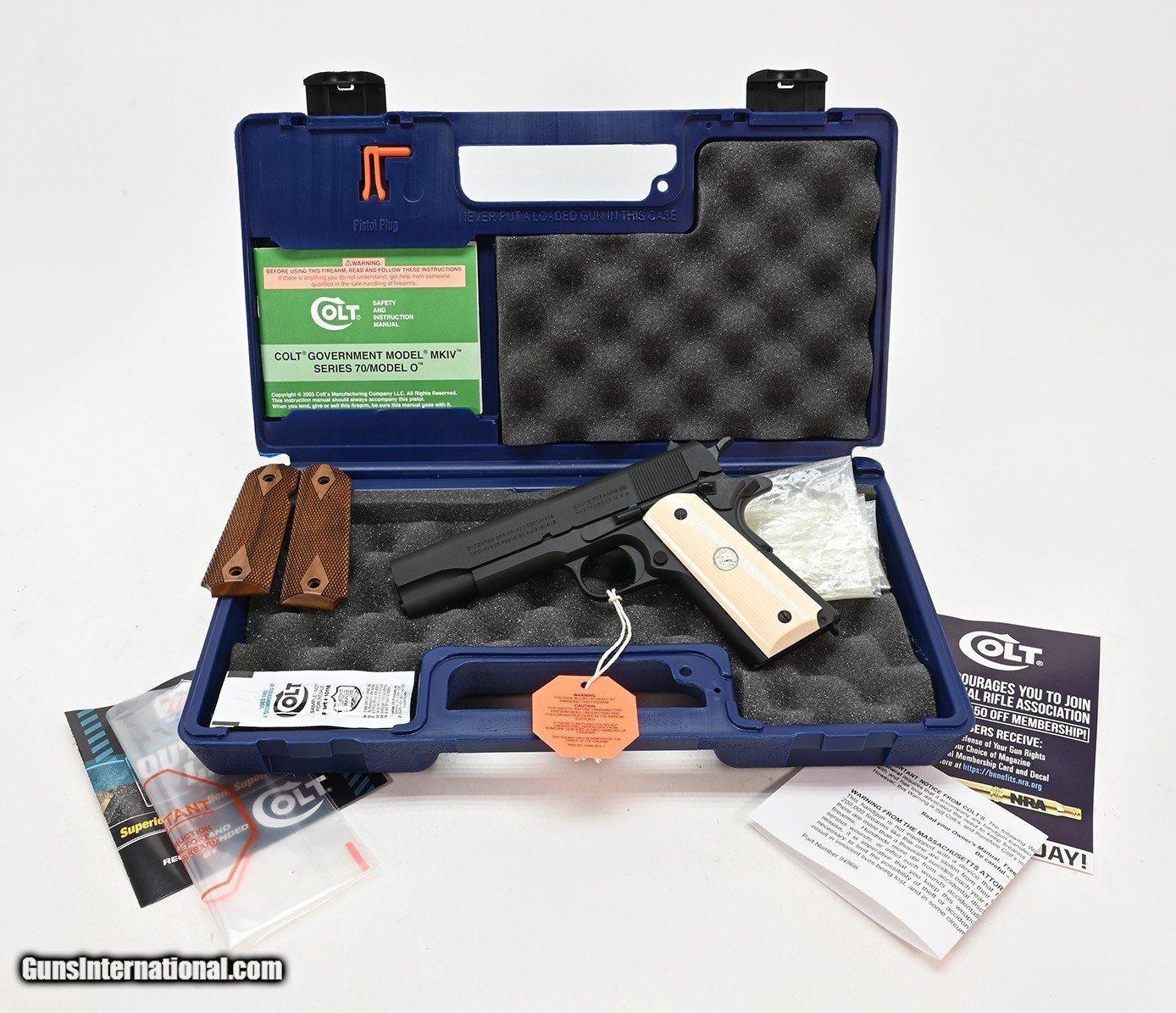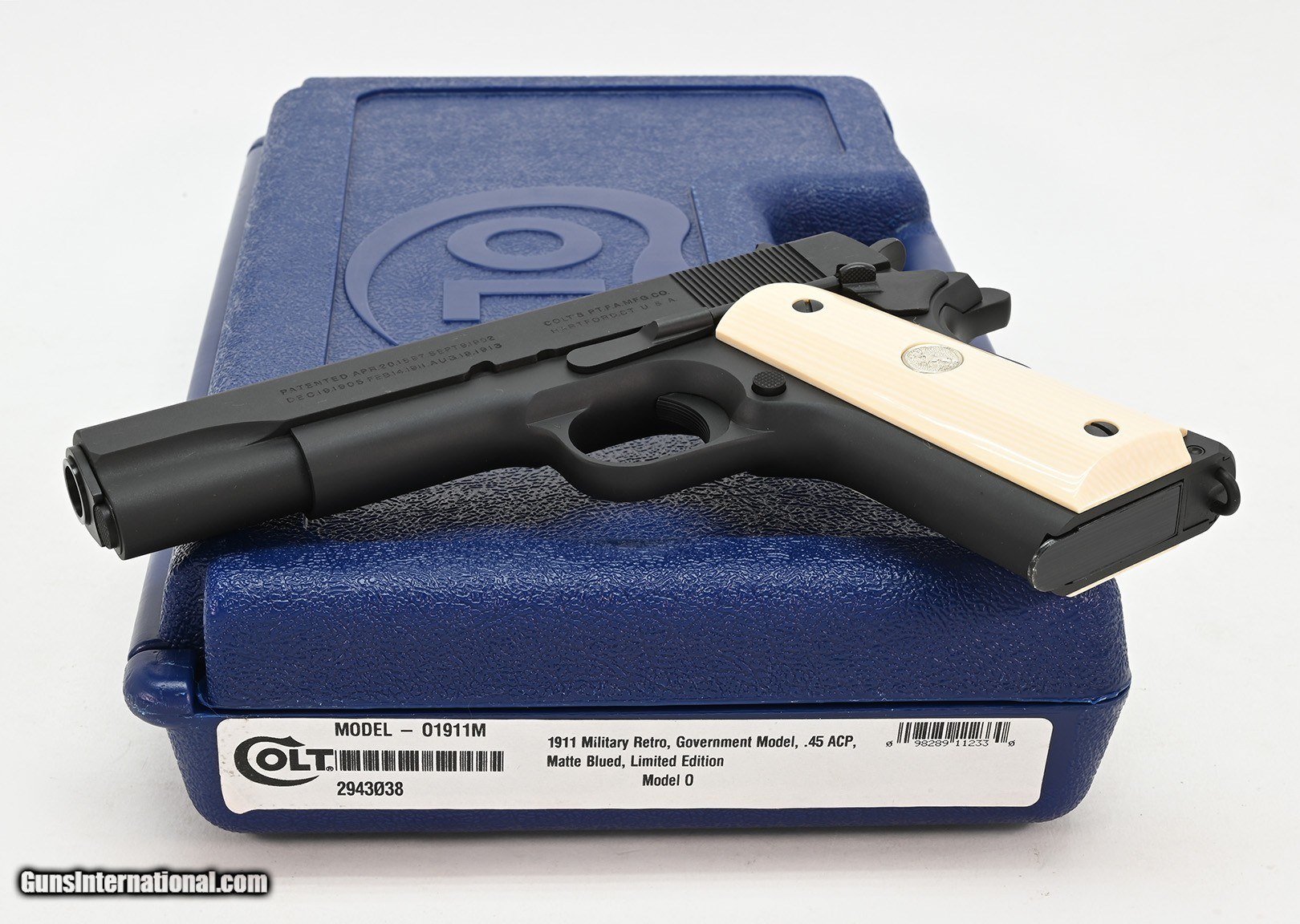Description: Colt Military Retro Government .45 ACP. Model 01911M With Bonded Ivory Grips. Looks New, Unfired AVAILABLE FOR PURCHASE AT OUR ON-LINE STORE ATTENTION NEW COLLECTORS: We Are Excited To Offer A Super RARE Collection Of Ultra Low Serial Numbered Colt Firearms From The Personal Collection Of A Recently Retired Senior Colt Firearms Executive. These Will Greatly Appreciate In Value Over Time. This Colt 'Black Army' Military Retro Government Model 01911M Comes Mounted With Ivory Bonded Grips And Extra Walnut Grips.
