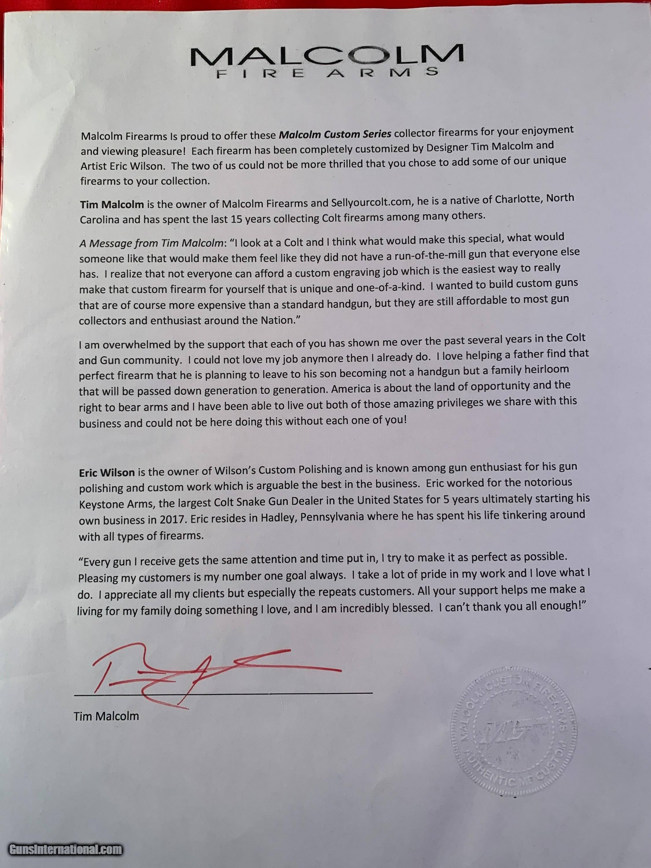 Description: SOLD-From my private collection of collecting guns for several decades, is a unique and rare "1 of 1" custom made Colt MKIV Series 80 Officers Model 1911 in .45 caliber with a ported 3-1/2" barrel sporting a polished bright stainless finish. This is number 6 of only 25 limited sets of different Colt models custom made in 2018 by Malcolm Customs, but one of one in this Colt model and design. Colt engraved handguns are to be "unique" like no one else owns but can be over $5k, so the owner wanted to create beautiful unique pieces for those select collectors that want something different than anyone else owns without breaking the bank! If you aren't interested in rare high quality unique handguns that no one else owns, buy a Glock and have fun-LOL. This has been professionally ported and has the gorgeous "museum quality" polished bright stainless steel finish you could shave in! It has a beautiful engraved custom mag well rear grip, custom Colt grip screws, gold dipped Colt medallions on Ivory "style" grips. This has the origanal Colt box and docs (unopened in sealed plastic)! It also comes with a custom locking wood presentation case with a glass top (both shown in the photos). It has a set of keys taped to the bottom of the case so it can be locked to prevent curios lookers from handling the gun. I have never loaded the gun or fired it since purchased. It has been on display in a humidity controlled environment with my collection only to be admired. To me the finish and condition is "museum quailty" but review all of the detailed pictures to decide for yourself. I always recommend anyone with intentions of firing a collector quality gun that has only been dispalyed for years, have a gunsmith do a thorough inspection and be sure the internals are oiled to factory specs before firing the weapon. I cannot personally warranty any handgun so any concerns of warranty or guarantees would have to be with the manufacturer as I am a private collector and not a gun store. This can only be shipped to a current licensed FFL. It is your responsibilty to know the laws in your state for legally owning a handgun. Feel free to call me with any questions while reading the ad and viewing the photos for an honest inspection and answer to your question. I do not want any unhappy buyers and hoping to gain a list of serious collectors to stay in touch with in the future. Anyone returning it, must inspect the gun with the FFL dealer present as a witness during the entire inspection and before you take ownership and leave the dealer's location. The gun cannot be returned once it leaves the premises of the FFL receiving and inspecting the gun. It is impossible to know what someone does with a collectable piece once they leave and it makes returns difficult, espcially if someone causes loss in value of the gun due to mishandling. I ask you please CALL ME with any concerns DURING the inspection. If it goes to VM for any reason, only if you leave me a message I promise to call back the minute I get the message. I do not chase or return "missed calls" without a voicemail. Any approved return must include every item in the original shipment in the EXACT condition as shipped and shown in the photos. Any changes to condition or missing items, would cause a denial of a return or a reduction in the amount of return based on the change in value when I receive the return! Subject to a 15% restocking fee and the buyer is responsible for paying all fees including shipping in both directions, insurance and FFL fees on both ends of the transaction. PAYMENT: USPS Money Order or bank cashiers check. SHIPPING: Buyer responsible for actual shipping costs. SOLD Handgun Caliber: .45 ACP (.45 Auto) Manufacturer: Colt Model: MKIV Series 80 Officers Model 1911 Condition: MUSEUM QUALITY Metal Condition: MUSEUM QUALITY Bore Condition: EXCELLENT Action: Semi Auto Finish: Polished Bright Stainless Manufacture Date: Estimate 1986-1987 Engraving: Mag well Item Location: Georgia |