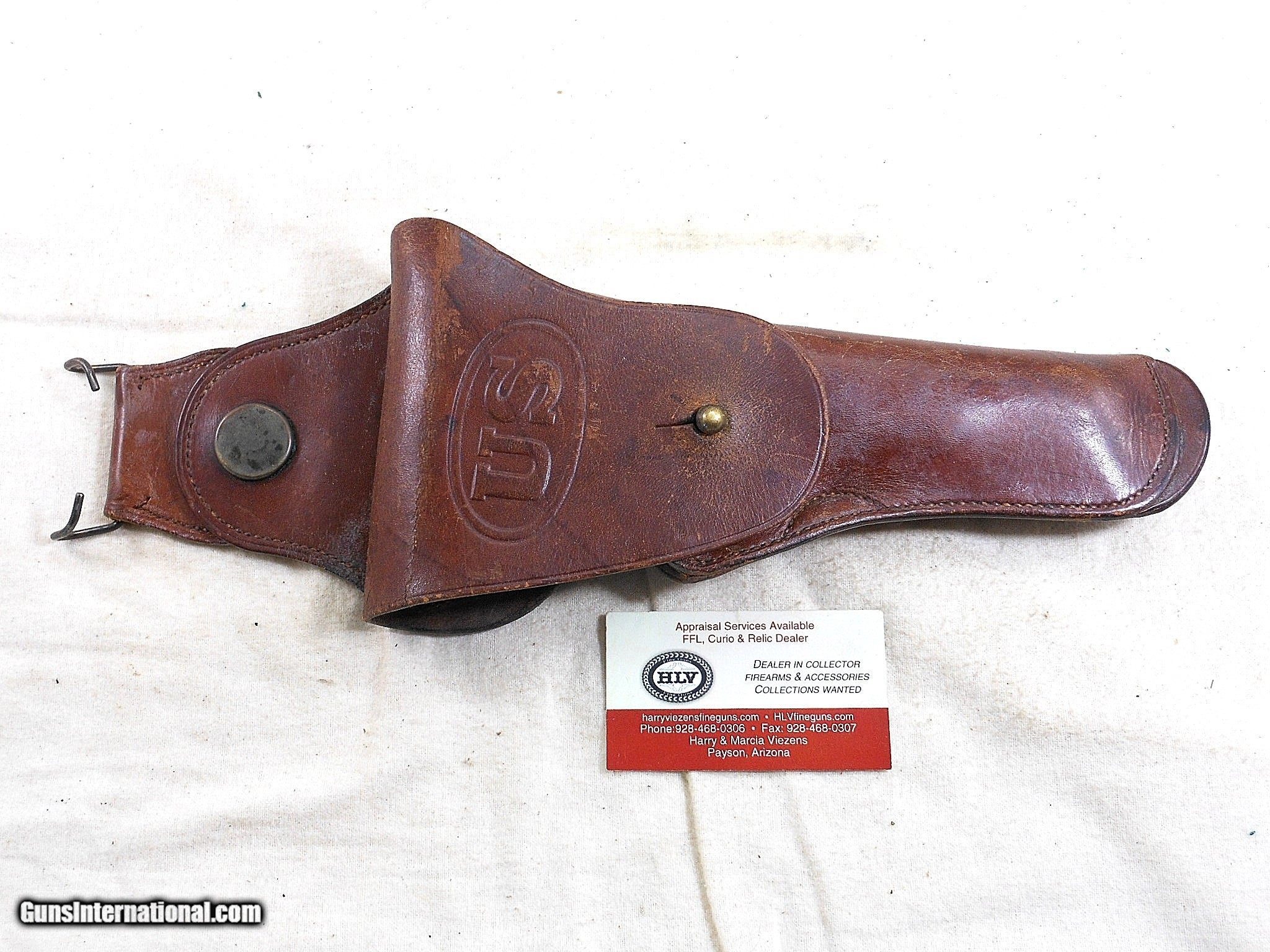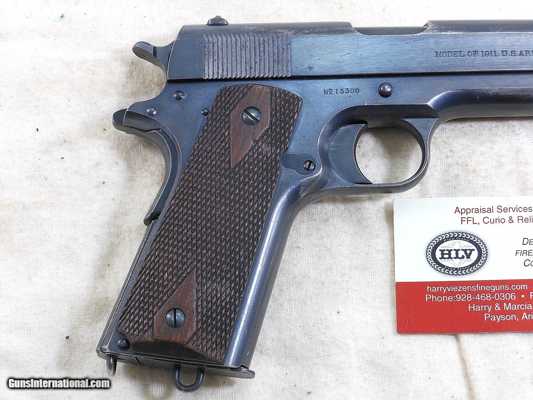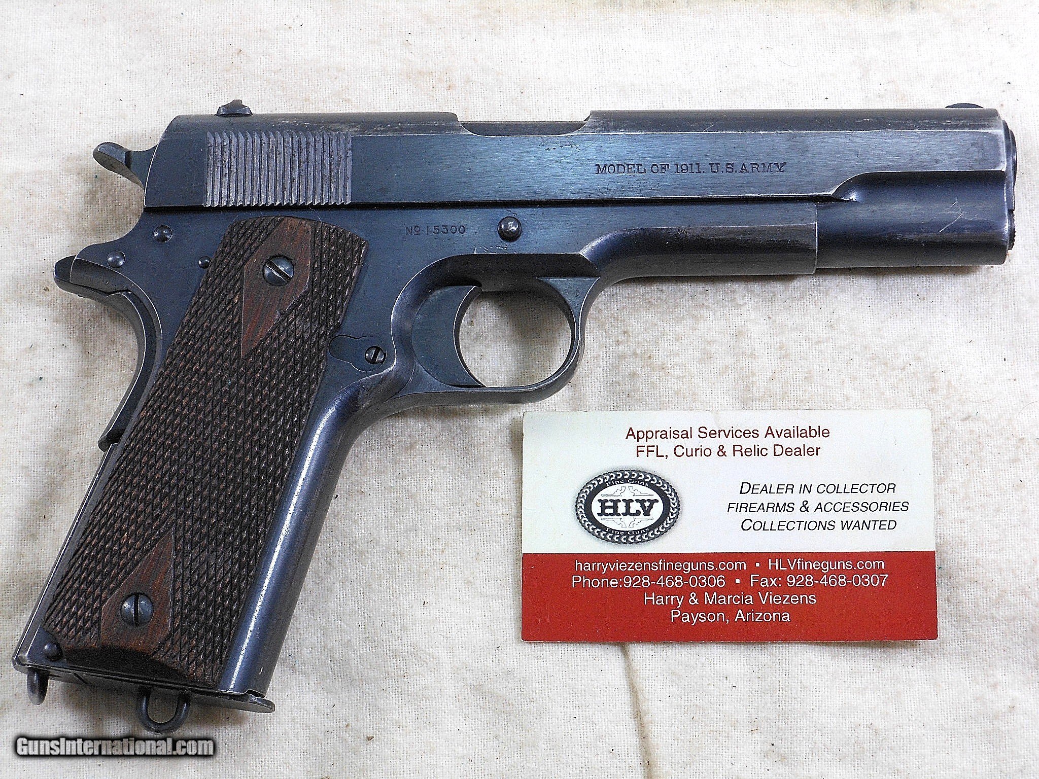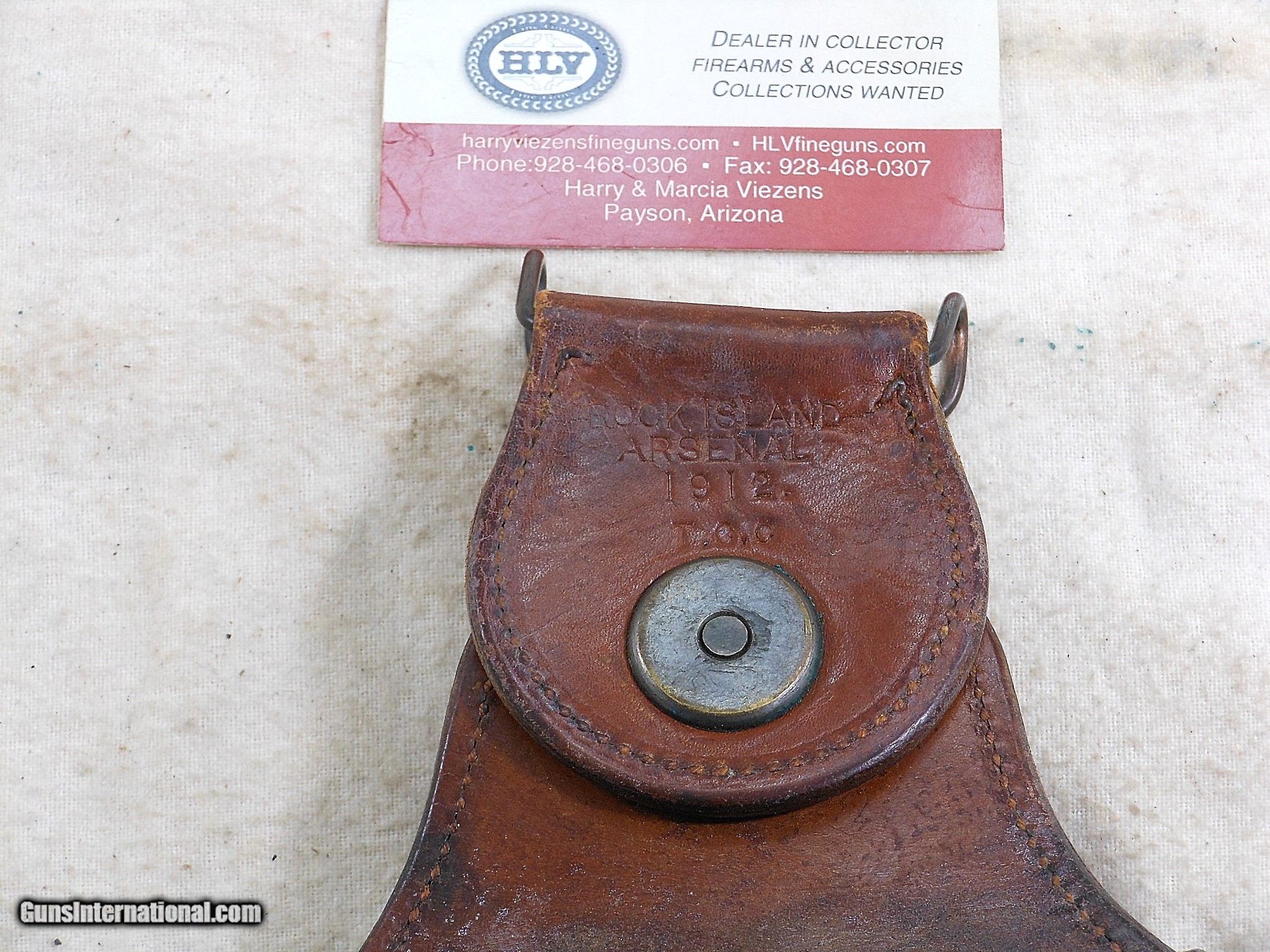 Description: SOLD This Colt was produced in the last run of 1912. The pistol's serial number is 15300. This first year production Colt has the correct barrel with the [ H ] stamped on the barrel upper lip. This 45 A.C.P. barrel is in very good bright condition with sharp lands. There is some sign of light pitting in spots due to the corrosive ammunition used during that time period. This Colt is all correct for the serial number range and time frame. It has the correct early style front and rear sights. The slide has the Colt in a circle above the safety. The original grips are in wonderful condition with only a few areas of checkering point flattening. The original key hole magazine is in very fine condition. The action works correctly with strong springs. The original bluing would rate a 91% or better condition. Most of the loss is on the high points from holster wear. The Original Rock Island Model 1912 Holster is in very fine serviceable condition. This holster is also dated 1912. The leg strap is missing which is common for these holsters. The leather is supple and the original finish is fully intact. This pistol rig is quite stunning and rare. It is not often that a first year Military Colt 1911 comes on the market in this fine of condition with it's matching dated holster! Here is such a pistol rig for the discerning collector! Curio&Relic OSEE - KEE (4) F. No. 667 -23 SOLD Curio/Relic: Yes Handgun Caliber: .45 ACP (.45 Auto) Manufacturer: Colt Model: 1911 Serial Number: 15300 Barrel Length: 5 Inch Chambers: Very Good Condition: 91% Metal Condition: Very Good Wood Condition: Very Fine Bore Condition: Very Good Barrels: Original Colt Barrel Barrel Type: Military Action: Self Loading Finish: Blued Sights: Standard Manufacture Date: 1912 Extras: Holster |