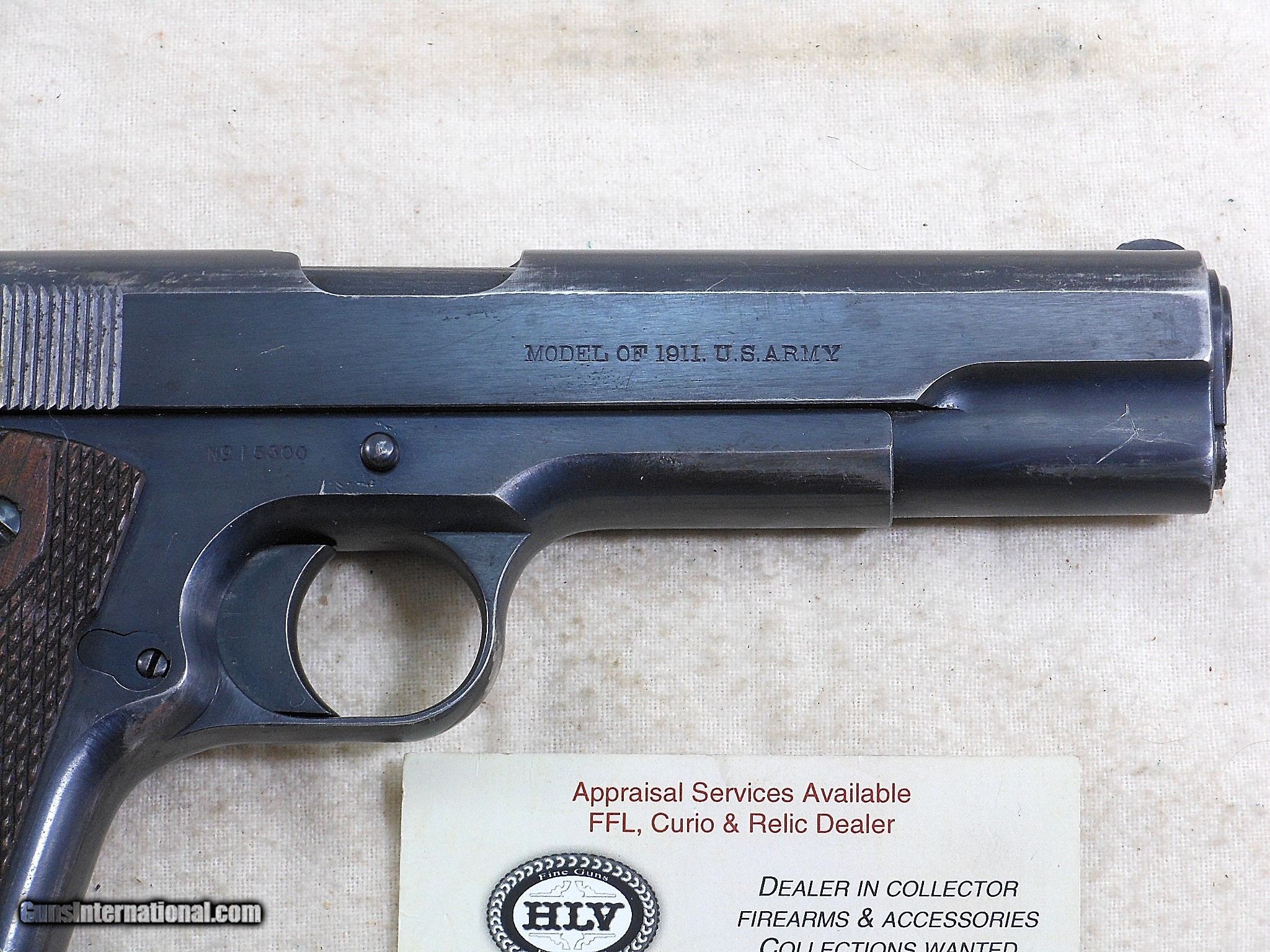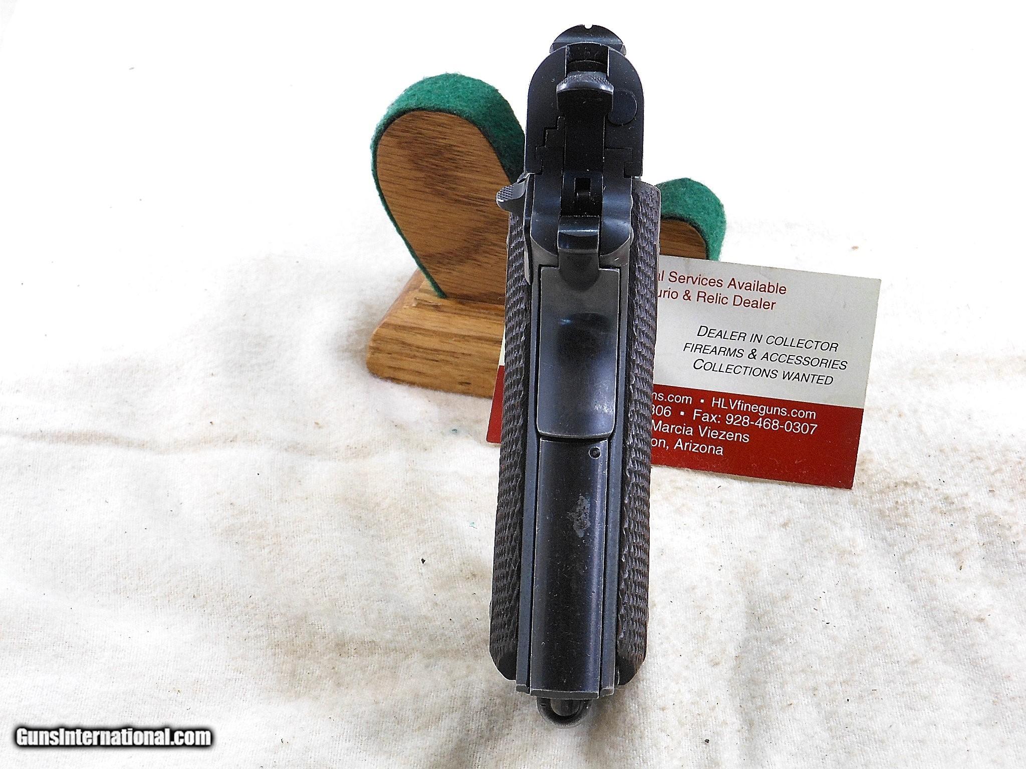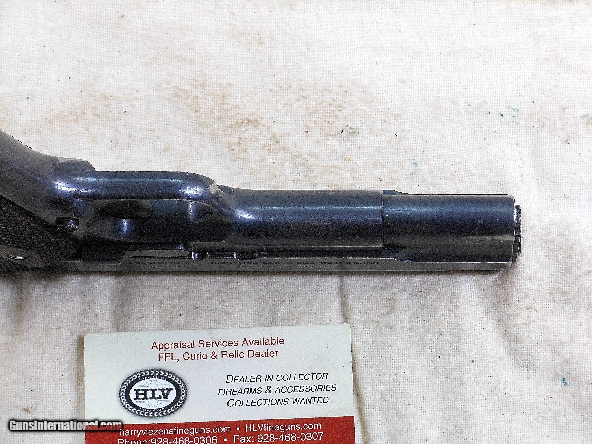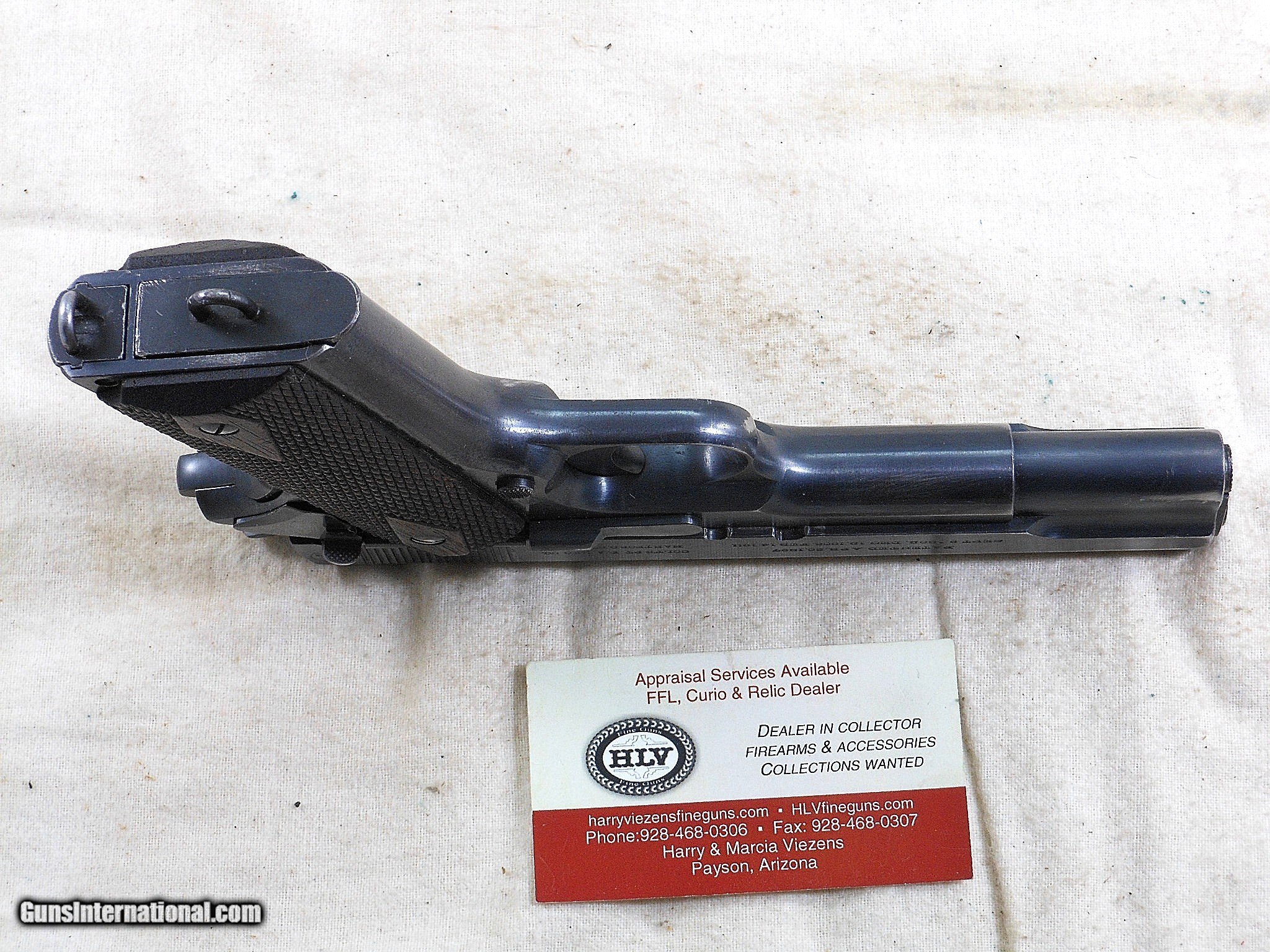 Description: SOLD This Colt was produced in the last run of 1912. The pistol's serial number is 15300. This first year production Colt has the correct barrel with the [ H ] stamped on the barrel upper lip. This 45 A.C.P. barrel is in very good bright condition with sharp lands. There is some sign of light pitting in spots due to the corrosive ammunition used during that time period. This Colt is all correct for the serial number range and time frame. It has the correct early style front and rear sights. The slide has the Colt in a circle above the safety. The original grips are in wonderful condition with only a few areas of checkering point flattening. The original key hole magazine is in very fine condition. The action works correctly with strong springs. The original bluing would rate a 91% or better condition. Most of the loss is on the high points from holster wear. The Original Rock Island Model 1912 Holster is in very fine serviceable condition. This holster is also dated 1912. The leg strap is missing which is common for these holsters. The leather is supple and the original finish is fully intact. This pistol rig is quite stunning and rare. It is not often that a first year Military Colt 1911 comes on the market in this fine of condition with it's matching dated holster! Here is such a pistol rig for the discerning collector! Curio&Relic OSEE - KEE (4) F. No. 667 -23 SOLD Curio/Relic: Yes Handgun Caliber: .45 ACP (.45 Auto) Manufacturer: Colt Model: 1911 Serial Number: 15300 Barrel Length: 5 Inch Chambers: Very Good Condition: 91% Metal Condition: Very Good Wood Condition: Very Fine Bore Condition: Very Good Barrels: Original Colt Barrel Barrel Type: Military Action: Self Loading Finish: Blued Sights: Standard Manufacture Date: 1912 Extras: Holster |