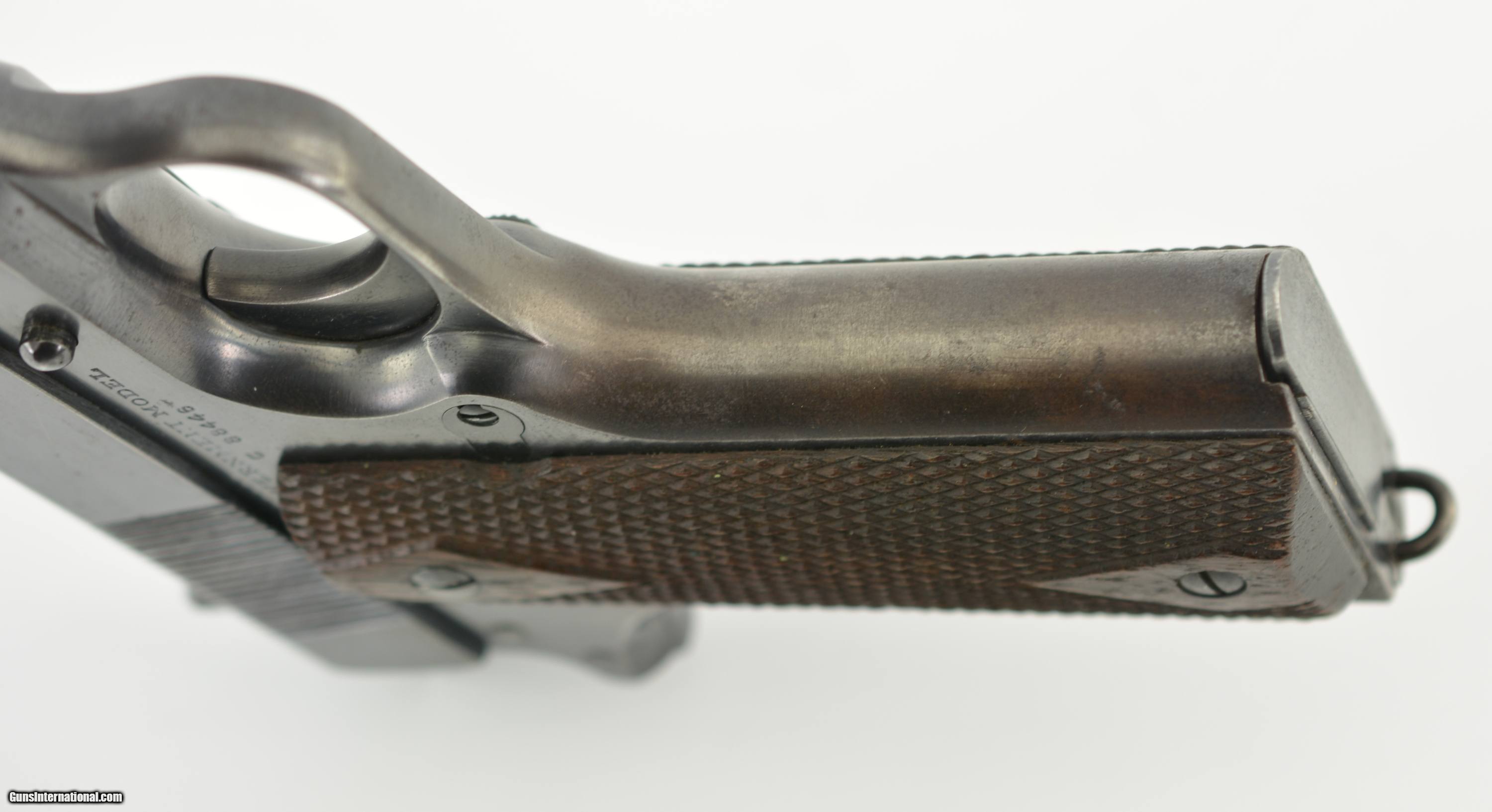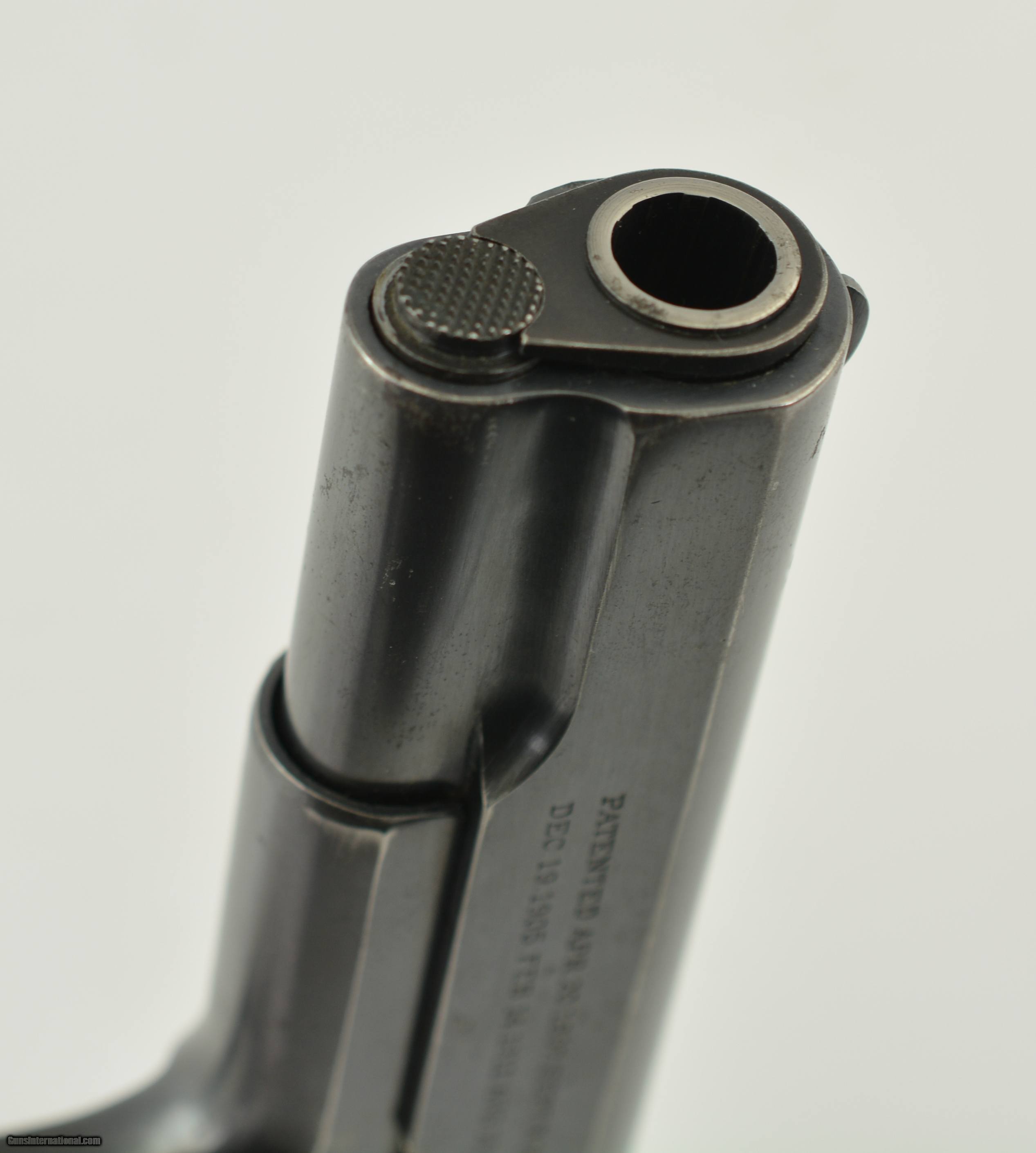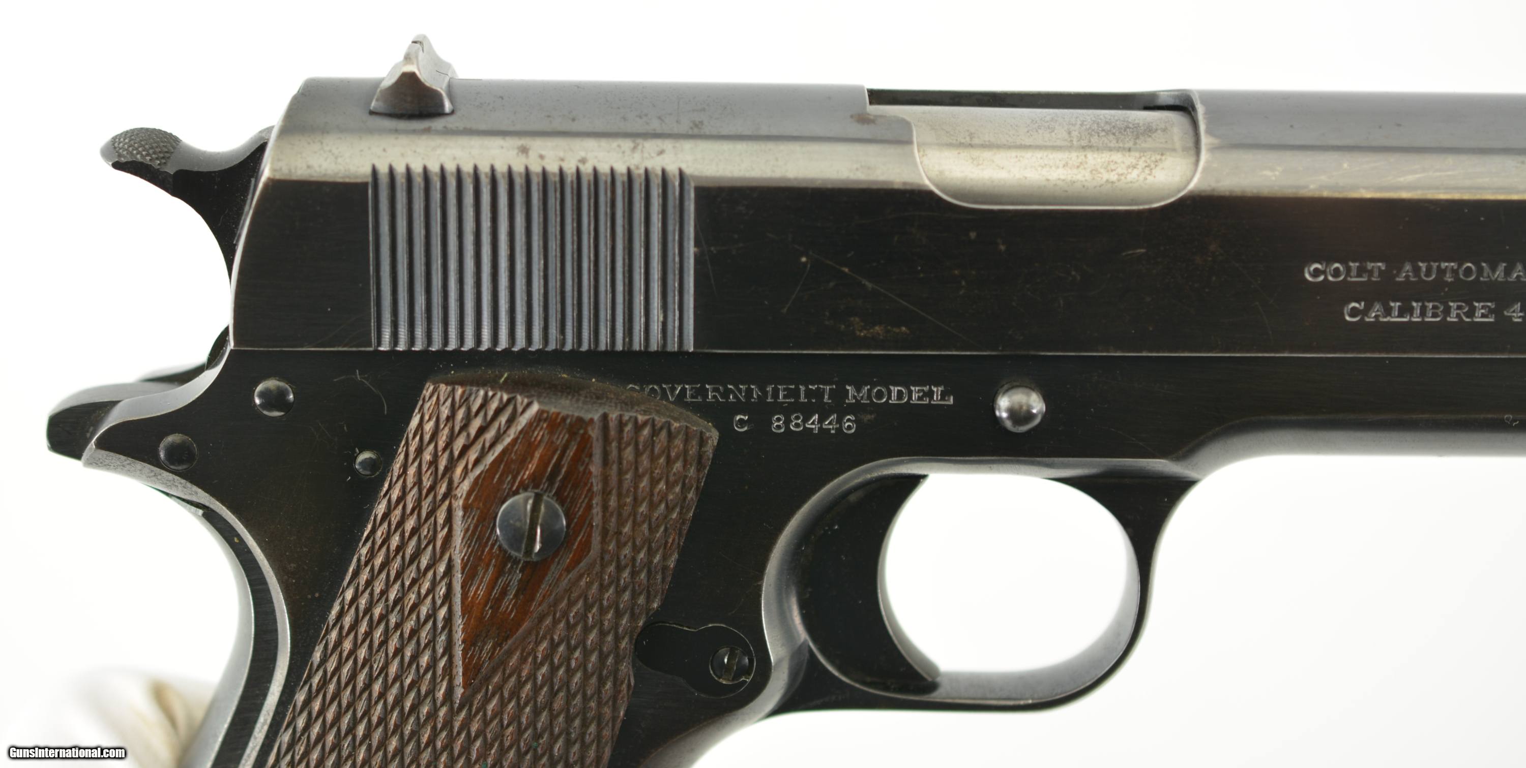Description: Serial #C88446, .45 ACP, 5" barrel with an excellent, bright bore. This is a 1917 manufactured pistol with that has a World War II era barrel, but otherwise has correct component parts and retains 92-95% of the original blue finish which has silvered slightly along the exposed edges and projections. There is some further mild freckling along the flat mainspring housing, a section of grayed metal on the frontstrap, and some mild scratch marks on the left side of the frame around the slide latch. The walnut double-diamond grips are in fine condition and have light wear on either side with some flattening of the points, mostly at the butt, and a few small handling marks here and there. A single WW1 contract, “R" marked, two-tone magazine is included and the pistol rates fine plus condition overall. This is a lovely pistol with lots of original finish remaining, and only needs a correct barrel to be complete and original. FFL or C&R SOLD Curio/Relic: Yes Manufacturer: Colt Model: 1911 Serial Number: C88446 Caliber Info: .45 ACP Gauge Info: .45 ACP |