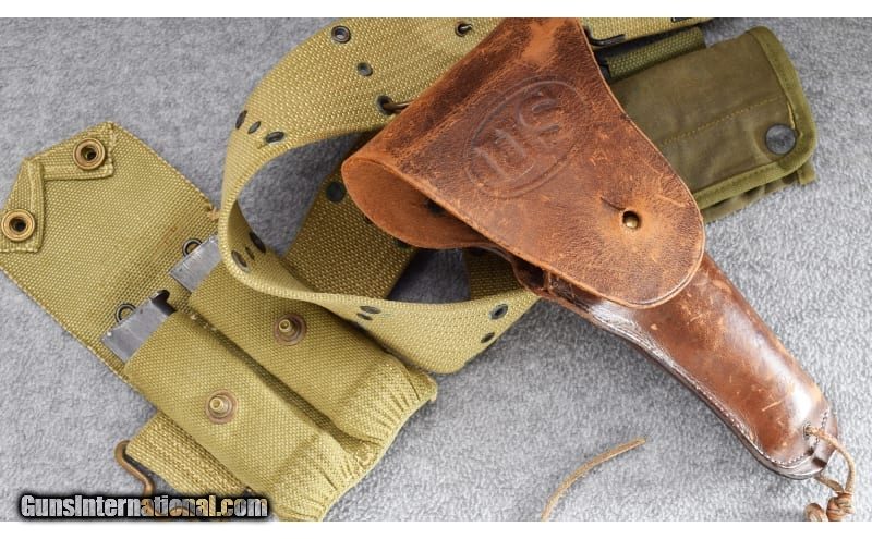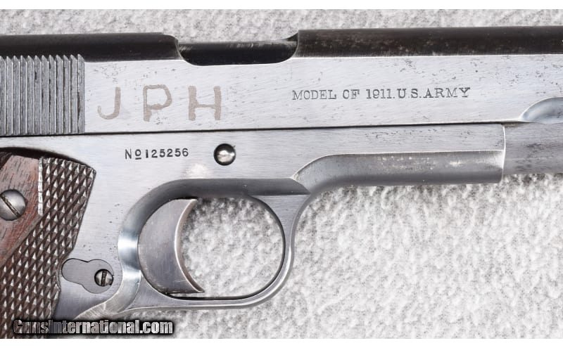 Description: This Colt Model of 1911 U.S. Army was manufactured in 1916. Carried by 2nd Lieutenant J.P. Hargis during WW I at Fort Delesepps in the Canal Zone, (Colon-Limon Bay) Panama this gun remains in very good overall condition. Original blue shows some holster wear with wear on backstrap from sweat and some light oxidation on slide. Right side is engraved "JPH". Left side is stamped "United States Property" on frame and has "GHS" (Gilbert H. Stewart) Acceptance mark on trigger guard. Barrel is stamped "PH". Grips are checkered walnut diamond and remain solid with no cracks and good checkering. Bore is very good with rifling still visible. Gun is complete with "Statement of Ordnance - Stores Purchased" from December 6,1917 that shows original purchase of this gun with serial number and the "U.S." stamped leather holster, plus other items such as canned meat, knife and haversack. Belt also has original first aid kit and magazine carrier with two extra two tone magazines (3 total). All 3 magazines have lanyard ring with a stamped "X" on the rear. Once in a while a gun comes along that makes you wish you could see the history like a movie in your mind. This gun is one of those! .45 ACP SOLD Curio/Relic: Yes Metal Condition: Very Good Wood Condition: Very Good Bore Condition: Very Good Barrels: 5 Triggers: Factory Butt Pad: Checkered Diamond Walnut Grips Weight: 40 oz Sights: Blade Front - Square Notch Rear Item Location: Wheeling |