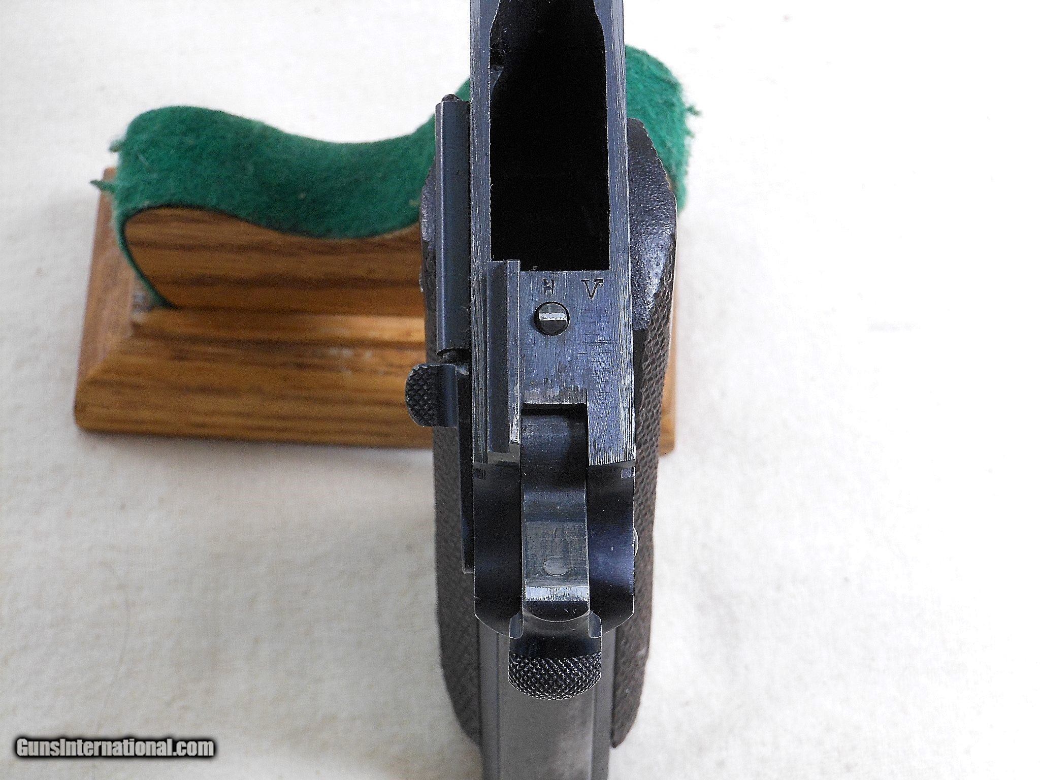 Description: This Colt was produced in 1912. The pistol's serial number is 13938. This is a complete as issued first year production pistol! It has all of the correct parts for that serial number range and production run. The barrel has the correct vertical "H" on the lip edge of the barrel. The bore is very good with sharp lands. The front and rear sight are the correct early style for this pistol. The slide has the Rampant Colt in a circle at the rear by the left side of the slide. The slide also has the vertical "H" above the firing pin retaining plate. The original grips are in very fine condition with sharp checkering. The magazine is the correct "Key Hole" style two tone magazine with the U staple on the floor plate bottom. The slide hold open is the correct early sraight style. The hammer is also correct for this pistol. The original bluing would rate a strong 93% overall condition. At the very front of the left side of the slide there is some light pitting from the holster. The grip area of the pistol retain most of the bluing. This is a very fine original condition early Colt 1911! Most of these early pistols saw hard service and use. Many were lost or run through the various rebuild programs through the years. To find a first year Model 1911 in this fine of complete original condition is a real find! Search for hlvfineguns on google for more details. Curio&Relic (M) KKEE (12) F. No. 478 -19 SOLD Curio/Relic: Yes Manufacturer: Colt Model: 1911 Military Serial Number: 13938 Caliber Info: 45 A.C.P. Chambers: Very Fine Condition: 93% Overall Metal Condition: Very Good To Fine Wood Condition: Very Fine Bore Condition: Very Good Barrels: 5 Inch Barrel Type: Military Action: Self Loading Finish: Blued Manufacture Date: 1912 |