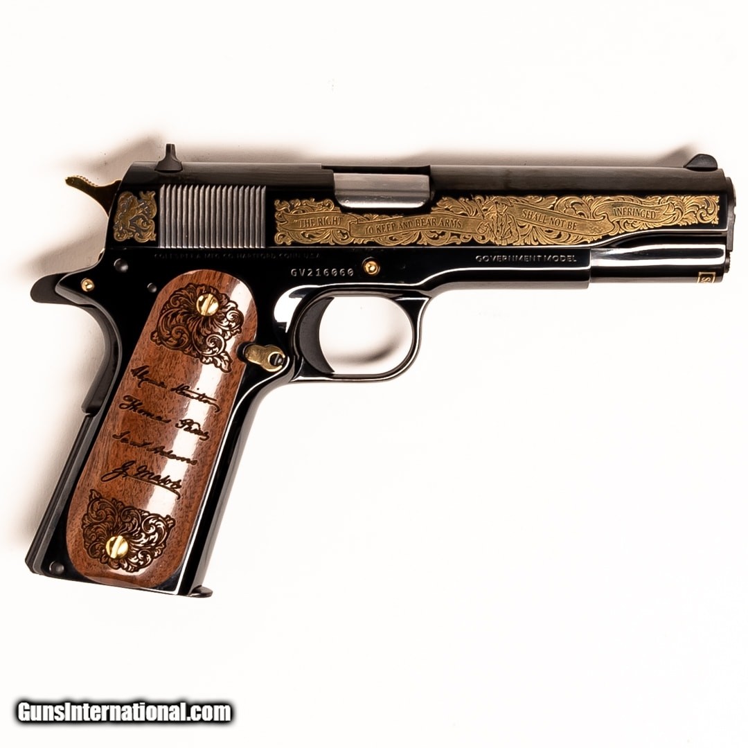 Description: Guns Listing ID: 625178 The Colt Government Model is the evolution of John Browning‚‚s iconic 1911, which was designed over a century ago. This tried and true pistol is a fantastic collector piece, self-defense sidearm, and recreational shooter. This Government Model is a Second Amendment series in excellent condition! It includes the original case, manual, and one 7-round magazine SOLD Manufacturer: COLT Model: MODEL OF 1911C-AR Caliber Info: .45 ACP Condition: Used - Certified Barrels: 5.00 barrel Finish: BLACK AND GOLD |