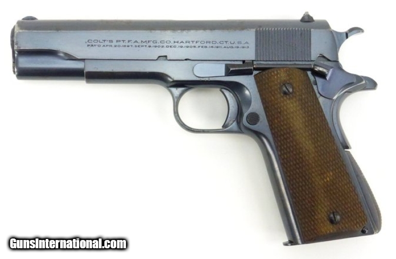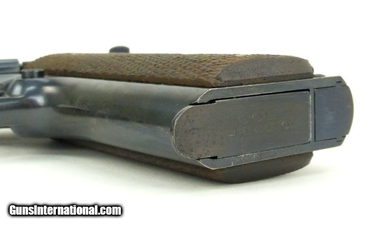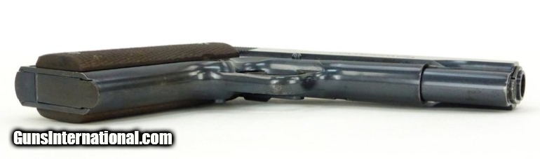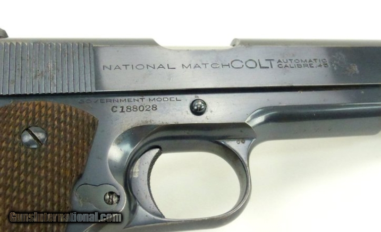 Colt National Match .45 ACP caliber pistol. Manufactured 1938 with matching serial numbers, slide and frame. The bore is excellent. Metal retains 90% original bluing with some surface marking on the top of the slide. 100% correct pre WWII national match pistol with Schwartz safety.