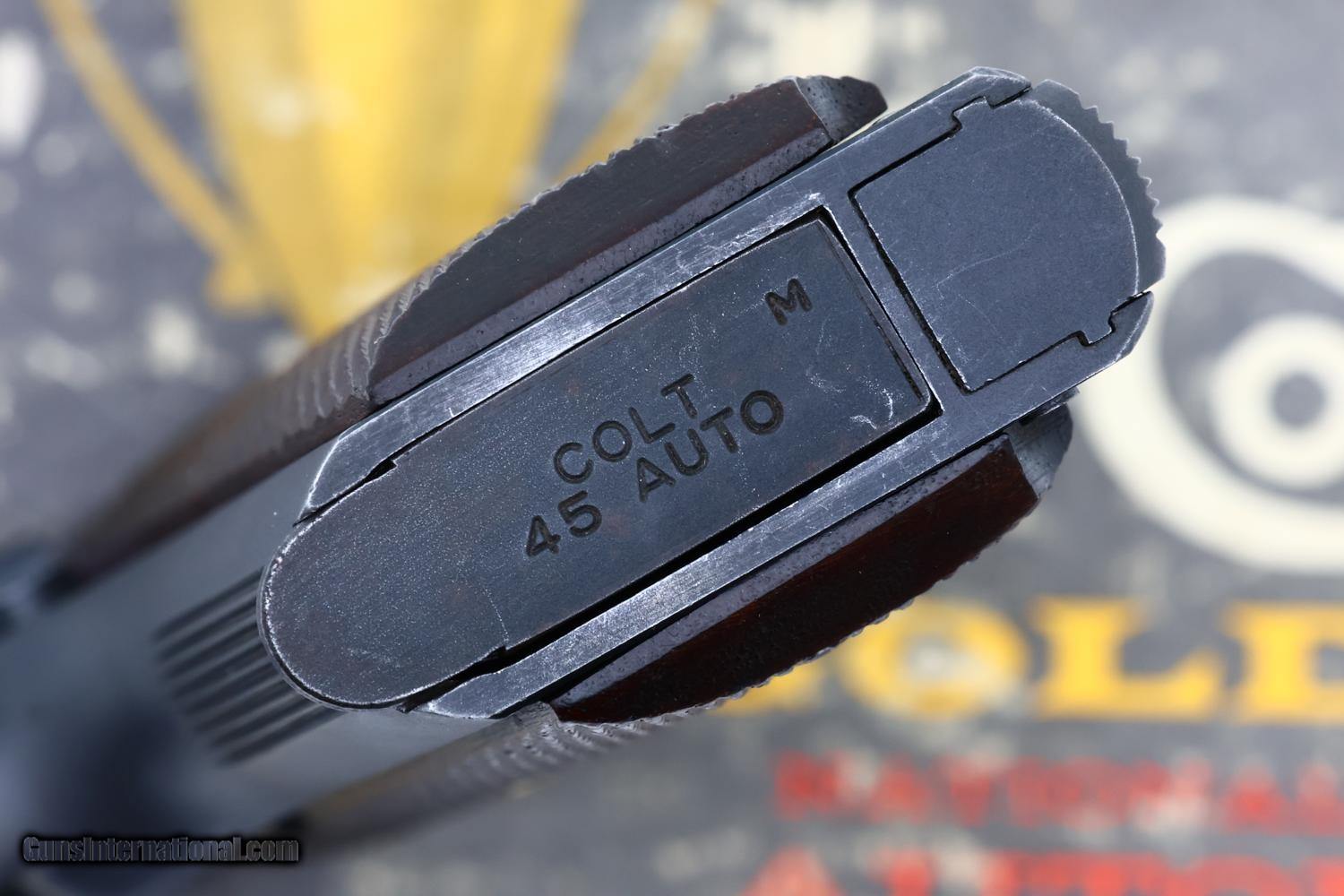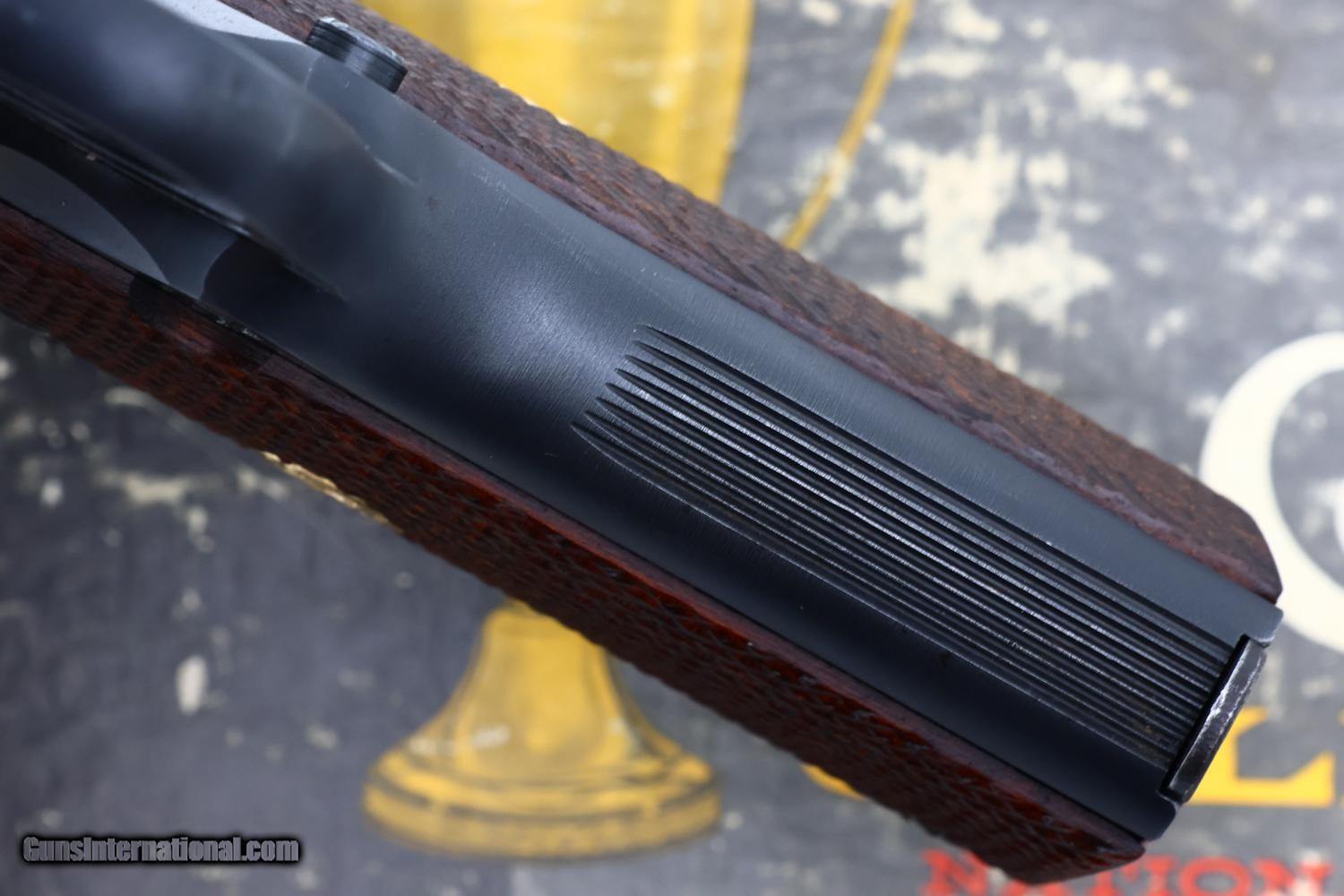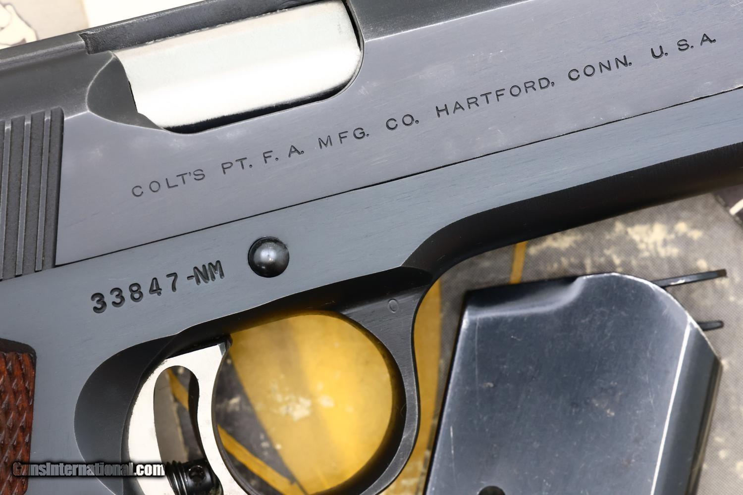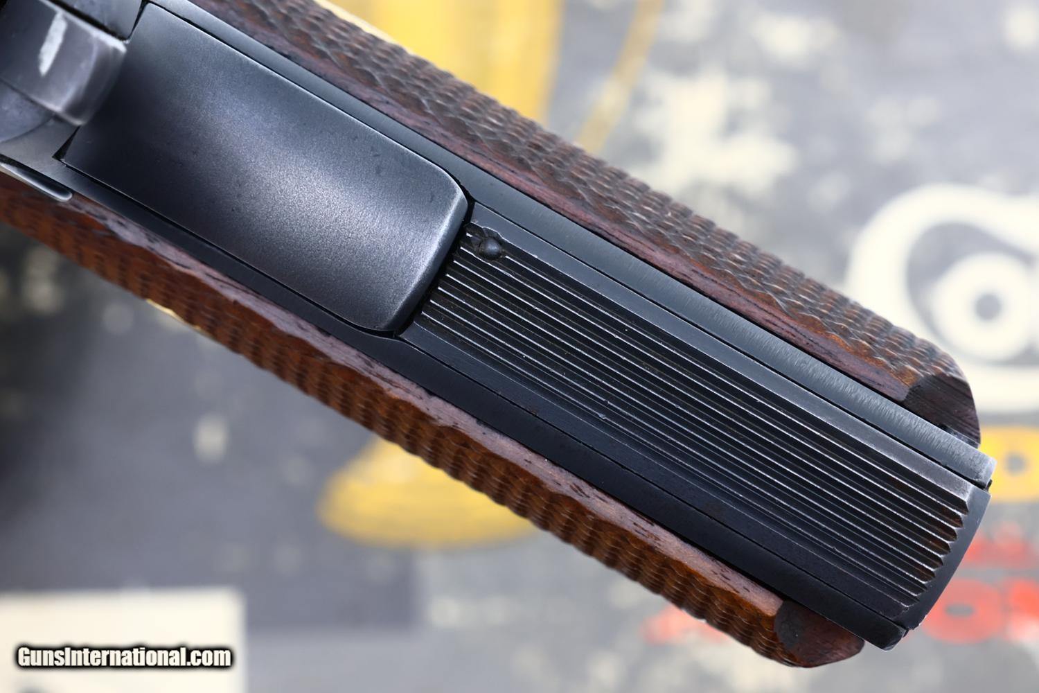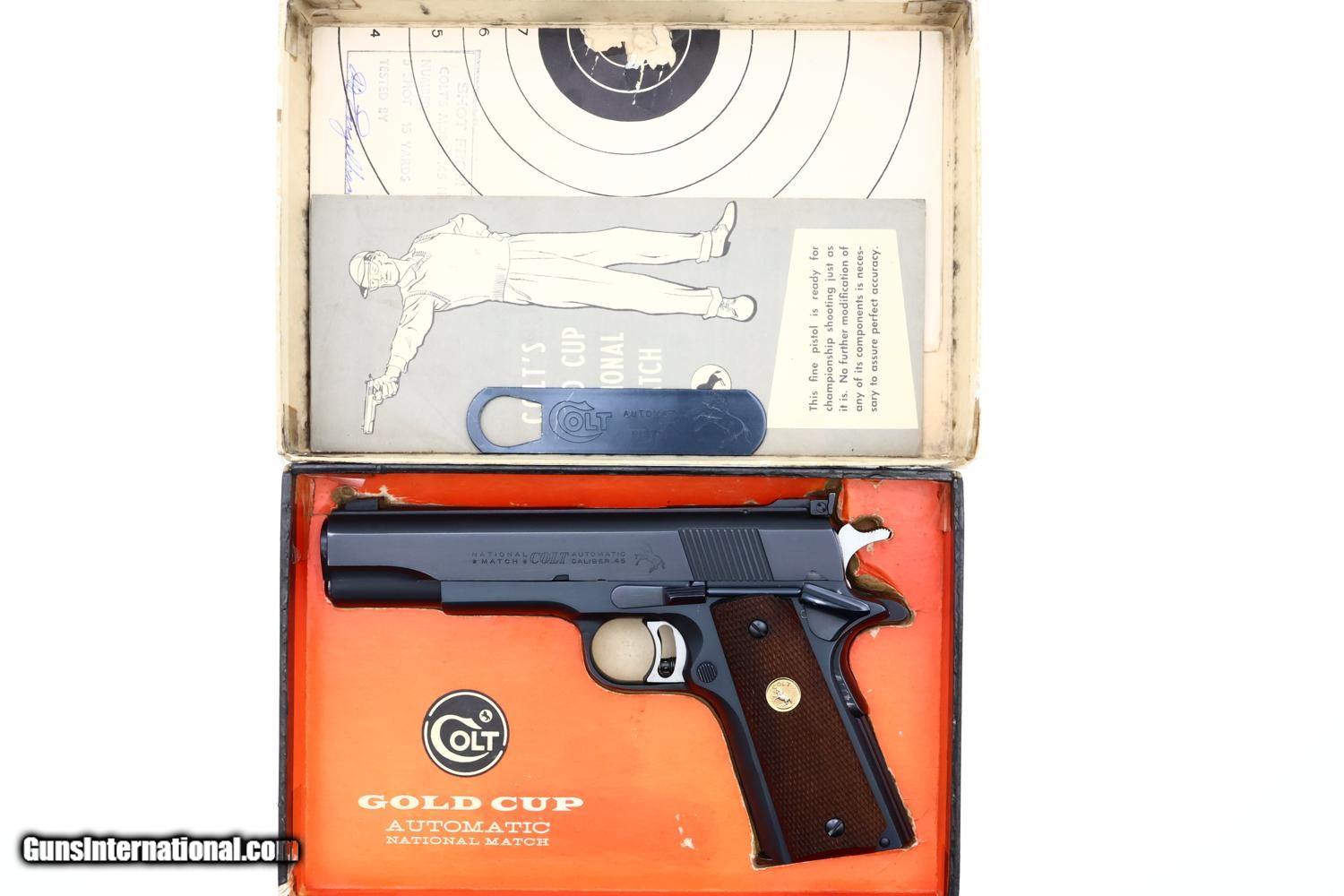 EXC original condition with minute sharp edge, faint box rub marks on right side of the slide, and just the slightest thinning of the straps. Crisp grips with slightly blunted checkering and oil staining. Magazine with light insertional wear. Mirror bore. Correct manual mechanics. Comparable condition literature and bushing wrench. Box with scuffing and and old taped corners/repairs. A high condition Colt Gold Cup from 1969 well suited for the range or your collection.
