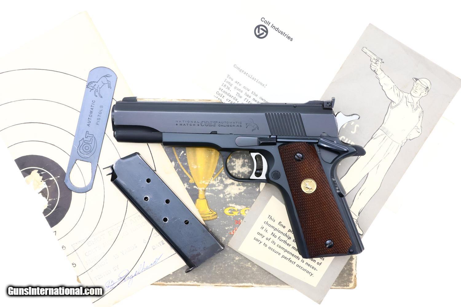 High original condition Colt Gold Cup National Match .45 ACP Pistol, made in 1969, with beveled recoil spring plug and bushing wrench in original box with matching test target and literature.