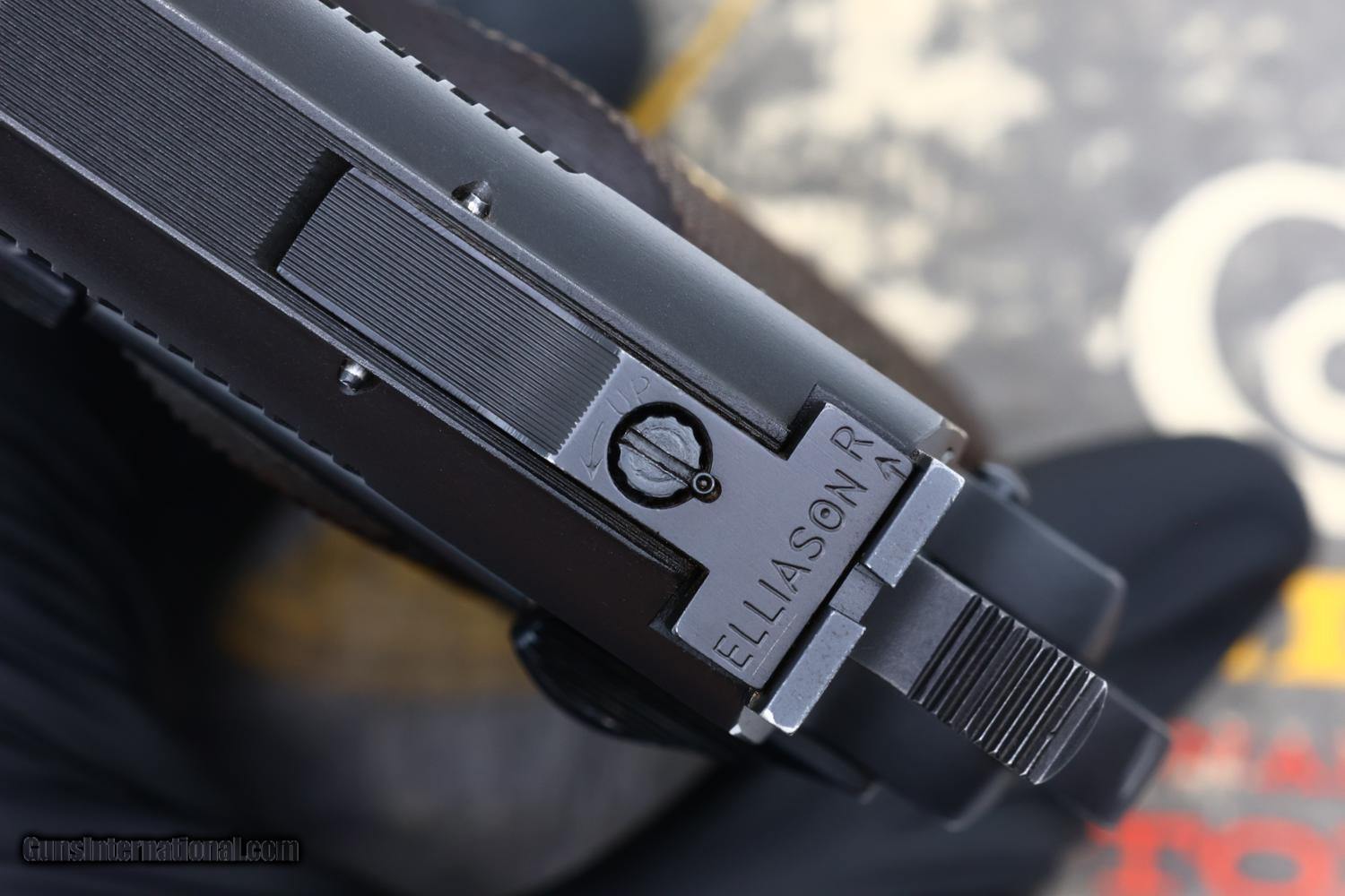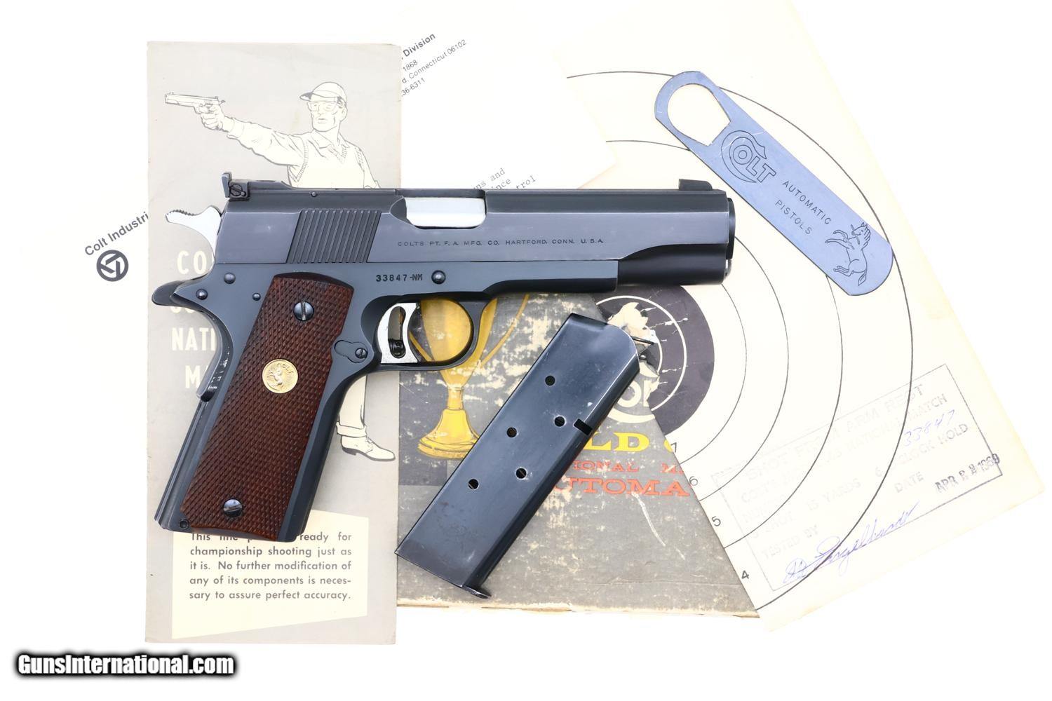 Standard configuration Colt Gold Cup National Match target pistol with patridge front sight and fully adjustable Elliason-marked rear sight. Left side of slide referencing National Match and the caliber. Colt address in Hartford on right side of the slide. Barrel marked “COLT .45 AUTO N.M.” over chamber. SN: 33847-NM on right side of frame. Fitted with checkered walnut grips with gold Colt medallions. Correct full blued factory magazine referencing Colt and caliber on floorplate. Colt marked bushing wrench. Correct factory box. Literature to include: warranty pamphlet and matching test target dated April 22, 1969.