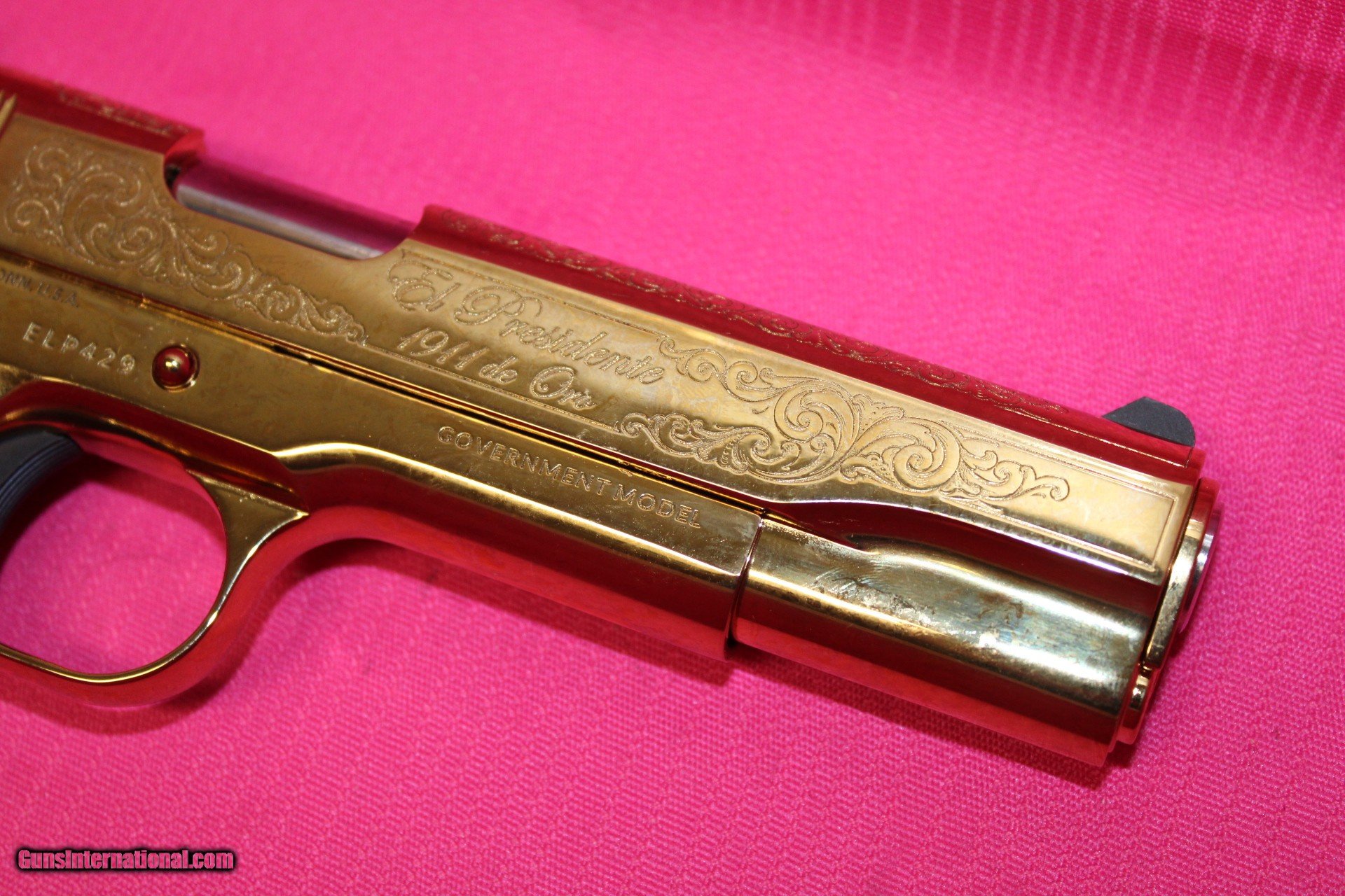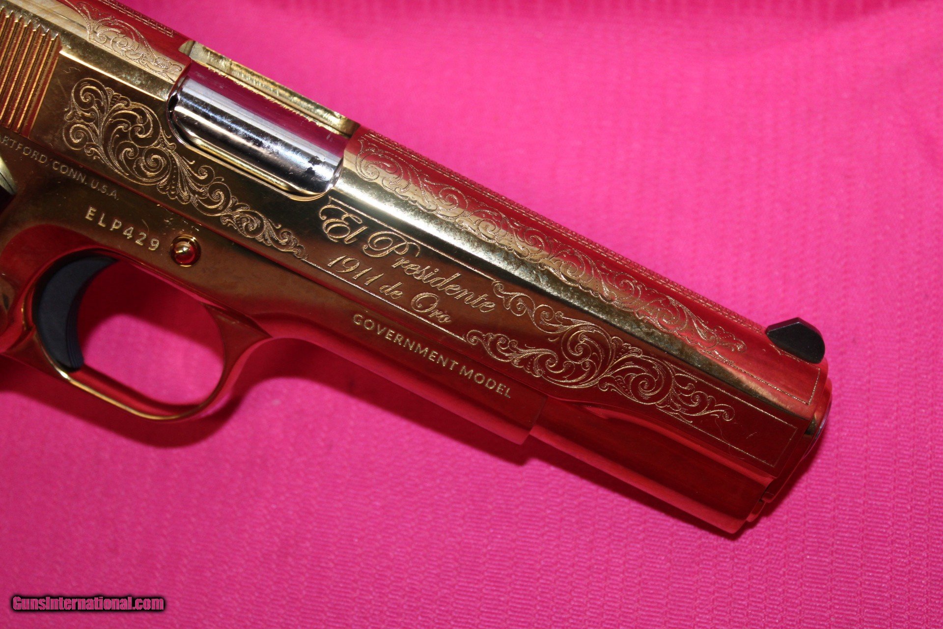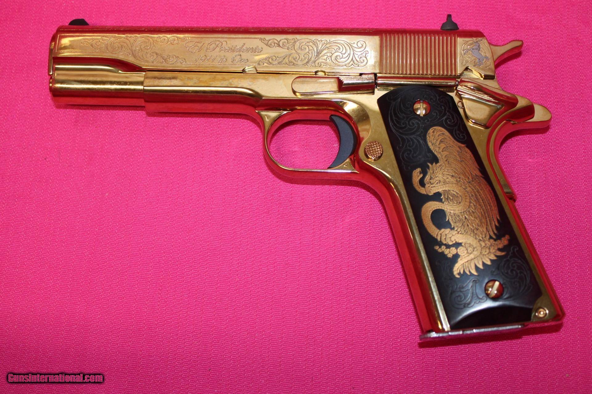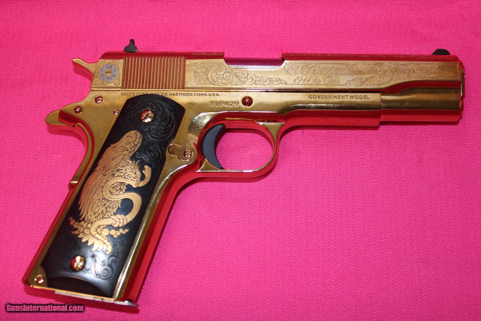 Description: Colt 1911 Presidente De Oro in 38Super with a 5" barrel. 1 of 500 Made this is a Davidsons Exclusive and features a high polished gold titanium nitride finish on the slide and frame, emboldened scroll and lace accents of "El Presidente" over "1911 de Oro; the Colt logo, presidential crest, Rampant Colt, and silver embossed 38 Super casing. 24-carat gold plated Mexican Coat of Arms adorns the custom blued grips. Pistol is brand new with box. *Legendary Guns in Phoenix AZ 602-242-1195 Hours of operation Tuesday-Friday 10-6 Sat 10-5 Closed Sundays & Mondays *We accept all Major credit cards. We DO NOT charge an additional fee for Credit Cards. We also accept Postal Money orders or Certified Bank Checks{Check & Money order payments must arrive within 7 days of initial agreement and will be held for 3 days before items are shipped} *Shipping is $50 for rifles/shotguns {AK & HI Extra} and $35 for handguns. Arizona Residents Must Pay Sales Tax. We DO NOT ship Internationally. *We offer a 60 day layaway on purchases of $500 or more. Items require 1/3 of the total price as down payment which is NON-REFUNDABLE and you have 60 days to pay off the balance. *Please call or email with any questions and to confirm availability before buying. We are happy to answer all questions. All items listed are also for sale at our Phoenix, AZ location *We offer a 3 day inspection period on USED FIREARMS ONLY, We accept returns within the 3 day inspection period with NO REFUNDS ON SHIPPING CHARGES and a 10% restocking fee. *Trades are welcome for customers who can visit our Phoenix, AZ location, We DO NOT engage in online or mail in trades. SOLD Handgun Caliber: .38 Super Auto Manufacturer: Colt Model: 1911 Condition: New |