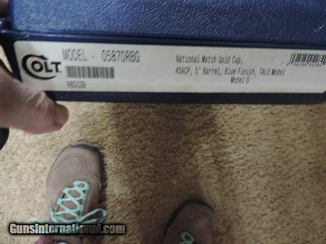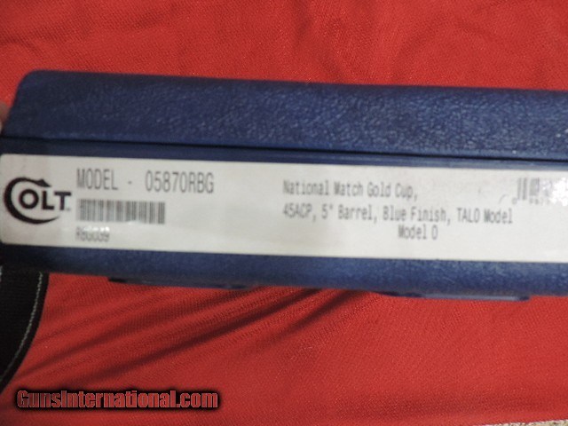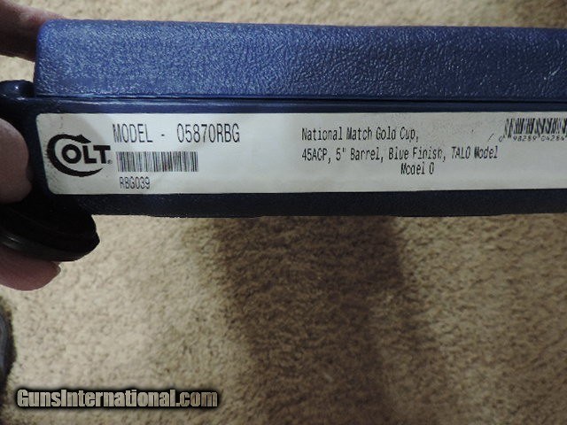 Description: COLT O5870RBG ROYAL NATIONAL MATCH TALO 45 ACP ONE OF 250. RARE #39 OF 250. ROYAL BLUE NATIONAL MATCH POLISHED SLIDE WITH PRECISE RETRO ROLL MARK. FANCY WALNUT CHECKERED GRIPS FEATURING COLT INLAID GOLD RAMPANT HORSE & BLUE HEX SCREWS. TWO MAGS - 8+1. NEW IN BLUE COLT HARDCASE. SUBJECT TO PRIOR STORE SALE. SHIP TO FFL ONLY. BUYER RESPONSIBLE TO DETERMINE IF FIREARM IS LEGAL IN HIS/HER STATE. BUYER PAYS 3% FOR CREDIT CARD. BUYER PAYS $40.00 SHIPPING TO LOWER 48 STATES. ARIZONA RESIDENTS PAY 6.712% SALES TAX. SOLD Handgun Caliber: .45 ACP (.45 Auto) Manufacturer: COLT Model: O5870RBG Serial Number: RBG039 Condition: New in Box |