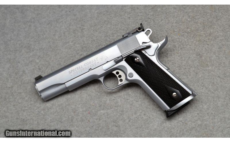 Description: Colt Special Combat chambered in .45 ACP. SOLD Caliber Info: .45 ACP Metal Condition: Excellent Wood Condition: Excellent Bore Condition: Bright Barrels: 5 Stock: Checkered wood grips Weight: 2lbs 9ozs Sights: Notch and blade sight with adjustable rear Extras: Comes with a case. Item Location: Fort Worth, TX |