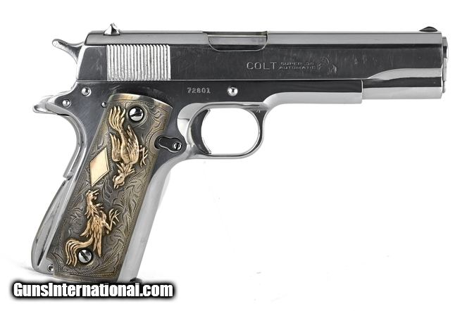 Colt Super 38 .38 Super caliber pistol. Post-War model made in 1948 with desirable fat barrel. Has been chrome plated, looks good. Bore is excellent. Has a beautiful old aged silver and gold Mexican Grips.