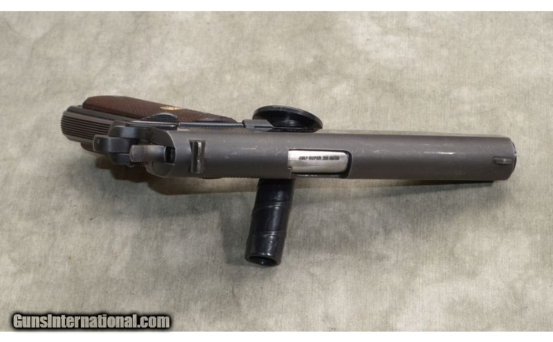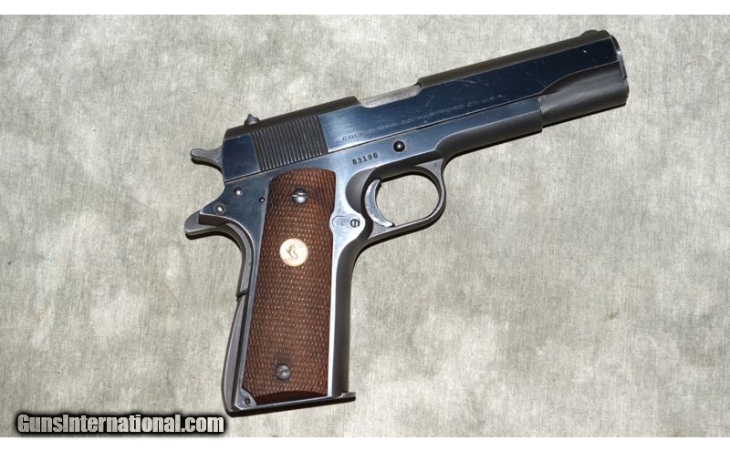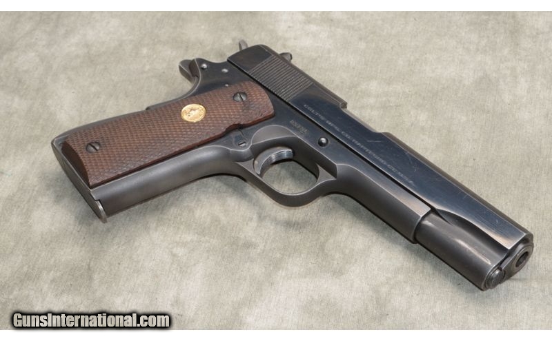 Description: This 1911 type pistol features classic lines, low profile post and notch sights, walnut grips with Colt medallion and sharp engraving. SOLD Chambers: 9 + 1 capacity semi-automatic. Metal Condition: Good to very good. It has a number of scratches, all of them fairly fine, and the blue has faded on the front strap and high points but is very nice on the flat surfaces and protected areas. Wood Condition: Very good to excellent. All checkering is good. Barrels: 5 Inch barrel. Triggers: Factory rigger for single action. Sights: Low profile post and notch sights. Item Location: Rogers, MN |