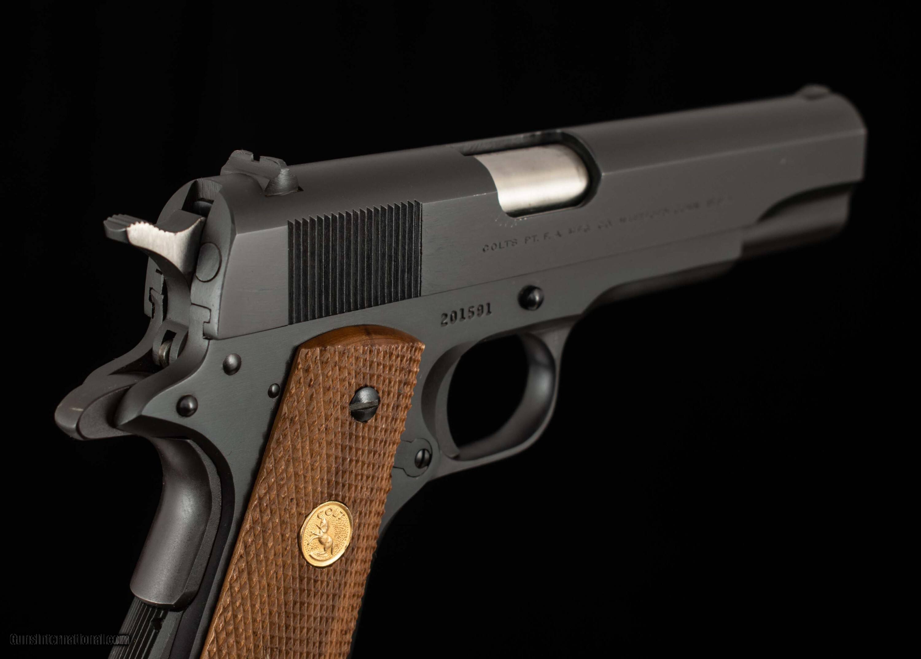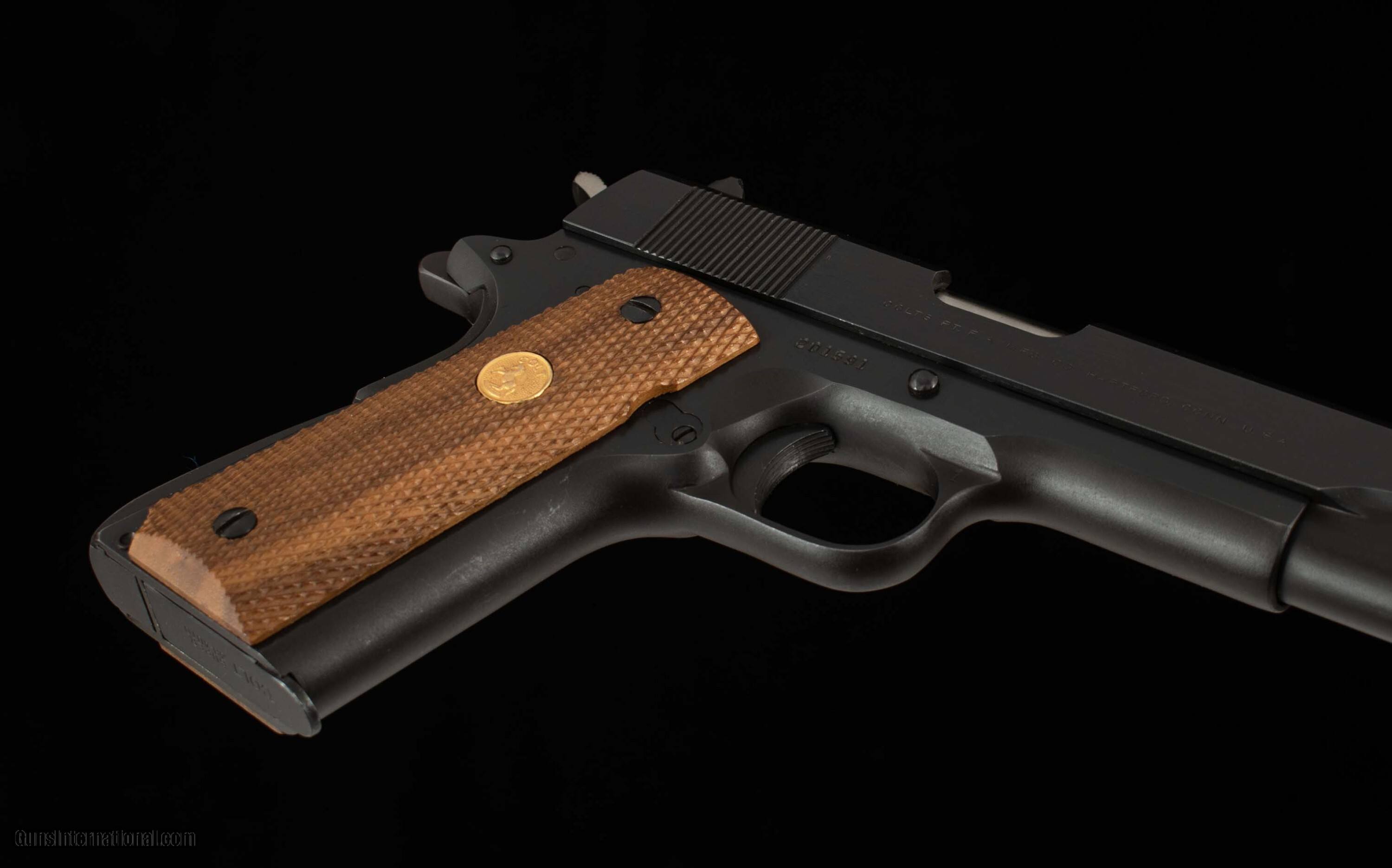 Description: General Specs: Colt, 1968, .38 Super, 39oz, 5" Serial Number: 201591 Vintage Firearms is pleased to offer one of the most iconic pistols ever developed. Used by gangsters, soldiers, and law enforcement alike, adopted by dozens of countries, and is still widely manufactured and copied to this day. This 1911, manufactured in 1968, is chambered in .38 Super. This round was originally designed by Colt to combat organized crime in 1929, and ironically, became a favorite of the criminals it was meant to fight! The .38 Super is a well-balanced cartridge with a flat trajectory, good accuracy, and delivers high muzzle velocity relative to other interwar cartridges. This Colt Super is in 99% overall condition, with the receiver, barrel, and trigger guard all displaying 99% original finishes and a mirror bore. At some point in its history someone decided to upgrade its grips, swapping out the factory plastic grips for walnut grips with a Colt medallion. Through its many decades of ownership, its collected a few handling marks but is still in wonderful overall condition. Included with this Colt is its original box and three 9 round Colt magazines, giving you a great leg up as Colt mags can run you a pretty penny. With this package you’ll has everything needed to get started, just add the ammo! Please note, Vintage Firearms does have boxes of .38 super in stock, contact us for availability, ammo ships separately and will incur its own shipping cost. A great choice for those in the “know” or those who just want to add an interesting Colt 1911 to their collection. We at Vintage Firearms invite you to have a look at the detailed specifications and pictures below. Thanks for looking! Barrels Barrel Length: 5" Bores: mirror % Blue: 99% factory case color Sights: front blade, rear U notch Action Action: semi-auto Receiver Condition: 99% Screws: superb Trigger Type: single-crisp Trigger Guard Color: 99% Stock Type: pistol grip Checkering Condition: superb Inquiries Call or email us with questions. Thanks! Vintage Firearms Payment and Shipping Ways to Pay: Credit Card, Money Order, Certified Check, Personal Check, Wire Transfer (Advertised price reflects 3.5% cash discount. Actual price if paid by credit card is 3.5% higher.) Inspection Period / Return Policy: Three Days from the date the item was received. Sales Tax Collected: FL, MI Shipping & Insurance: Ground $115.00 within continental U.S. Additional fees for HI & AK. Item Condition: Used Requires FFL?: Yes. C&R licenses accepted for shipping C&R eligible guns Other Terms of Purchase: Check your local and state laws before purchasing. It is the buyer’s responsibility to confirm his/her right to own the firearm or any item before purchasing. PLEASE SEE OUR OTHER FINE VINTAGE FIREARMS. View all listings and our full inventory of fine sporting and collectible arms will appear. Thanks for looking!We employ full time gunsmiths on premises and can perform alterations to suit your needs within a few weeks of purchase. Handgun Caliber: .38 Super Auto Price: $4,795.00 Contact Seller |