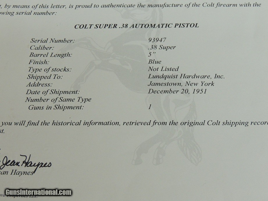 Description: Colt Super 38 c.1951, mint bore, 98% Blue, shipped 1951 Curio & Relic Eligible $5500 Helpful Information: *Please make sure to include our inventory number and or Item description in text messages * If this item has the Box, Papers or various extra items they will be pictured and described, This item listing is in stock and available for purchase unless the Sale Pending Tag is present.* No sales to California *Payment Options *Postal Money Order* Cashiers Checks *Personal Checks (Item held until Check Cleared* Layaway 120 days*No Interest*Pay any way, any time you like over the term *Deposit required *Credit Cards Visa or Master Card 3.5% fee added to total sale* GA residents 7% sales Tax Applies *Best Phone Number for Calls or Text 229-424-8450* Shipping & Insurance $ Our 26th year full time in the business, We started listing with GunsInternational since the beginning 03/20/2007 SOLD Curio/Relic: Yes |