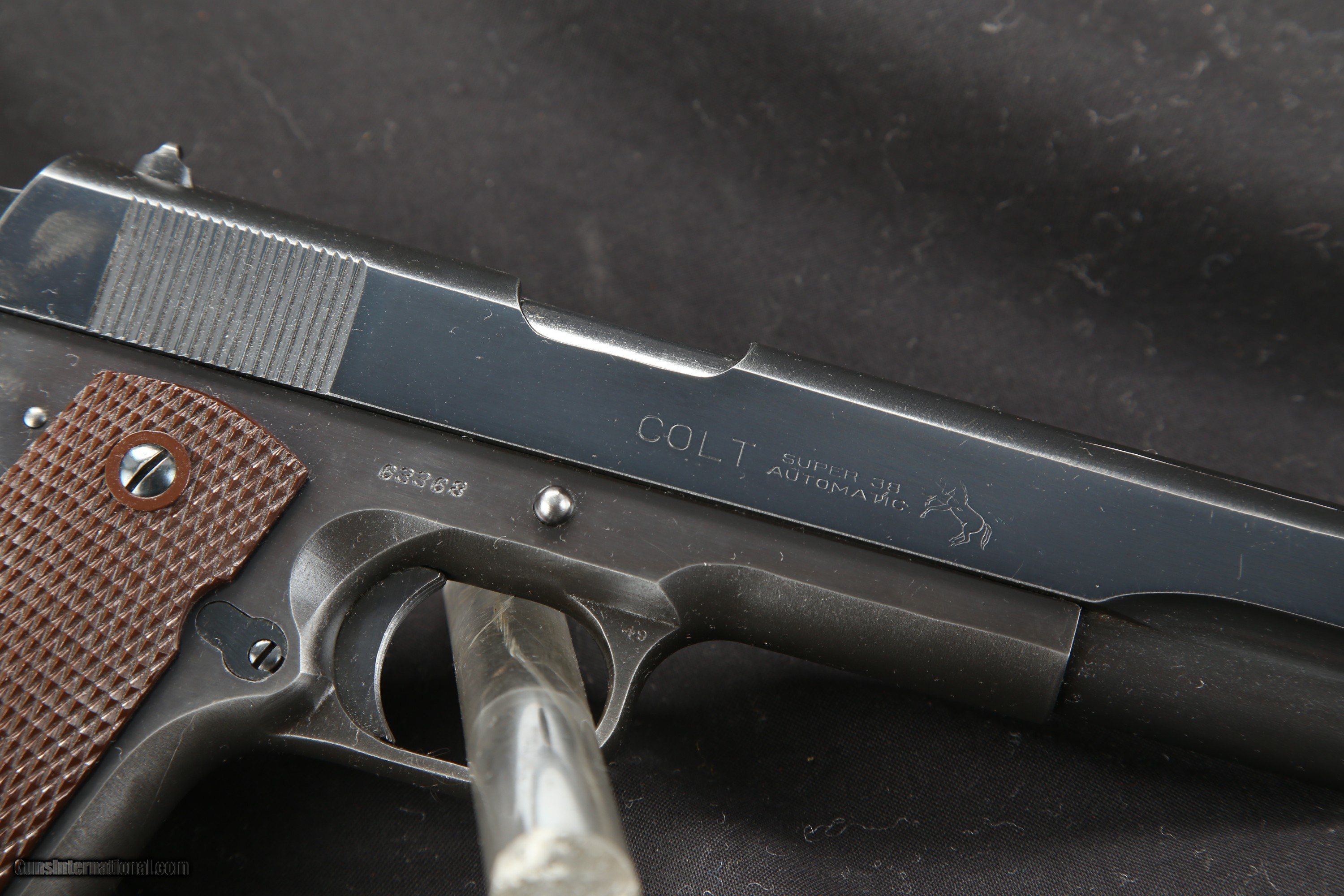 Description: Early post war Super 38, during the short time that Colt still had the "Colt super 38 automatic" and pony stamped on the right side of the slide, and during the time where they were using up the unissued WW2 military grips. A harder to find variation of the ever-more-collectible Super 38s SOLD Handgun Caliber: .38 Super Auto Manufacturer: Colt Model: Super 38 Serial Number: 63368 Caliber Info: 38 Super |