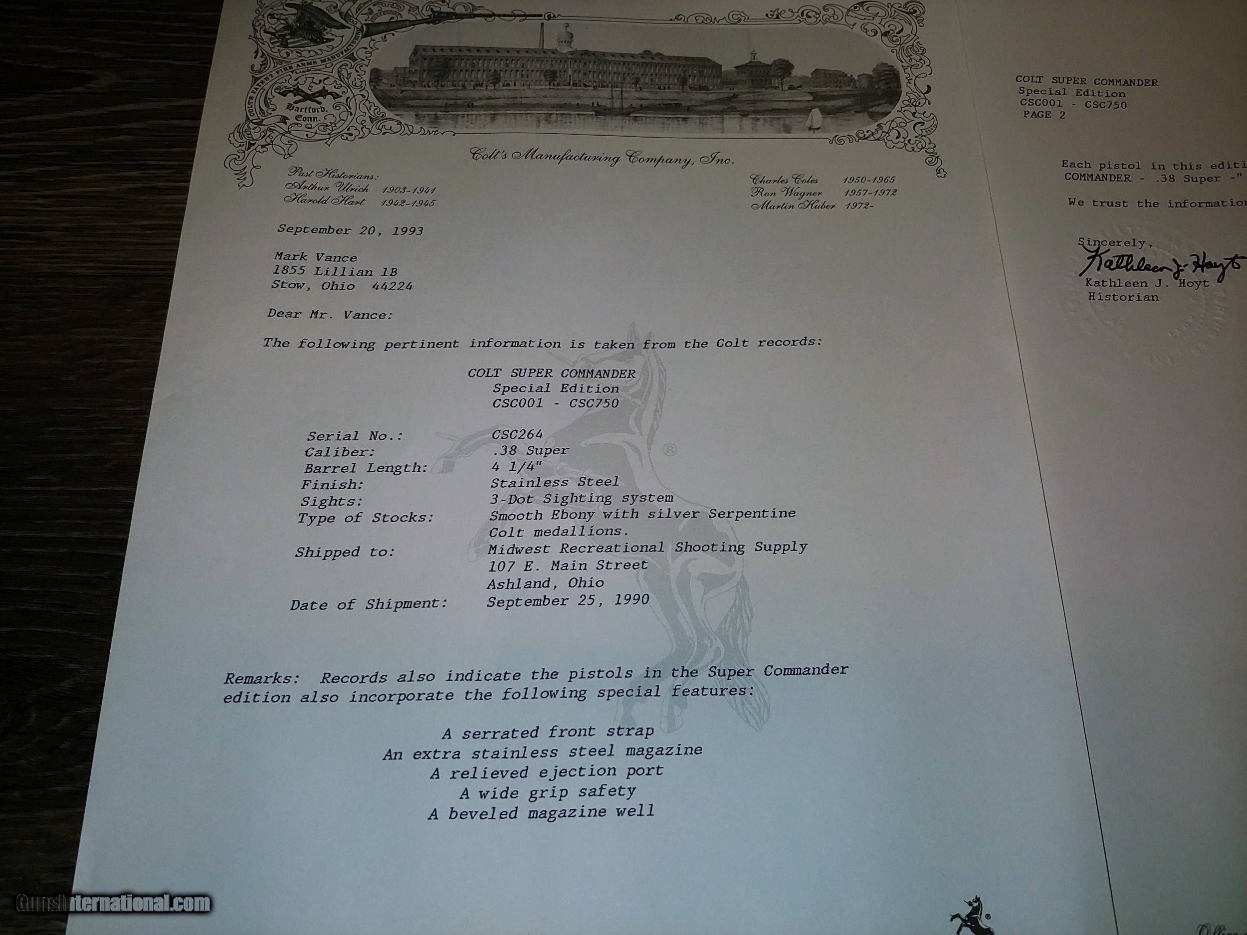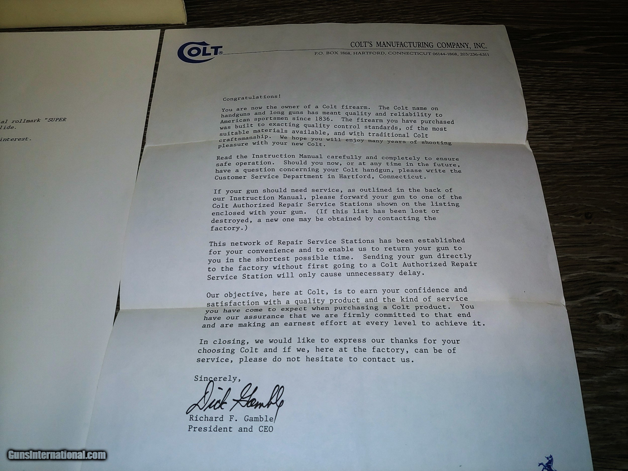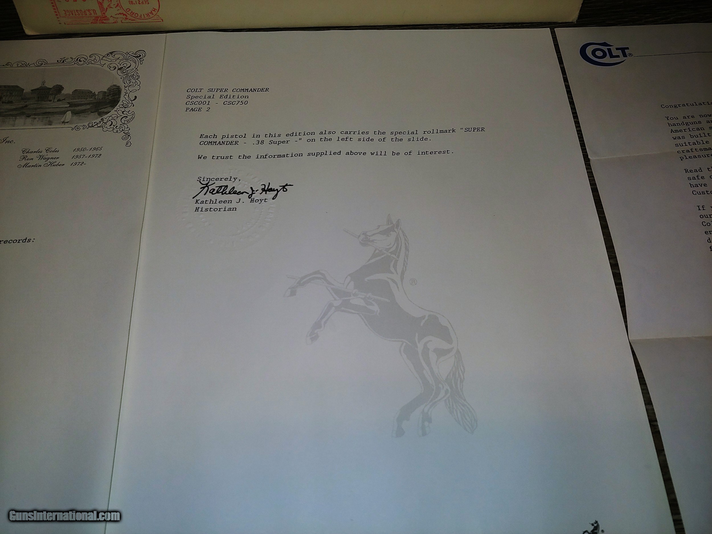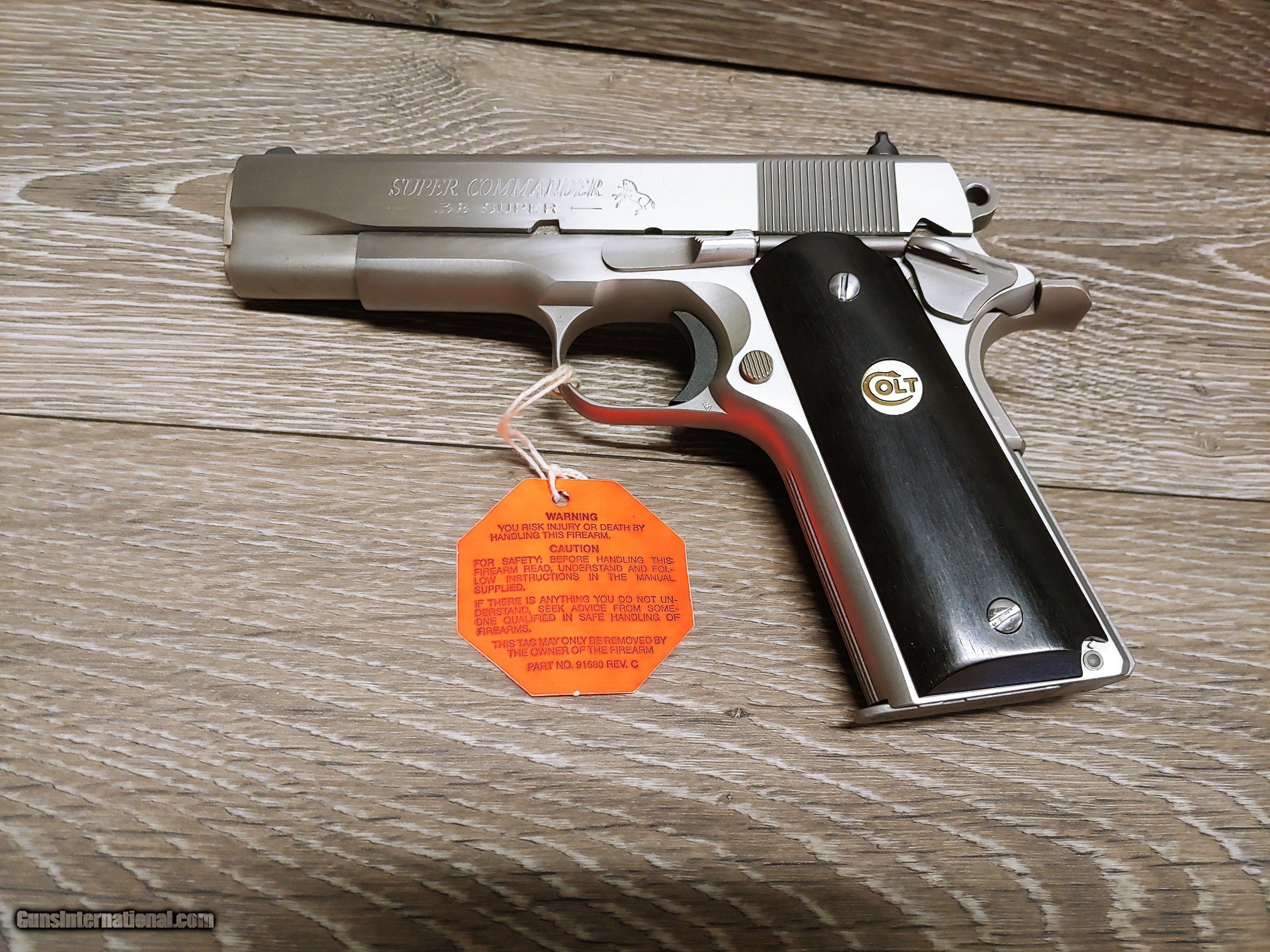 Description: Colt Super Commander, Special Edition series 80 MK IV in 38 super. This gun shows no sign of usage, like new condition throughout. Includes Colt factory letter detailing original shipment on September 25, 1990. Beautiful stainless steel pistol, 4.25” barrel, fitted with factory smooth ebony wood grips with silver serpentine Colt medallions. Has 3 dot sights. Comes with correct factory box, paperwork and 2 magazines.********** No shipping to California, International, Canada or any other US state that has restrictions on firearm purchases. We collect 9.25% sales tax on all purchases in state of Tennessee. Credit card fee for all purchases is 3% if used instead of Cash, USPS money orders, bank wire transfers, personal check. SOLD Handgun Caliber: .38 Super Auto Manufacturer: Colt Model: Super Commander Serial Number: CSC264 Barrel Length: 4.25 Condition: Like New Metal Condition: Like New Wood Condition: Like New Bore Condition: Like New |
