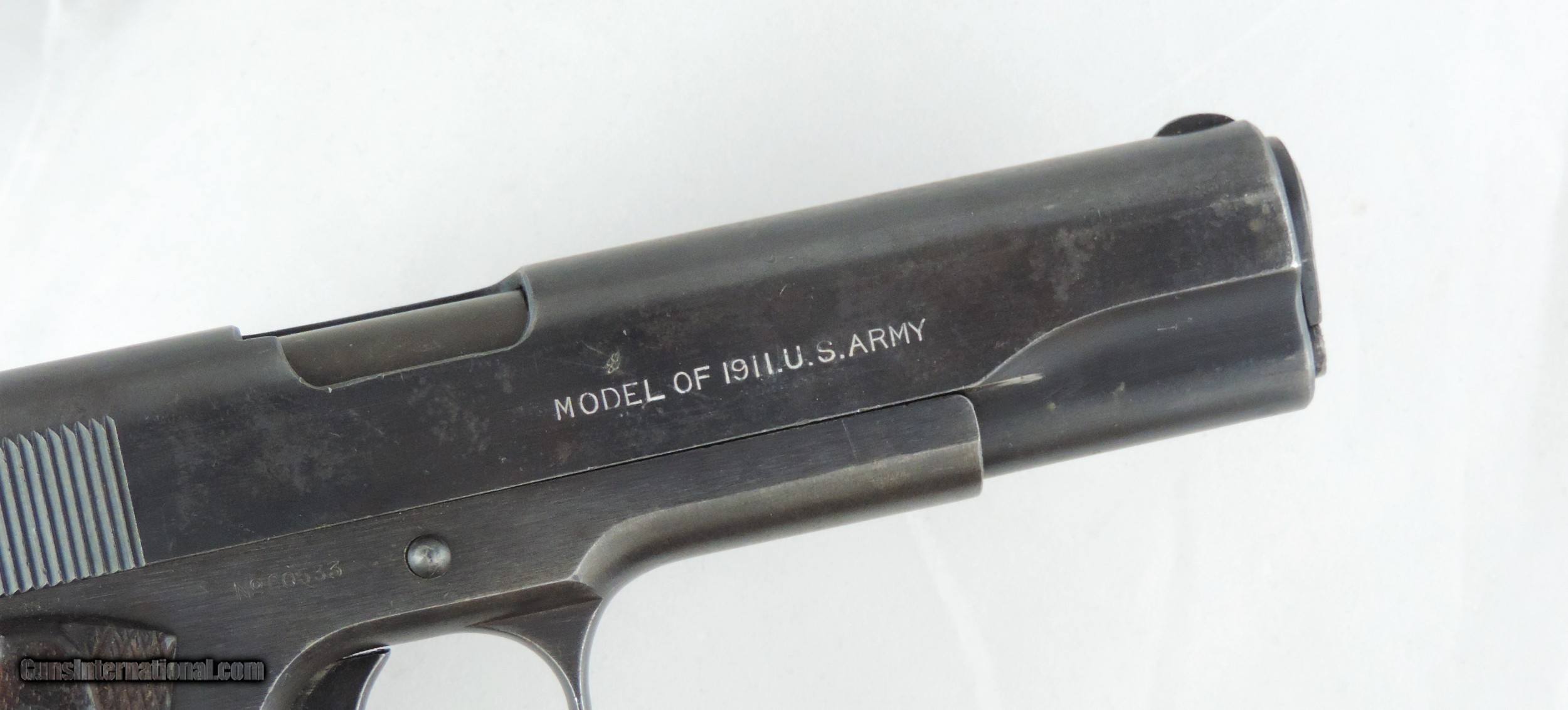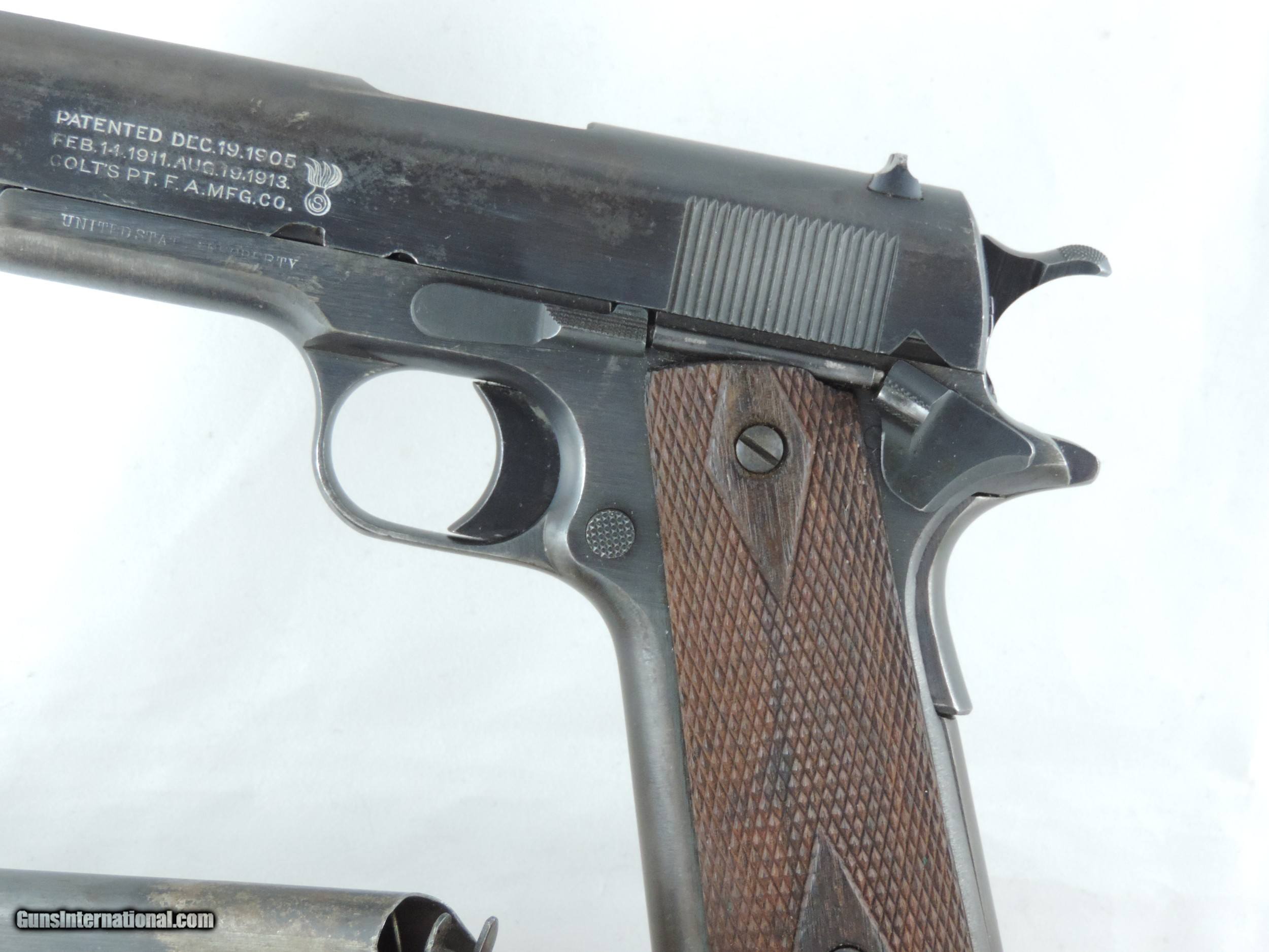 Description: INV. 7667 COLT U.S. 1911, CAL, .45 ACP, SER. 60533 with RARE A.J. Savage Munitions CO. SAN DIEGO, CA. Slide. This is an arsenal rebuild done around 1920. It is fitted with a Savage slide. At the late stages of World War I A.J. Savage obtained a contract for the 1911 to be made on Springfield equipment. Before delivering any completed firearms, the order was canceled. However, small quantities of newly manufactured slides were sent to the Springfield Arsenal. These slides were later used in the 1920s for rebuilding World War I 1911 frames. Occasionally these rebuild slides appear on Colt Frames. This example is in super condition, retaining about 95% of the original arsenal blue on the frame and original Savage blue on the slide. The little loss there is, is from minor flaking and very slight sharp silvering. The grip straps have toned slightly. All parts are correct for the 1911, the barrel is a correct Springfield. It has the original Cold double diamond World War I grips, which are almost perfect. There is a slight nick on the left panel. The grip screws are fine. The slide rails, bolt face and feed ramp show very little if any use. The bore is mirror bright with razor sharp rifling. Here is an opportunity for a serious investor/collector to get a rare 1911 variant at modest price..... Shipped..... $2295*** *** Comes with our “Purchase Satisfaction Guarantee”. To purchase this firearm or if you want to request more information contact us at: Email ckguns[at]ymail[dot]com Phone 201-512-0002 Cell 201-575-6838 FAX 201-215-4759 We accept most major credit cards. Prices shown are Discounted 3% for Cash or Check. The buyer must be familiar with all the laws governing the purchase and the ownership of firearms in their own city and state. The Yankee Armorer, Inc is not responsible for any failure to comply with or observe these laws. The Yankee Armorer, Inc will only ship after full payment and receipt of all required documents. Shipping: Add $35.00 for handguns, $45.00 for long guns. New Jersey buyers are subject to a 7% sales tax. The Yankee Armorer, Inc offers a 3 day inspection period with full refund upon return of intact firearm and in the original condition. The Yankee Armorer, Inc offers a no interest lay away program - 25% down; 25% in 30 days; 25% in 60 days; and full payment in 90 days. Any violation of this policy is subject to restocking and forfeiture of all payments. Any variation from this policy must be agreed to in advance. Unshipped Cancelled sales are subject to a 20% restocking fee. Be advised that all firearms sold by The Yankee Armorer, Inc. or the Gun Exchange, LLC (SELLER) are sold as collector’s items. They have not been fired or tested for safety and must be examined by a license gunsmith prior to use. By purchasing any item from the (SELLER), you are agreeing to hold the (SELLER) free from any damages or lawsuits of any nature. Any item left for transfer or storage will be charged to $25.00 per month, per item from the day of its receipt. Any variation from this policy must be agreed to in advance. Store hours 10:00 am to 5:00 pm Tuesday -Saturday. It's always best to call for appointment. Store 201-512-0002, cell 201-575-6838. SOLD Curio/Relic: Yes Manufacturer: Colt Model: 1911 Serial Number: 60533 Caliber Info: .45 acp Condition: 95% |