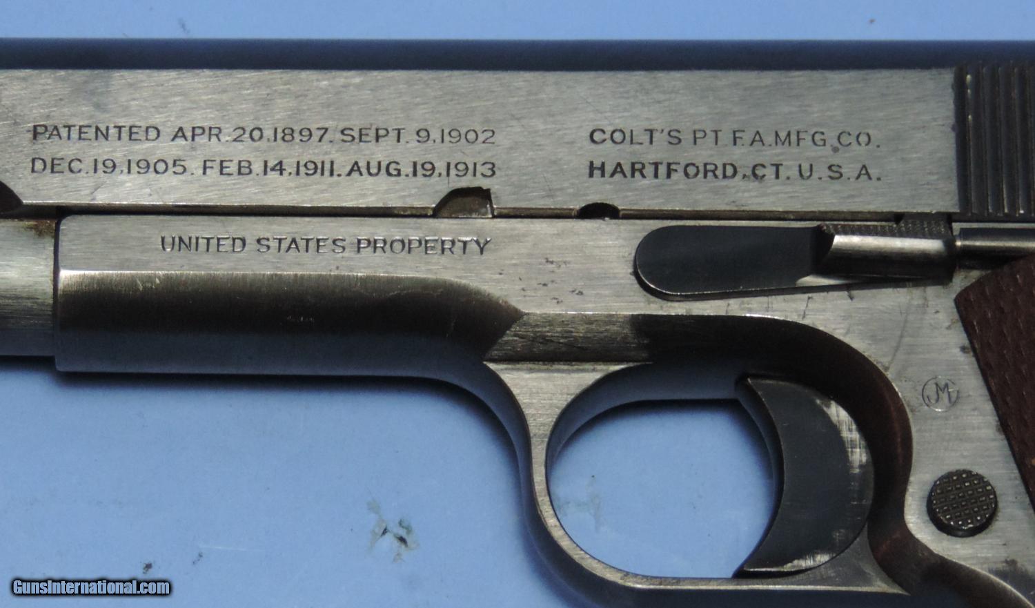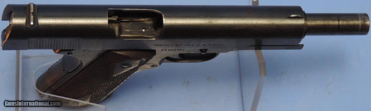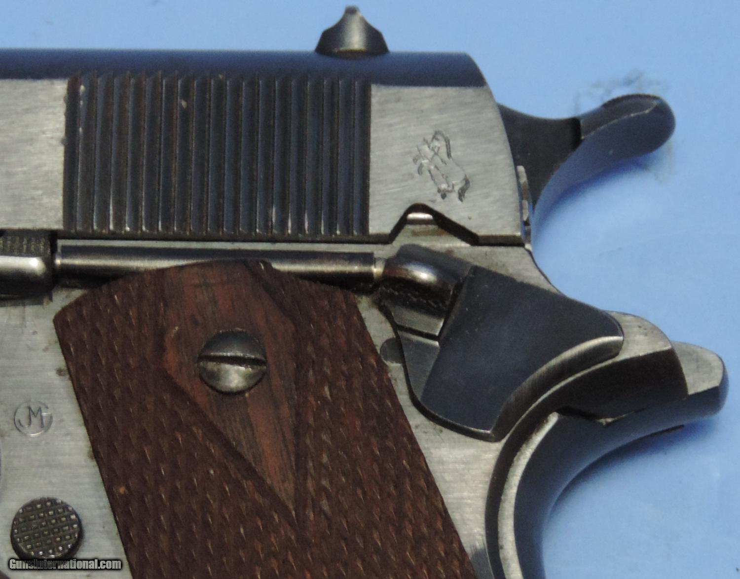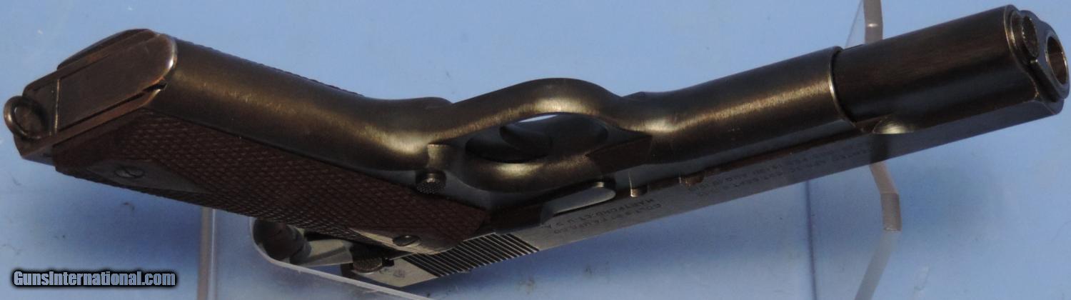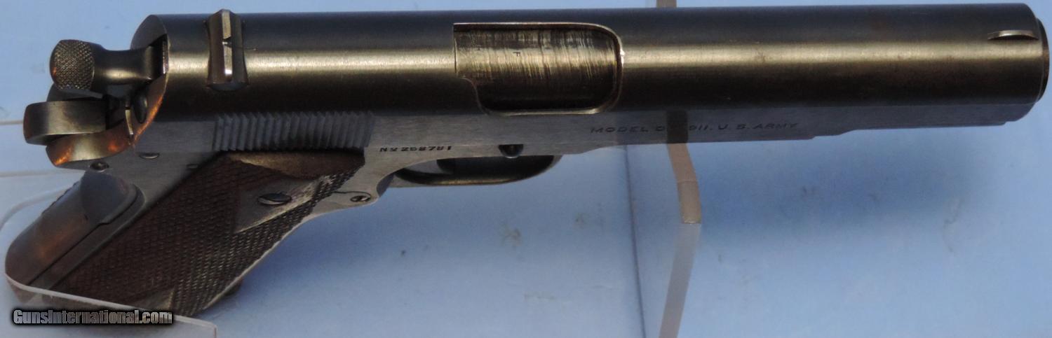 Description: Inv. 5583 Colt U.S. Mdl 1911, Cal. 45acp, Ser. 2587XX. .Amazing, this beauty sat out two wars or a total 97 years and is till awesome. retaining at the very least 98% of the original Colt WW1 blue. There is some very slight, almost imperceptible muzzle and sharp edge silvering. The right front of the slide, does have a few very slight patches of surface pin pricks. Probably from a holster. But that's it. The gripstraps show no graying. The sharp edges of the slide serrations show no silvering and are testimony to the gun's lack of use. An Adjutant's Desk Queen if there ever was one. All parts match and are all correct or the gun. The walnut grip panels are the proper double diamond and have the correct 15 diamond spacing. They two are at least 98%, with no chips or splits. There are two or three very small areas where there are some points are mildly flattened. The grip screws are unmarred. The bolt face and the feed ramp show no use. The barrel is a Type 4 which is totally correct. The top is stamped P H . Underneath the chamber is what appears to be an S. The bore is as unused. The rifling is bright and sharp without a hint of graying. The gun comes with on two tone riveted base magazine and like everything else is correct and showing very little use. A real focal point for a military collection.....$4495. To purchase this firearm or if you want to request more information contact us at: Email ckgunsymail Phone 201-512-0002 Cell 201-575-6838 FAX 201-215-4759 We accept most major credit cards. Prices shown are Discounted 3% for Cash or Check. The buyer must be familiar with all the laws governing the purchase and the ownership of firearms in their own city and state. The Yankee Armorer, Inc is not responsible for any failure to comply with or observe these laws. The Yankee Armorer, Inc will only ship after full payment and receipt of all required documents. Shipping: Add $35.00 for handguns, $45.00 for long guns. New Jersey buyers are subject to a 7% sales tax. The Yankee Armorer, Inc offers a 3 day inspection period with full refund upon return of intact firearm and in the original condition. The Yankee Armorer, Inc offers a no interest lay away program - 25% down; 25% in 30 days; 25% in 60 days; and full payment in 90 days. Any violation of this policy is subject to restocking and forfeiture of all payments. Any variation from this policy must be agreed to in advance. Unshipped Cancelled sales are subject to a 20% restocking fee. Be advised that all firearms sold by The Yankee Armorer, Inc. or the Gun Exchange, LLC (SELLER) are sold as collector’s items. They have not been fired or tested for safety and must be examined by a license gunsmith prior to use. By purchasing any item from the (SELLER), you are agreeing to hold the (SELLER) free from any damages or lawsuits of any nature. Any item left for transfer or storage will be charged to $25.00 per month, per item from the day of its receipt. Any variation from this policy must be agreed to in advance. Store hours 10:00 am to 5:00 pm Tuesday -Saturday. It's always best to call for appointment. Store 201-512-0002, cell 201-575-6838. SOLD Curio/Relic: Yes |