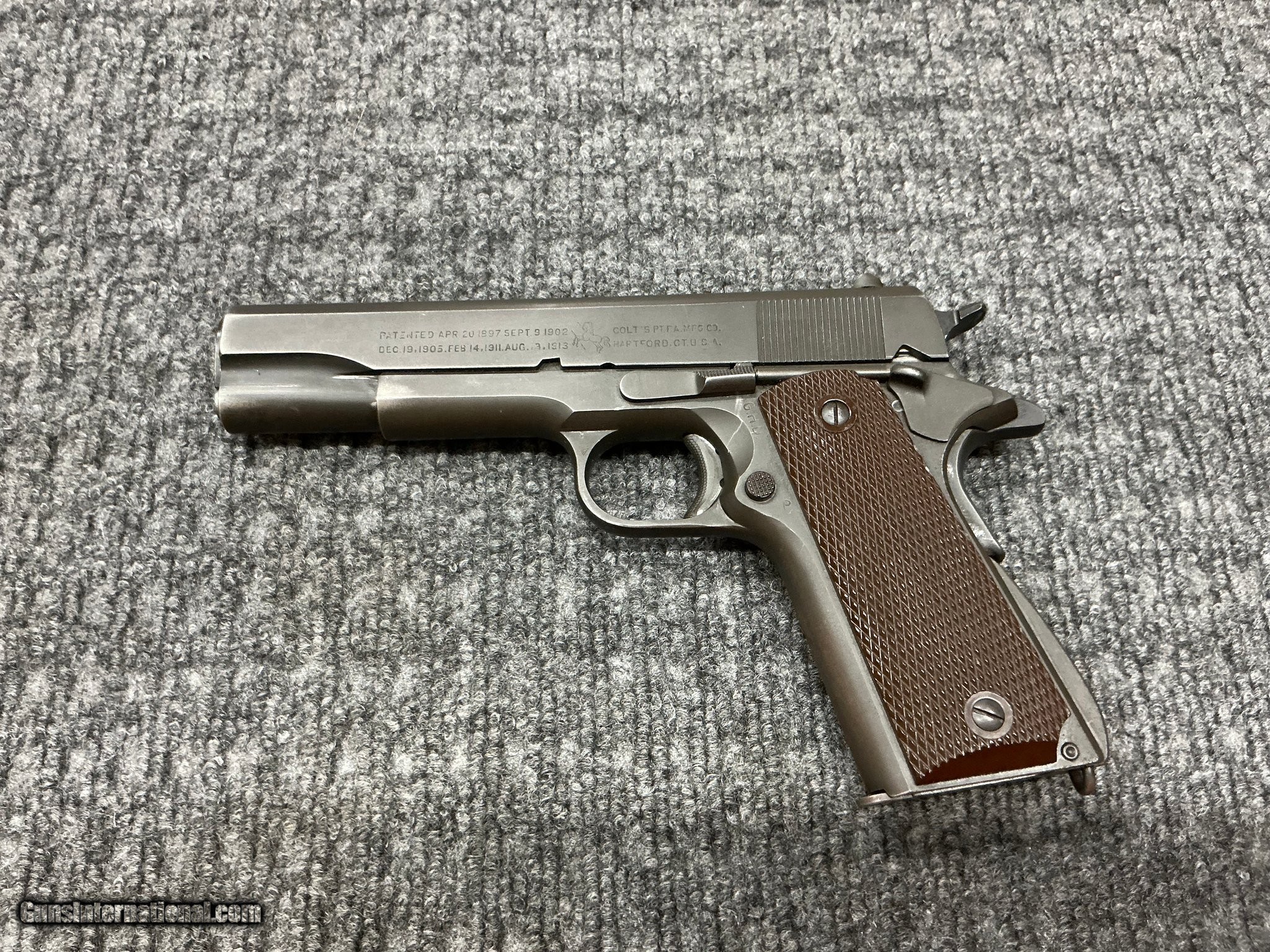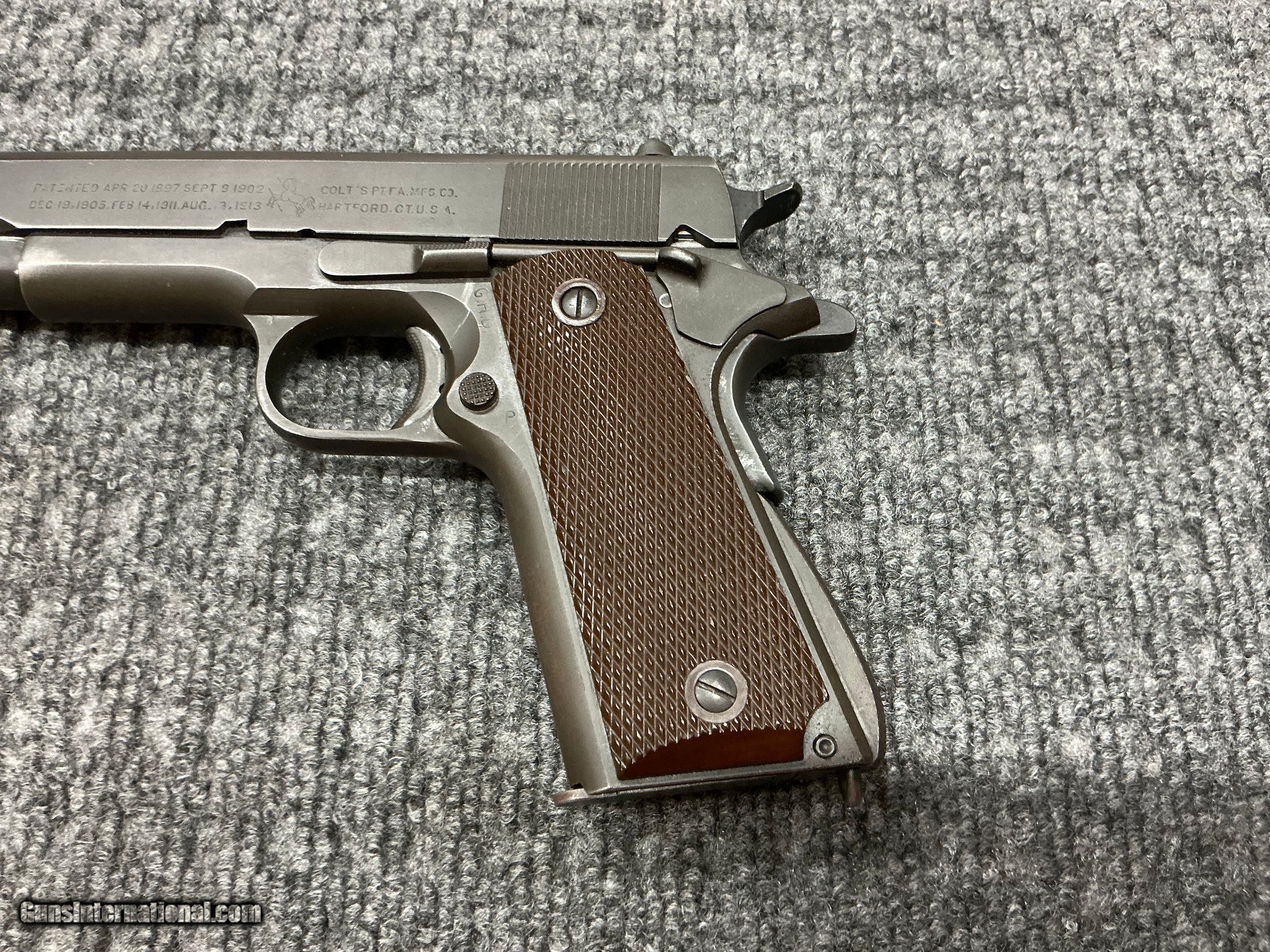 Description: Guns Listing ID: 556443 1943 Colt M1911 A1 .45ACP IN VERY GOOD CONDITION!!THE ACTION IS SMOOTH AND THE TRIGGER IS CRISP.THIS GEM IS A MUST HAVE FOR THE SERIOUS COLLECTOR. SOLD Manufacturer: COLT Model: US M1911 A1 Caliber Info: .45 ACP Condition: Used - Non-Certified Barrels: 5" BARREL Action: SEMI AUTOMATIC Finish: blue |