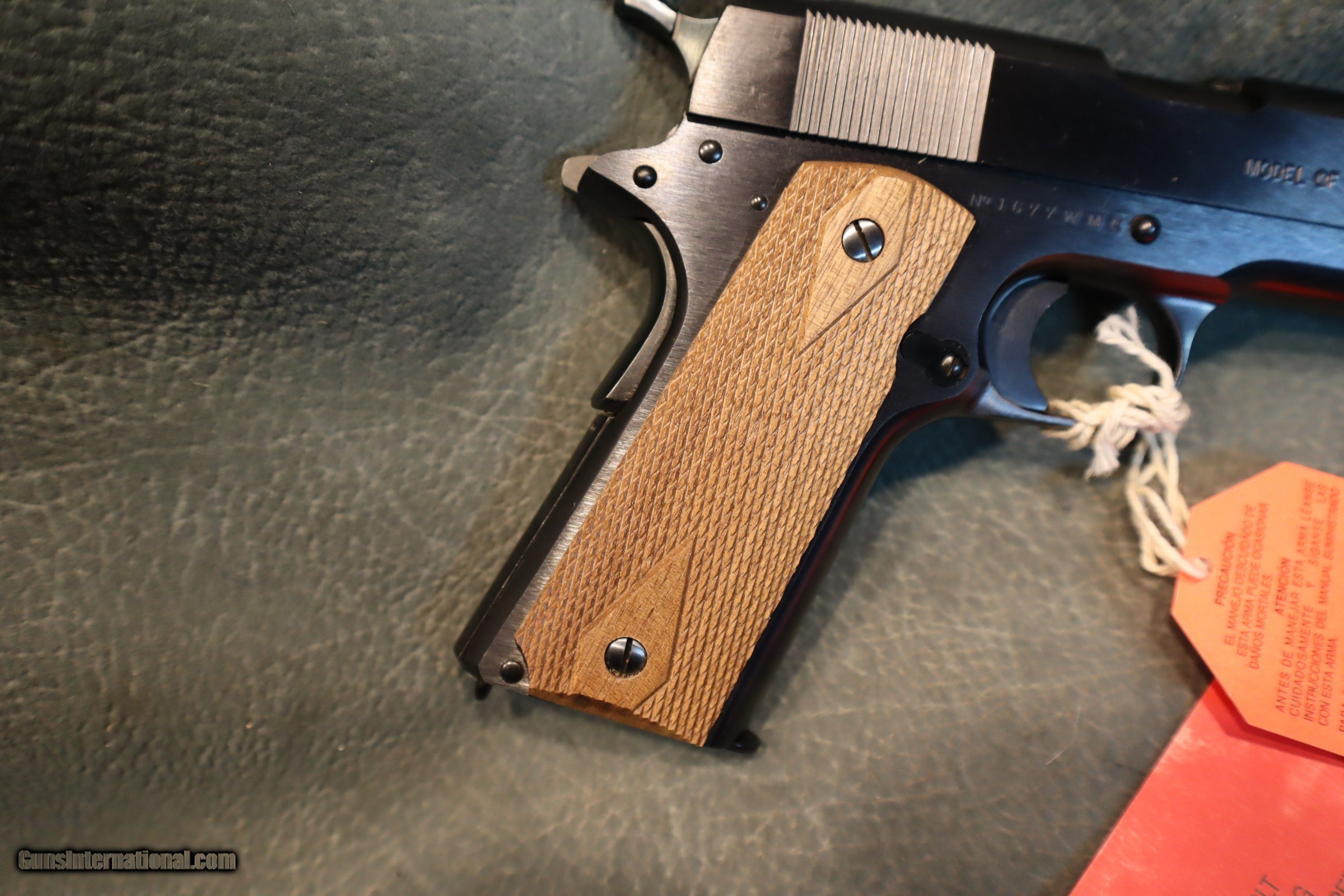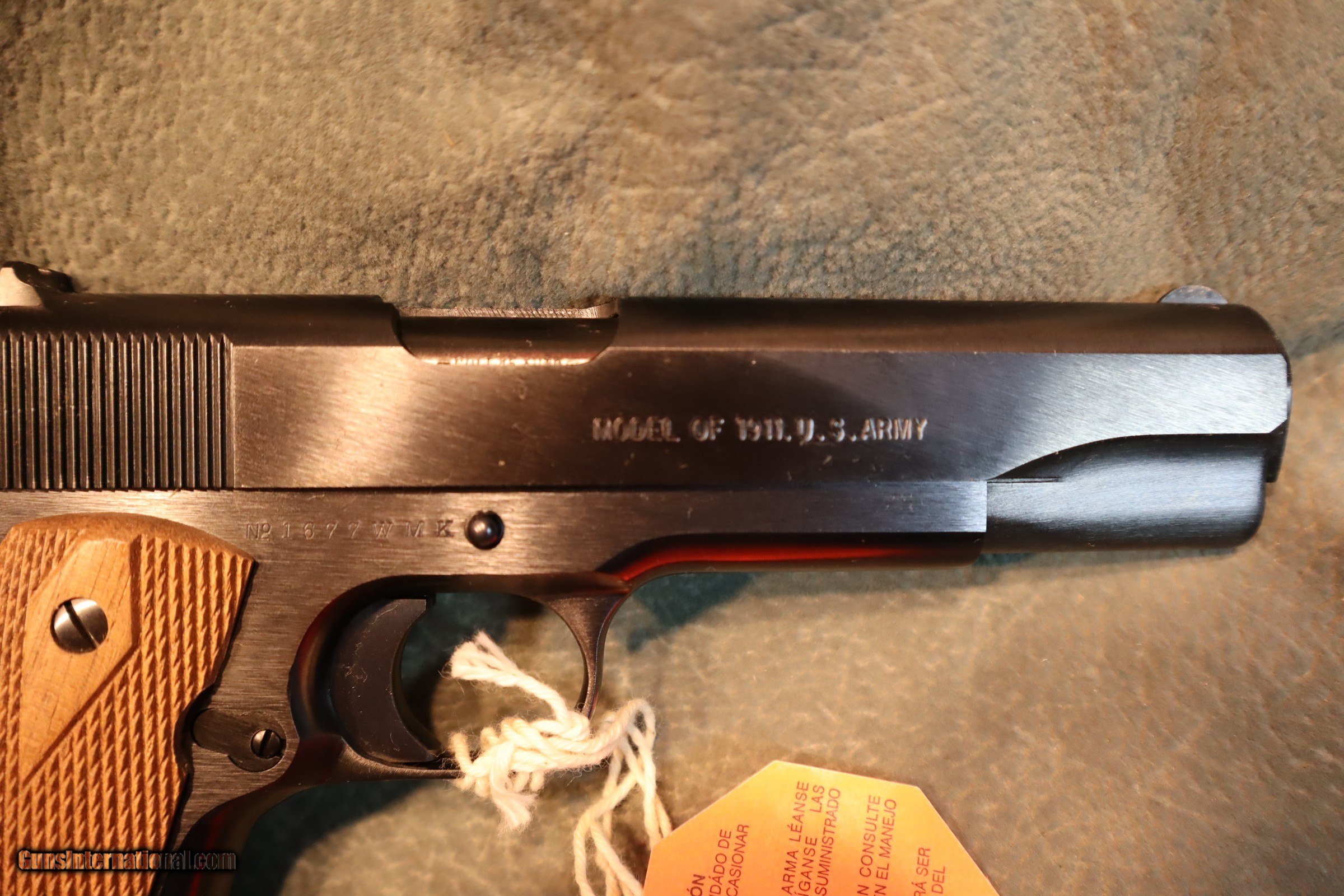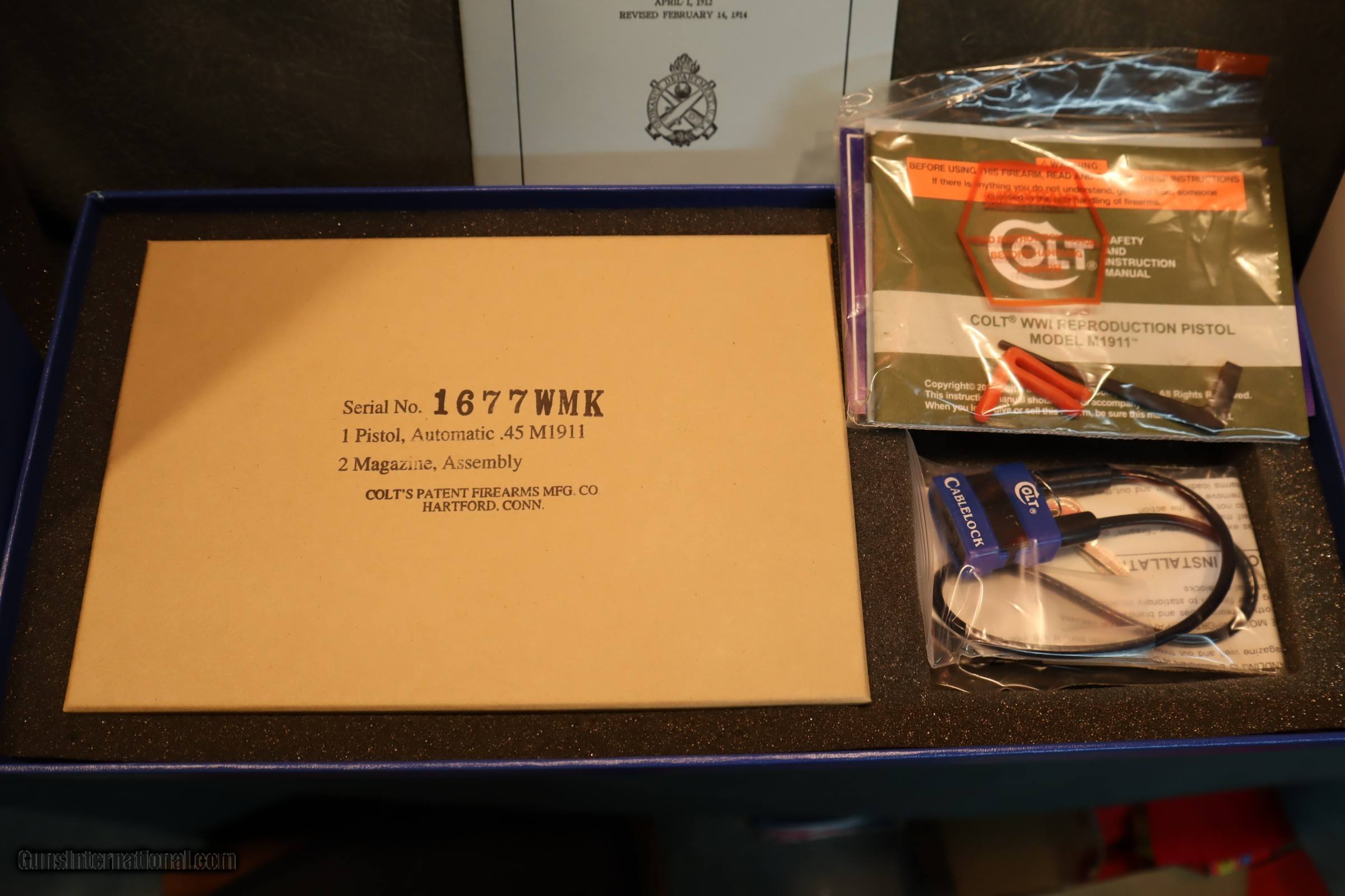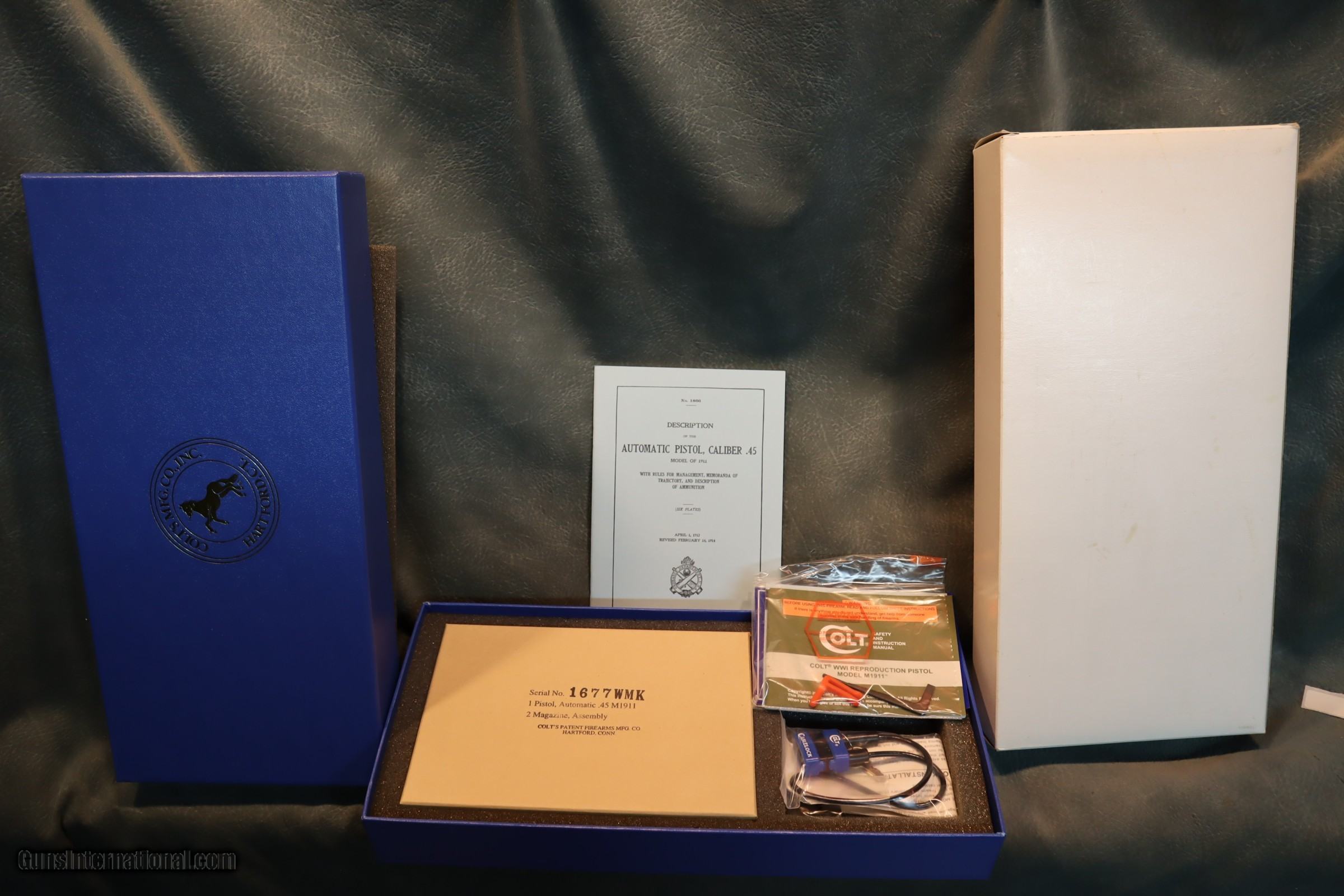 Description: Colt WWI Model No M1911 45acp,original US Army style with Carbonia Blue Finish,original style checkered walnut grips,original WWI roll marks and packaging,limited production made in 2003,new in the Custom Shop box with outer sleeve and all paperwork. GUN COLLECTIONS WANTED FOR CASH! We buy, sell, consign and trade new and used firearms. This is our 48th year in business. We offer 90 day layaways with 20% down. No return on layaways. Firearms will need to be transferred through a FFL dealer. Prices reflect a cash discount. There will be 3% added to credit card sales. We trade for gold and silver. THANK YOU! SOLD |