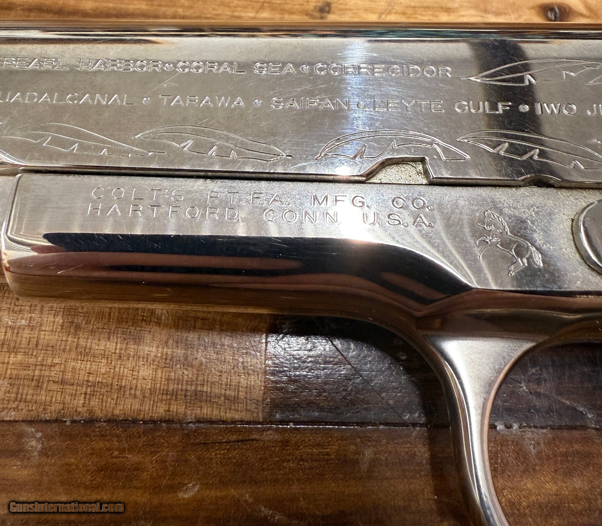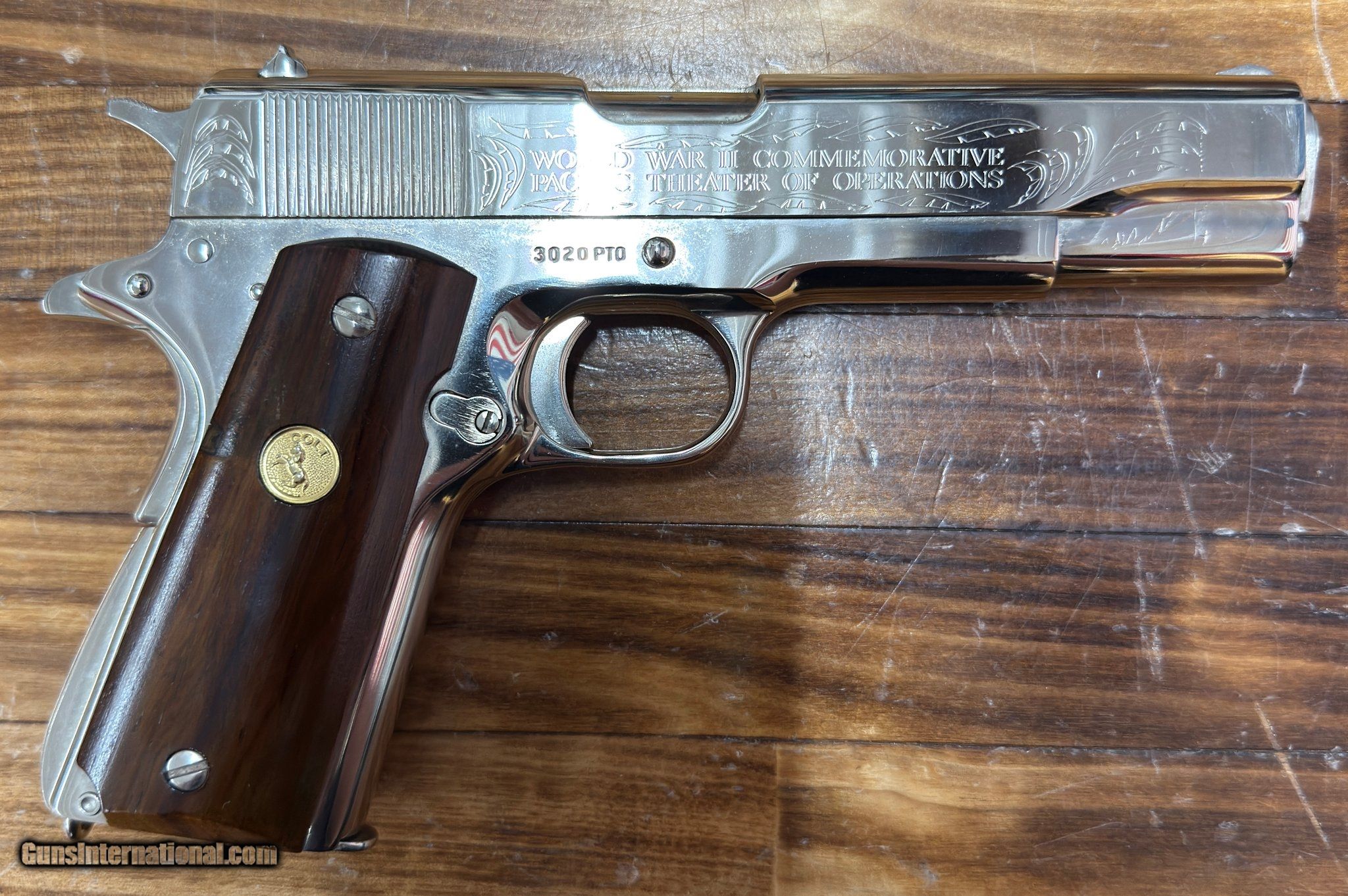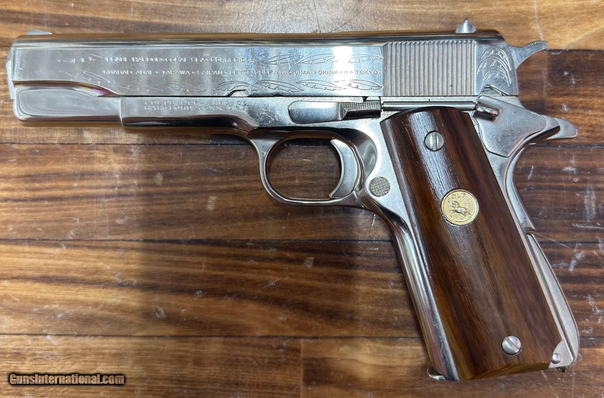 Description: Guns Listing ID: 548427 This is a beautiful Colt M1911A1-style semi-automatic pistol chambered in .45 ACP, part of the limited World War II Commemorative Series by Colt. This specific model honors the Pacific Theater of Operations, with deep, detailed engraving commemorating key battles such as Pearl Harbor, Coral Sea, Guadalcanal, Tarawa, Iwo Jima, and Tokyo. The finish is a highly polished nickel or silver-tone, complemented by smooth wood grips adorned with Colt medallions. This is a collector-grade piece that blends historical tribute with Colt’s iconic craftsmanship. Serial number: 3020 PTO. Produced by Colt Mfg. Co. in Hartford, CT, this piece is ideal for serious collectors of military commemoratives and classic American firearms. SOLD Manufacturer: COLT Model: WWII Pacific Theater Of Operations Caliber Info: .45 ACP Condition: Used - Non-Certified Barrels: 4" BARREL Action: SEMI AUTOMATIC Finish: chrome |