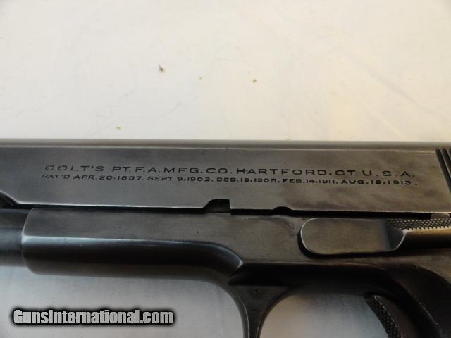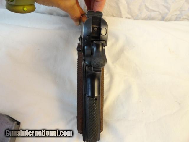 Description: This gun is a very early production commercial 1911-A1 mfg. in 1926. It features all of the changes incorporated in the Model 1911 beginning in 1924. The gun was fully disasembled to make sure each and every part is correct for this gun. It features the checkered small parts such as the long wide spur hammer, pre war checkered back strap, checkered slide stop and lock, original two tone magazine stamped Colt 45 Auto, high polish full finish and the original fully checkered walnut stocks. The bore is mint as is the action. Barrel is blued and is not marked. As to the finish, it retains at least 97-98% high polish blue with just a hint of high edge wear on edge of slide. Rear sight is proper small profile u notch and small front sight. Not a single part needs replacing . Beautiful early commercial Colt 1911. This was the gun of choice thru out the roaring 20's. It is displayed in a mint reproduction box, an original owners manual and a cleaning brush, Nice display for the gun. SOLD Curio/Relic: Yes Manufacturer: Colt Model: 1911 A1 Serial Number: C149767 Caliber Info: 45 ACP Condition: excellent Metal Condition: near mint Wood Condition: mint Bore Condition: mint Action: semi auto Triggers: checkered Finish: BLUE Manufacture Date: 1926 |
