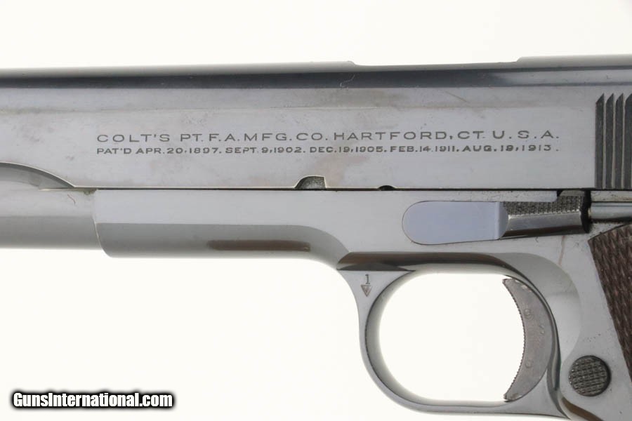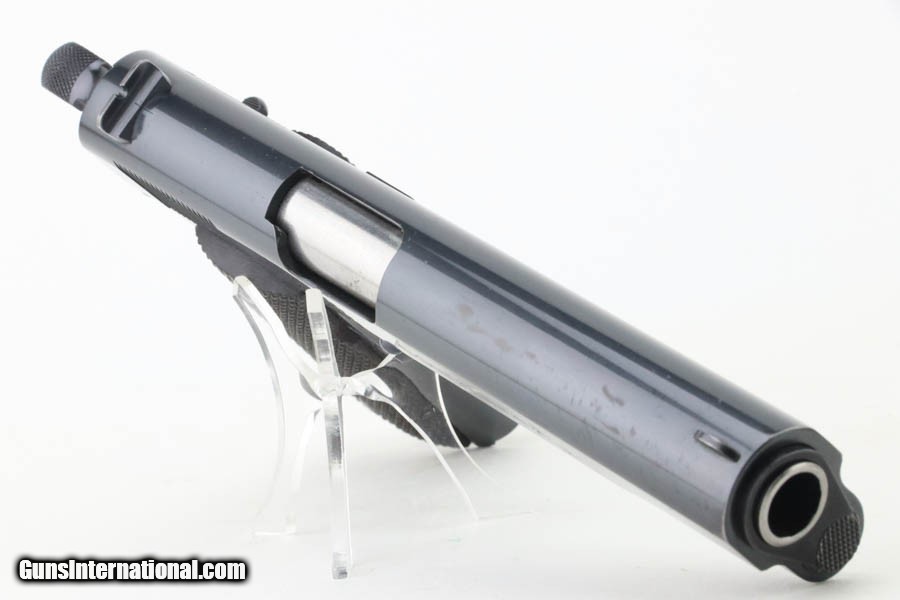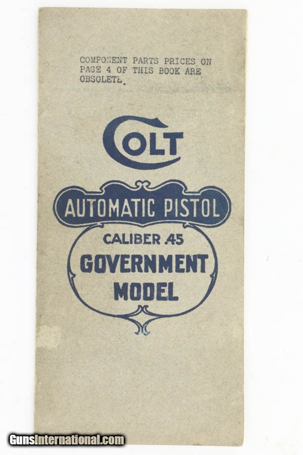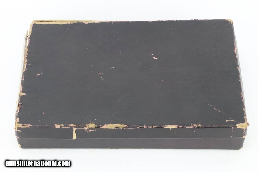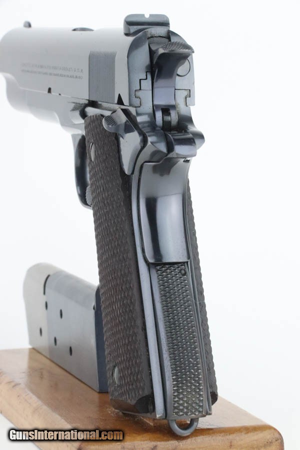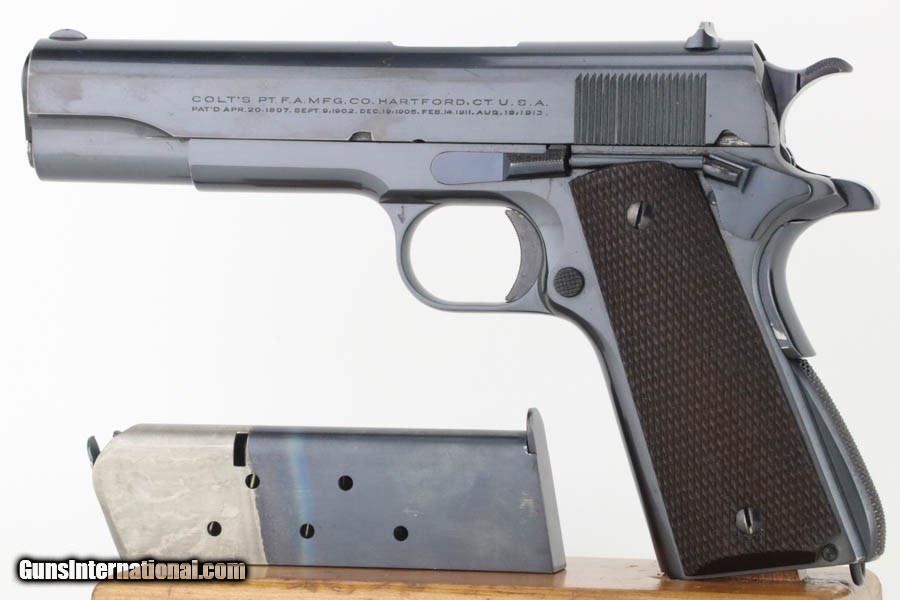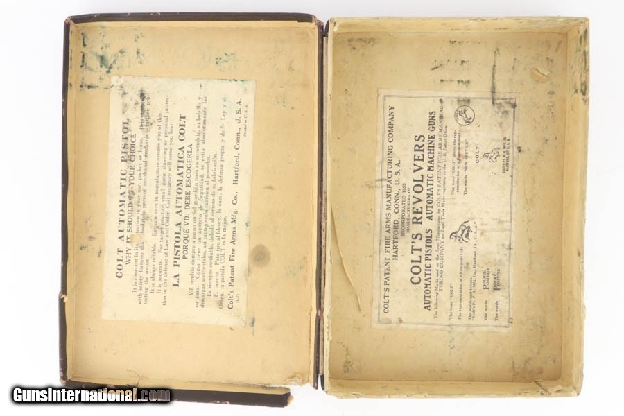 Description: This is an excellent example of an early Colt Government Model sold in the commercial market in 1928. Comes with its original matching-numbered box, owners manual, and a period-correct two-tone magazine. It is all matching and has retained nearly all of its beautiful original high polish bluing. While there is very little actual finish loss, there are some small spots of discoloration along the slide, especially the left side. Fitted with mint wood grips. Excellent, shiny bore with great rifling. SOLD Curio/Relic: Yes Handgun Caliber: .45 ACP (.45 Auto) |