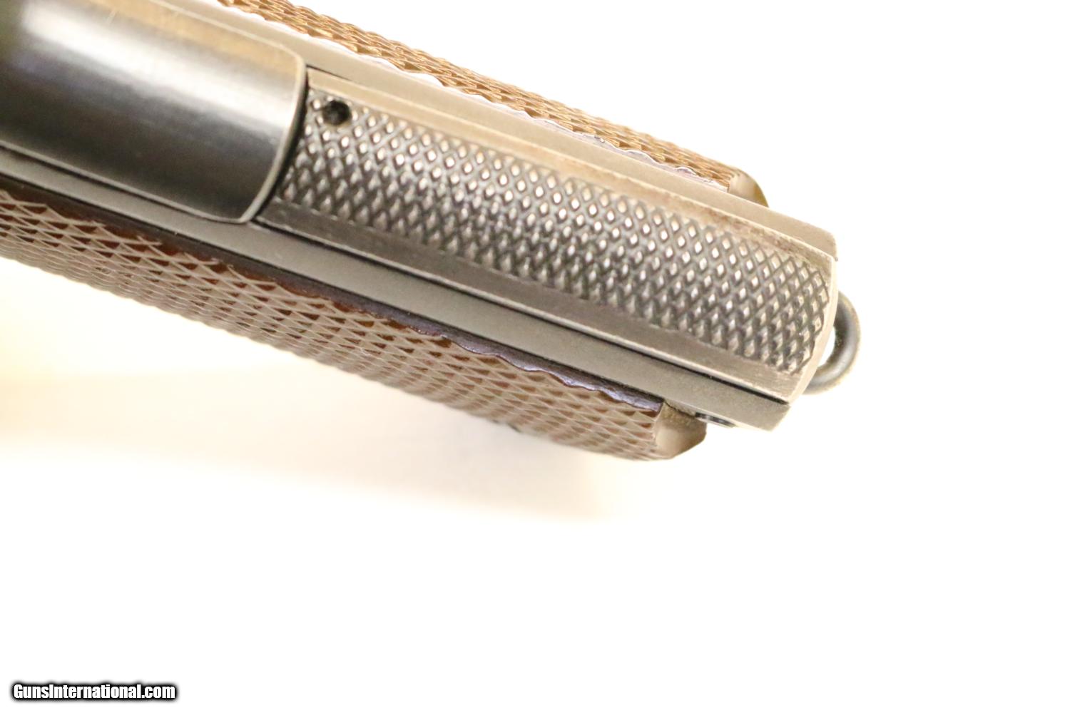 Description: We are pleased to offer this exceptional extremly high original condition Union Switch and Signal 1911. The gun is unmolested changed altered or modified, all the parts are correct and believed to be original to this gun. The DuLite finish is 98 % or better with a little sharp edge wear and a slide release rub mark. S/N 1067xxx. Correct HS marked barrel, S stamped Scovill mfg magazine, Circled R.C.D inspectors stamp ( Robert C. Downie). Barrel bushing shows the correct concentric circle of a US&S bushing. Correct grips, correct trigger, correct main spring housing, and correct hammer. This is a rare gun in the first 20,000 contract run. Union Swithc 7 Signals are conisdered some of the finest made during WWII and after seeing this one in person you will understand why. SOLD |