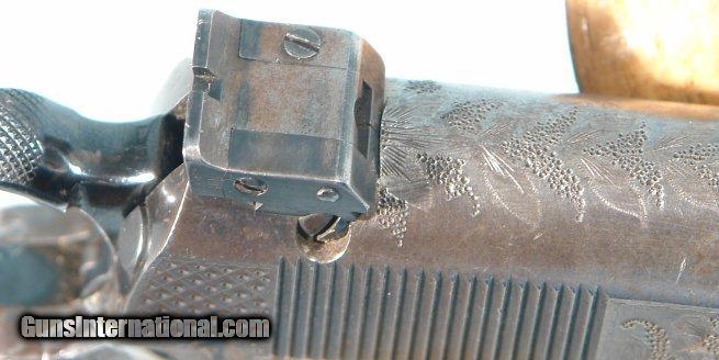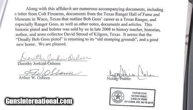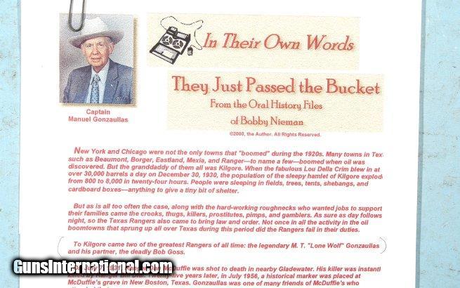 Description: FAMOUS TEXAS RANGER ROBERT G. GOSS’S ENGRAVED COLT SUPER 38 PISTOL CIRCA 1934. Customized and engraved Pre War Colt Super 38 shipped to Wolf & Klar, Fort Worth, Texas on August 3, 1934 owned by Ranger Bob Goss known as the “Deadliest Gun In The Texas Rangers” and partner of legendary Ranger Lone Wolf Gonzaullas. Both were famous lawmen in the wild and wooly era of the Texas Oil Boom and veterans of long service along the Texas-Mexico border. Custom floral engraved with interesting panel engraving of the Red River Toll Bridge at Denison, Texas to the rear of the left side of the slide in commemoration of Rangers Goss and Gonzaullas’s role in winning the famous Bridge War between Texas and Oklahoma in 1931. The front grip strap is additionally engraved in fine monogram script “R/G/G”. Stag grips, custom cut-away trigger guard, double sided safety (right side now removed) as well as King adjustable rear and reflector front sights were added special features selected by Bob Goss who was a serious gun enthusiast. Accompanying the gun is a Colt Factory letter and a large amount of documentation including a notarized affidavit of descent from the sister of Edgar Jenkins, a Texas Peace Officer friend of Bob Goss who bought the gun from his estate after his death. Much of the additional documentation and copies of Goss’s Texas Ranger Service records were provided by the Texas Ranger Hall of Fame and Museum. Also included are copies of articles on Goss and photos of him during and after his years as a Ranger. Absolutely authentic and 100% original with the best documentation and provenance of any Texas Ranger gun we know of and for the gun of one of the most famous of all the early 20th Century Rangers. SOLD Curio/Relic: Yes |