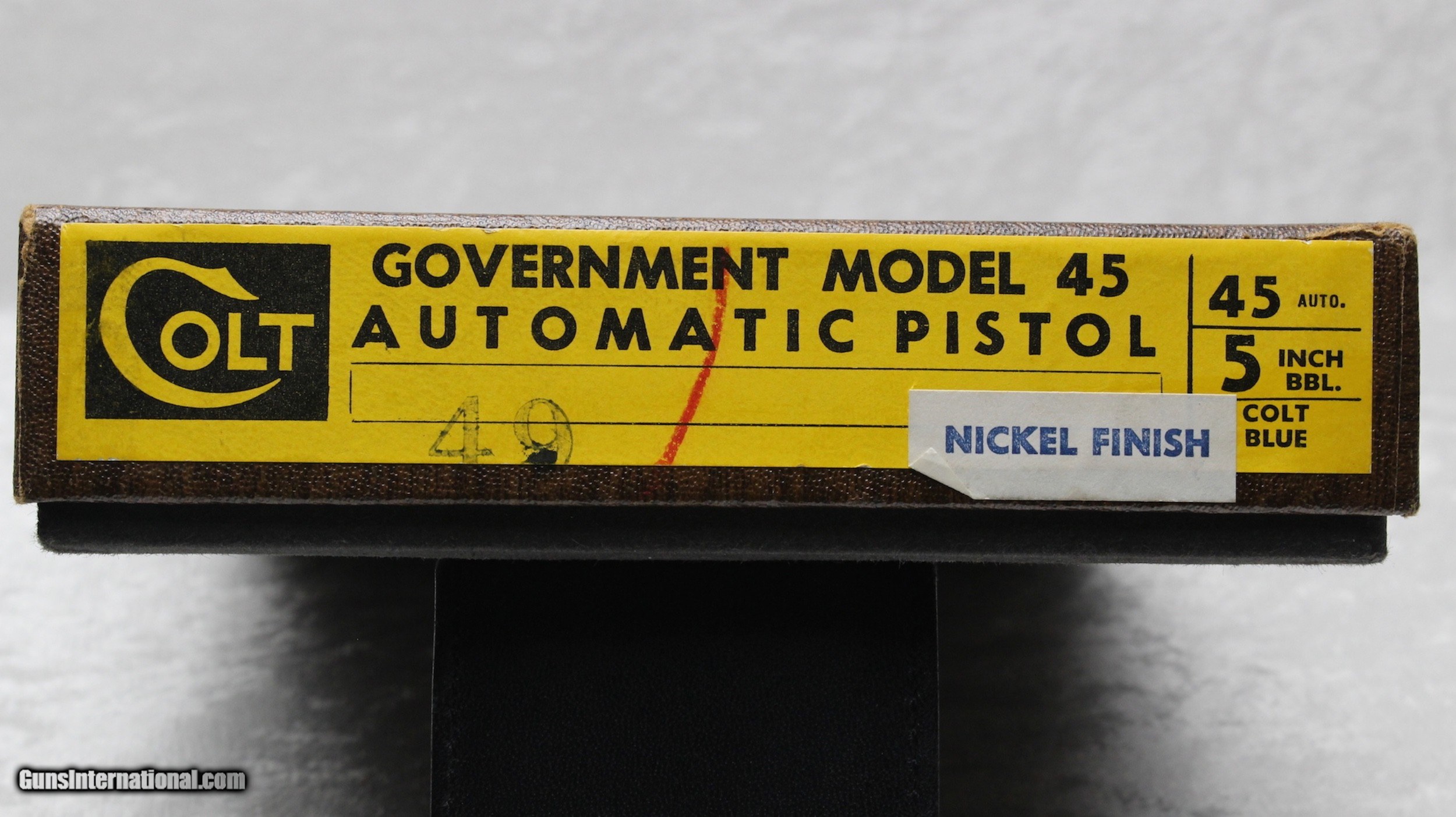Description: This is one of the very last of the "Pre-70 Series" .45 Government Models with a stunning factory nickel finish. The "Pre-70 Series" pistols, manufactured early in 1970, ran from serial number 332500-C through 336169-C. A short pilot run of the so called "BB Series" pistols were scattered throughout the range. The "Mk IV/Series 70" pistols were released in July of 1970 and are identified by the "70G" serial numbers. The slide and frame flats on this example are brilliant, while the matte finish on top the slide and bottom of the frame are exceptional. Looking closely it's hard to find any detractions and the overall finish rates a strong 99% with no sign of a take down mark. The gun appears to have been seldom fired. Also included is the original box numbered to the gun with the manual. Supposedly less than 1% of all Pre-70 Series Government models were produced in nickel, making this is a very desirable collector package. You'd be hard pressed to find a finer example at any price. As always, I offer a 3 day inspection period with full refund (minus shipping) if not completely satisfied with the purchase. SOLD Curio/Relic: Yes Handgun Caliber: .45 ACP (.45 Auto) Manufacturer: Colt Model: Government Condition: Excellent Manufacture Date: 1970 Item Location: Arizona |