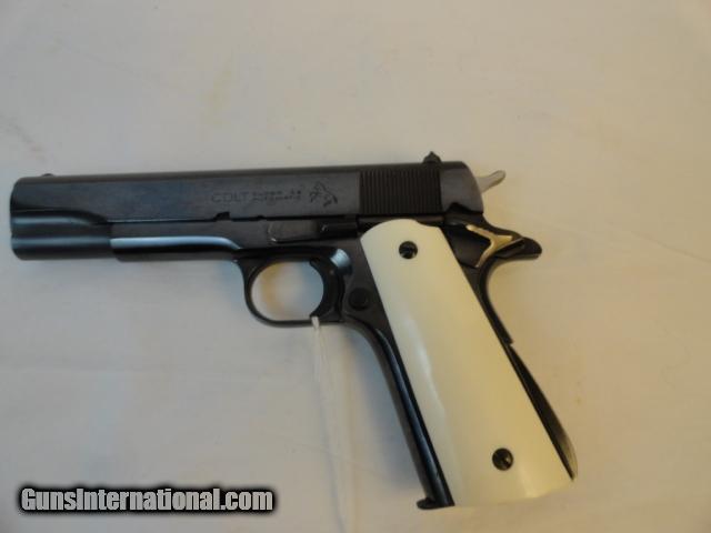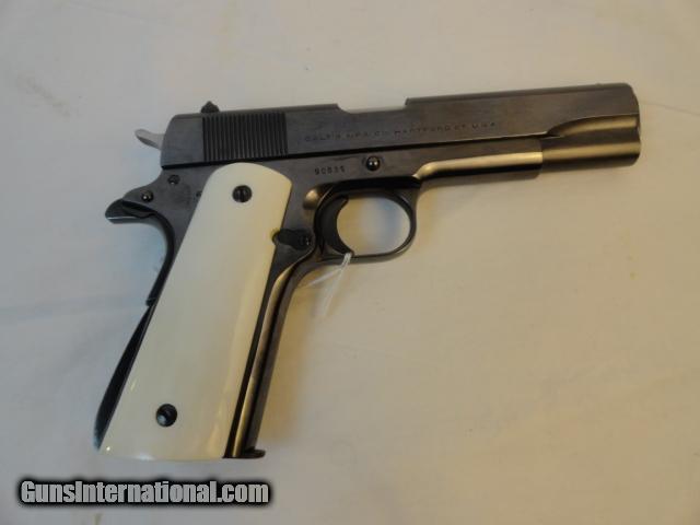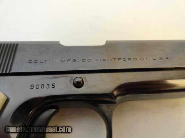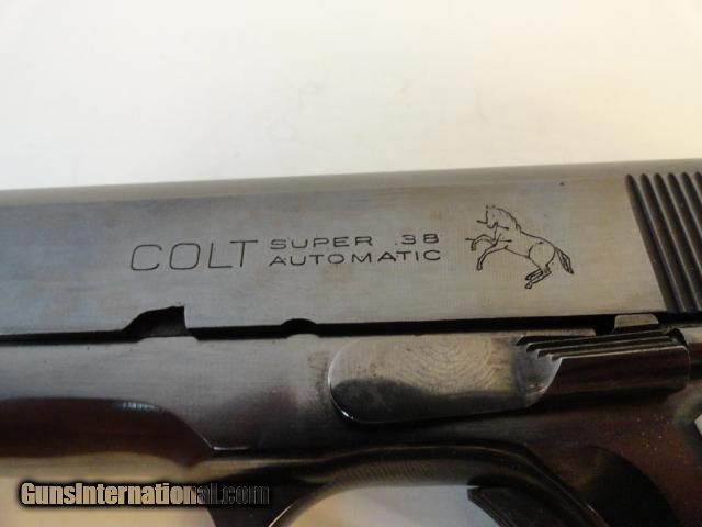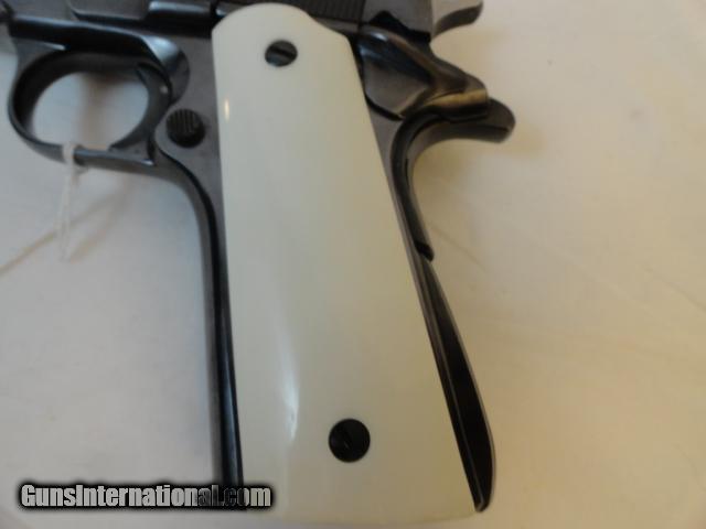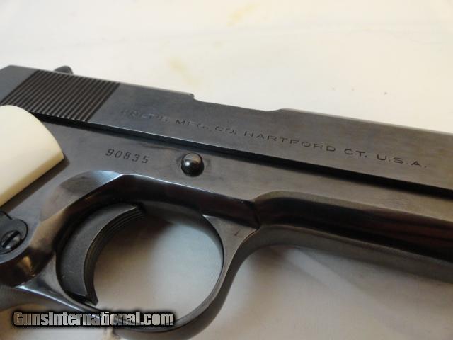 Gun is an early fat barrel .38 super made in 1951. Still has the pre war checkered hammer as Colt used up the last of the pre war parts. Gun appears gem mint as new. The slide is all original finish and flawless with sharp as razor edges and lettering. Frame as been expertyly reblued to match. Original marked magazine and real Buffalo Bone Ivory type grips, not cheap plastic. Bore and action are mint.