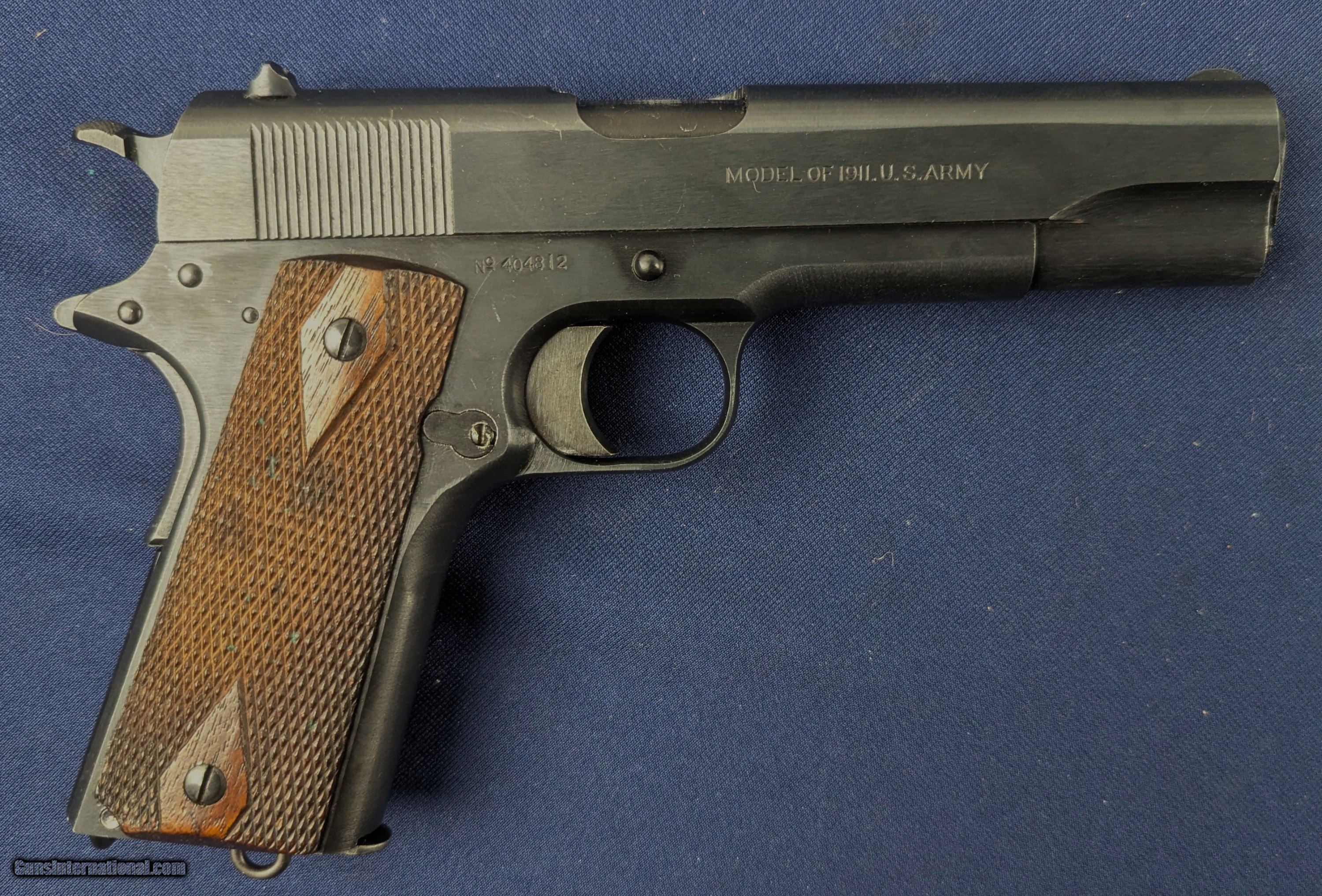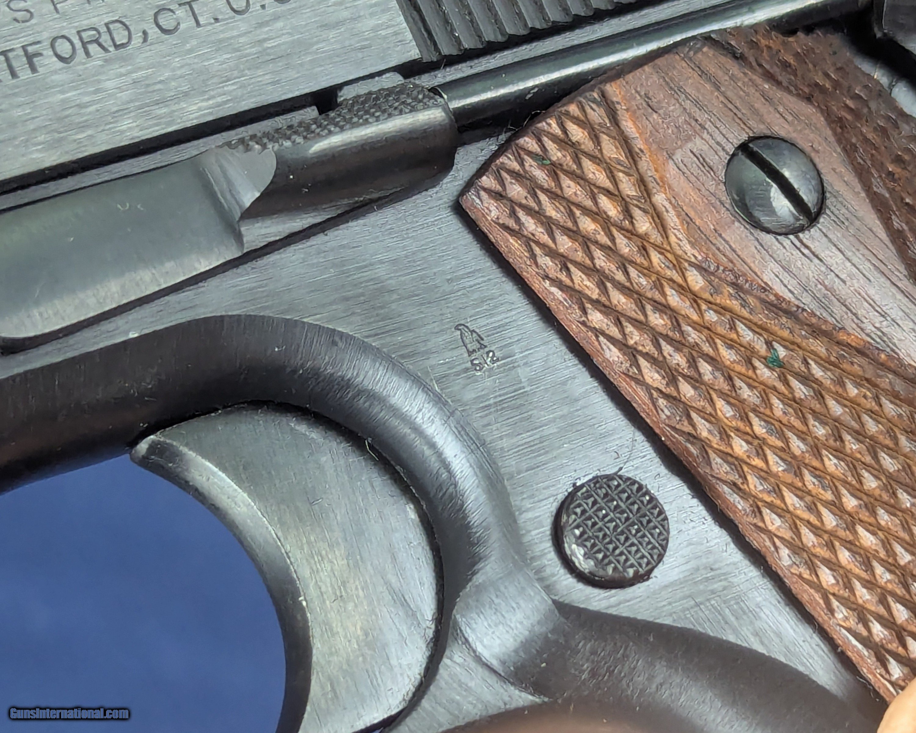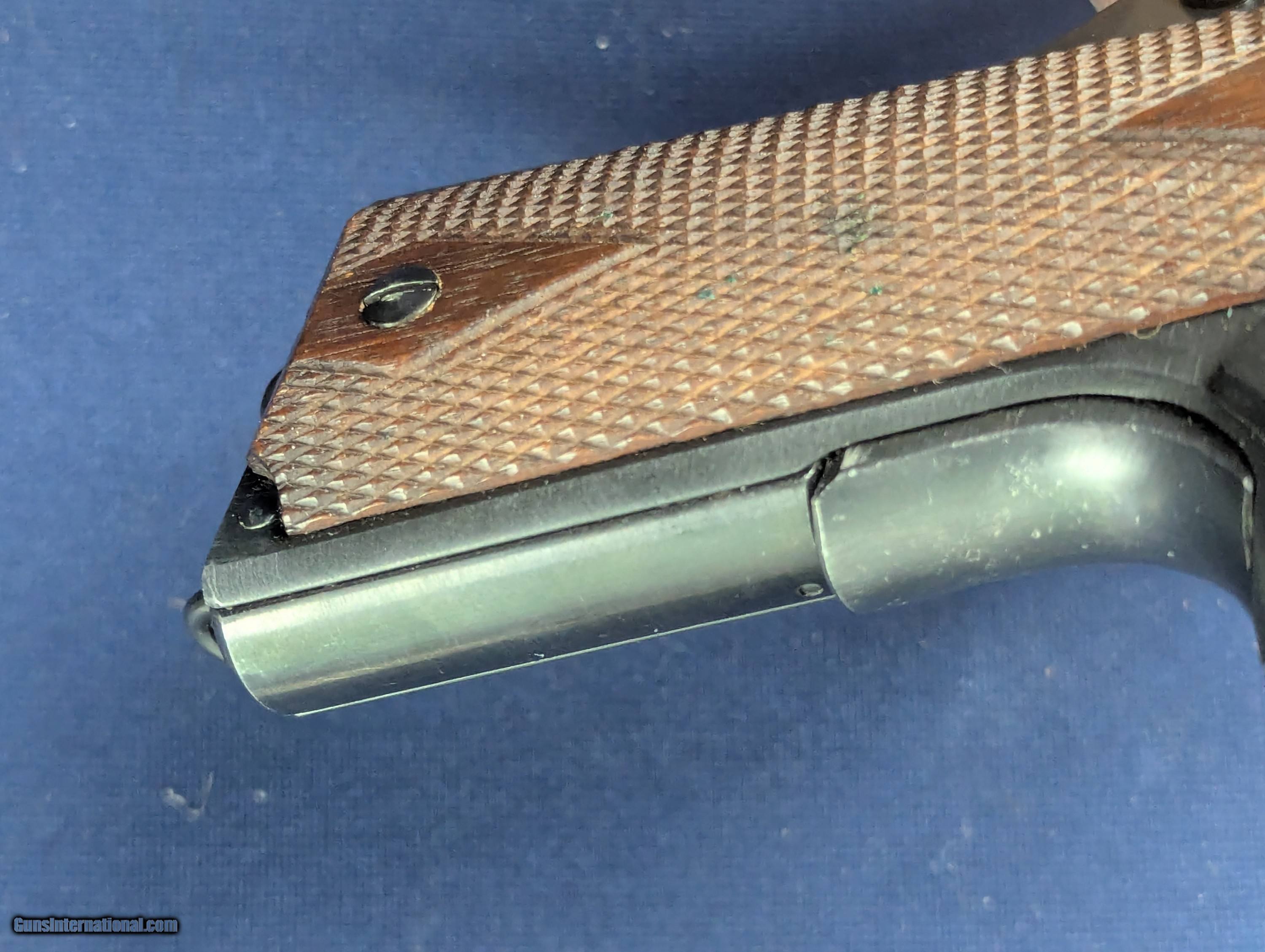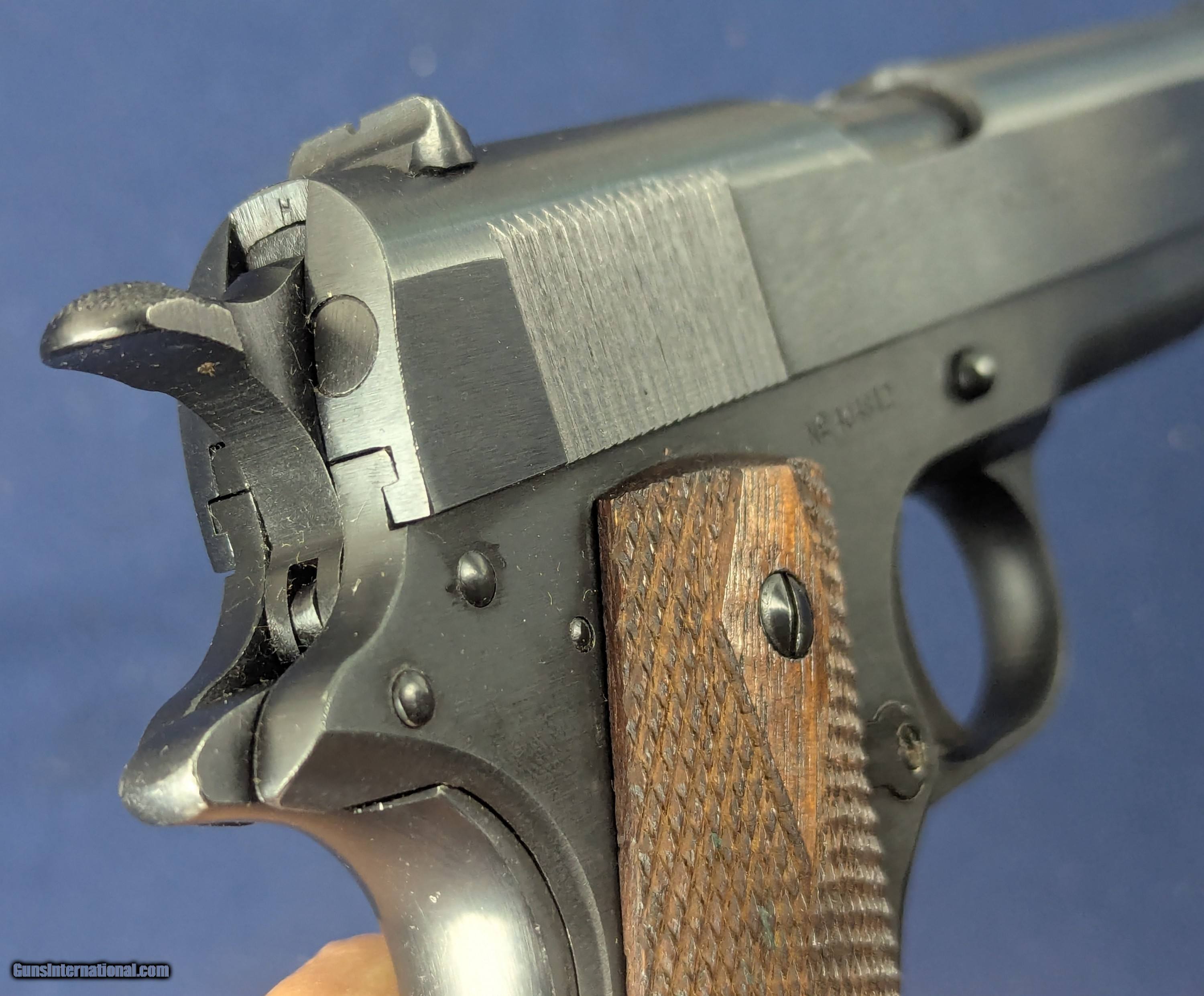 Description: Near Mint WWI Colt 1911 .45 Auto C. 1918 Offered here for sale is a newly acquired truly outstanding example of a WWI-era Colt Model 1911 .45 ACP military pistol a specimen that would be welcome in many advanced military or Colt-focused firearms collections. This WWI Military issue Colt with serial Number: 404812 was produced in mid to late 1918 production. It retains nearly 100% of its original military blued finish and has a mint bore. The markings on the slide and frame are sharp and crisp including inspector’s marks. It has original factory diamond-checkered walnut grips, near unused and a correct two-tone WWI magazine with the folded base and loop, also in excellent condition.Its only imperfection is one small area of patina on the left side of the slide near the muzzle, but extremely faint and minor and not detracting from its visual appeal. This pistol would have been manufactured during a peak wartime production period in 1918, intended for U.S. military service in WWI. The serial number confirms its authenticity as a U.S. Government-issued sidearm, likely delivered under the Ordnance Department’s massive contracts during WWI. Such pristine examples are exceedingly rare, as most saw extensive combat use and later rebuild programs through WWII and Korea. Unaltered examples—especially with their original finish, grips, and matching-era magazine—are highly sought after. This Colt 1911 represents a superb, investment-grade example of America’s most iconic military sidearm certainly may enhance any Colt or U.S. military arms collection given superb condition for a Colt of more than 100 years old. L276 Thanks for your bid. Shipping for this item is $48 however final shipping amount is based upon geographical area. Handling is $12.00 for longarms only. We gladly accept money orders, bank checks and personal checks. Credit card orders (VISA AND MASTER CARD ONLY) charged 3.95% additional for use. PLEASE CALL DALIA AT 203-257-5256 TO GIVE CREDIT CARD INFORMATION. Also, please view our at hansenguns. Click on "Online Catalog" and see All OF OUR ITEMS LISTED CONSECUTIVELY on or search online on that site with the ID “lope”...... OFFERED ONLINE AND AVAILABLE IN OUR RETAIL GALLERY IN SOUTHPORT, CT. Visit us also on Facebook at ://facebook/hansenguns/?fref=ts. We also own and/or operate Hansen Cartridge Co. and the Ruger Collectors Assc.(RCA). Hansen & Hansen wishes to expedite each order received, however we ship 80-100 items weekly, therefore orders paid by money orders or bank checks are cleared for shipping 5-7 days after deposited funds show in our account. Shipping date is scheduled ONLY AFTER VERIFICATION TAKES PLACE AND FFL/C&R IS RECEIVED (IF APPLIES). This is 5-7 days after WE receive order by mail - NOT customer date mailed and postmarked and after credit card funds are posted. Credit card orders exceeding $500 must be cleared through customer’s bank before shipping. Personal checks are accepted but orders are held UP TO 3 WEEKS after deposit of funds before items released for shipping. IF you have special instructions or require overnight or expedited shipping please advise at time of ordering and we will gladly prioritize shipping FOR AN ADDITIONAL CHARGE. THIS IS OUR POLICY and we encourage s to PLEASE READ AND UNDERSTAND OUR POLICY BEFORE . We would be pleased to answer ANY questions by phone (our toll free number is 1-800-571-7337 or e-mail cwlopiaol. SOLD Curio/Relic: Yes Handgun Caliber: .45 |
