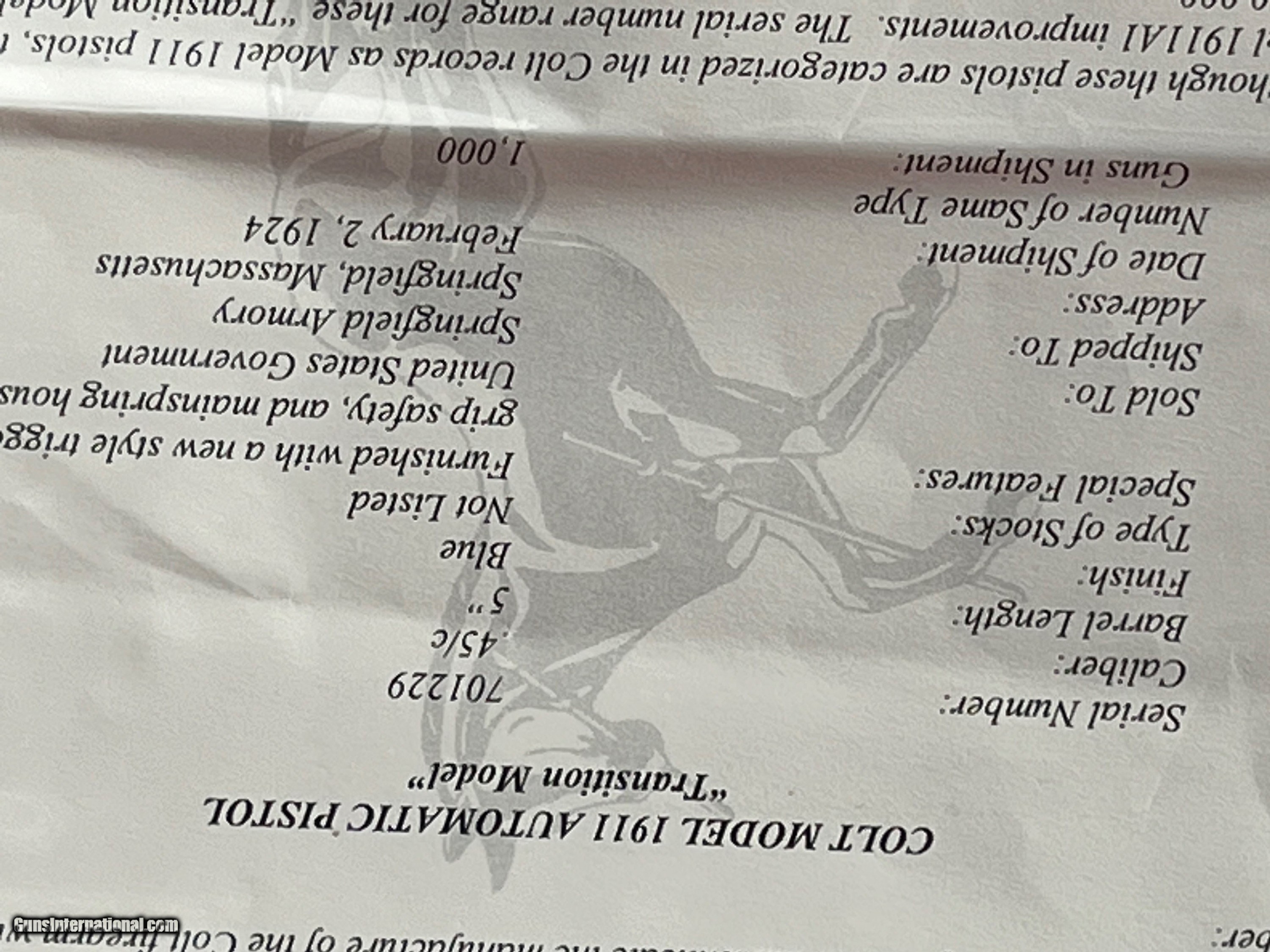 Description: COLT 1911 U.S. ARMY SEMI AUTO PISTOL. RARE 1924 TRANSITION MODEL . SER# 701229 WITH MATCHING NUMBERS SLIDE. SHIPPED FROM COLT TO SPRINGFIELD ARMORY ON FEB SND 1924 IN A LOT OF 1000 GUNS. SER# RANGE 700,001 - 710,000 .VERY NICE METAL FINISH . EXCELLENT BRIGHT BORE WITH PH INTERTWINED ON THE BARREL . CORRECT SERIAL NUMBER IS STAMPED ON THE BACK OF THE SLIDE. ALL MARKINGS ARE CRISP EXCEPT FOR THE WTG INSPECTOR MARK WHIH IS A LIGHT STAMP . YOUR CHANCE TO GET A VERY NICE HARD TO FIND MIITARY 1911. EASTERN BRANCH FIREARMS ADD 40.00 SHIPPING – NEXT DAY AIR SHIPPING ADD 50.00 SHIPPING – LONG GUNS GROUND OPTIONAL INSURANCE IS AVAILABLE AT 1.25 PER 100.00 Questions e-mail or call Glen at Eastern Branch Firearms 207-215-5021 TERMS – PLEASE READ BEFORE I DO NOT HAVE A LAYAWAY OPTION ( WE ACCEPT CREDIT CARDS ) -- I GET ALOT OF REQUEST FOR TRADES, I WOULD PERFER NOT TO DO TRADES ON MY INTERNET LISTINGS PAYMENT OPTIONS- We accept money orders, cashier’s checks , bank checks. sorry no personal checks. We accept all major credit cards please add 3% to the ’s cash discount price.(Shipping within the state of Florida - Florida Residents must pay sales tax) .Handguns and long guns do need to be shipped separate. PLEASE do not send payment via FED EX . USPS & UPS are fine. Thank you. We include a signed copy of our FFL with each firearm shipped. SAFTY NOTICE- Buyer is solely responsible for determining that a used gun is safe to shoot. The firearms offered have not been test fired but have been given a visual inspection only for purposes. It is a requirement that every used firearm is inspected by a qualified gunsmith before firing. By , the buyer agrees to hold seller harmless against damages, injury, or death caused by defective merchandise. RETURN POLICY- All firearms come with a 3-day non firing , non messing with ( turning srews ,taking apart,removing parts, scoping. firing, cleaning or messing with in anyway) inspection/return privilege.Inspection is based on a visual review of the gun to confirm the gun is in the condition stated. In the case of a return, buyer pays all shipping charges & if paid for with a credit card buyer absorbs the 3% credit card charges . So please ask questions BEFORE you bid. Thanks for Looking and Good Luck!! U.S. sales only, no exports…this includes antiques. I will ship to third party for exporting SOLD Curio/Relic: Yes |