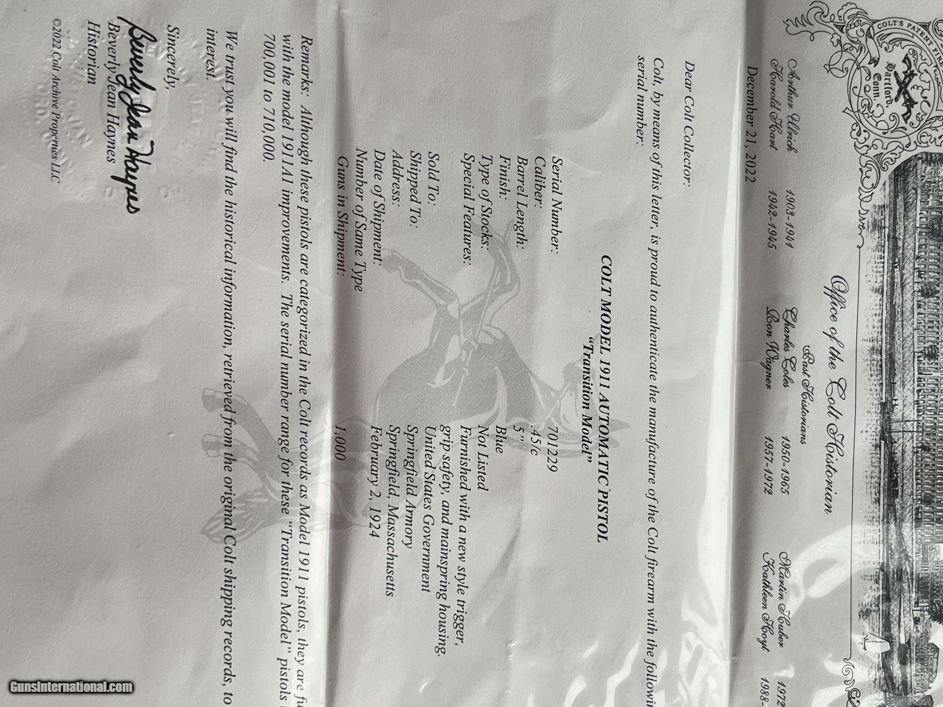 RARE - COLT 1924 TRANSITION U.S. MILITARY 1911 SEMI AUTO PISTOL 45ACP U.S. ARMY