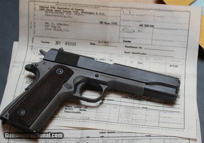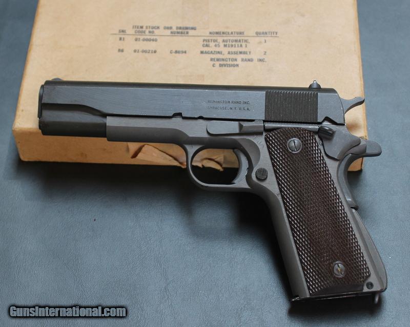 Description: Remington-Rand 1911A1 .45ACP 5 Inch End of WW2 production, this excellent 1911A1 was manufactured during the last week of production in Syracuse, NY. Minty condition, includes 1- magazine and comes in shipping box from Letterkenny Depot with NRA paperwork. No C&R's accepted, S&H is $35, USPS. payment to be made with certified funds, bank checks or money orders only. SOLD Manufacturer: Remington-rand Model: 1911A1 Serial Number: 24402xx Caliber Info: .45 ACP |