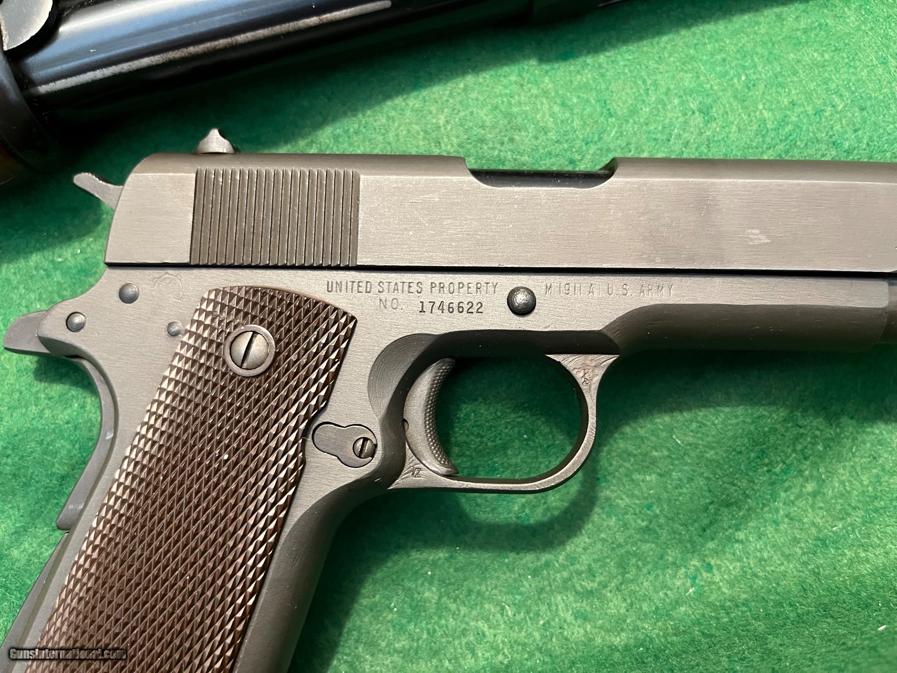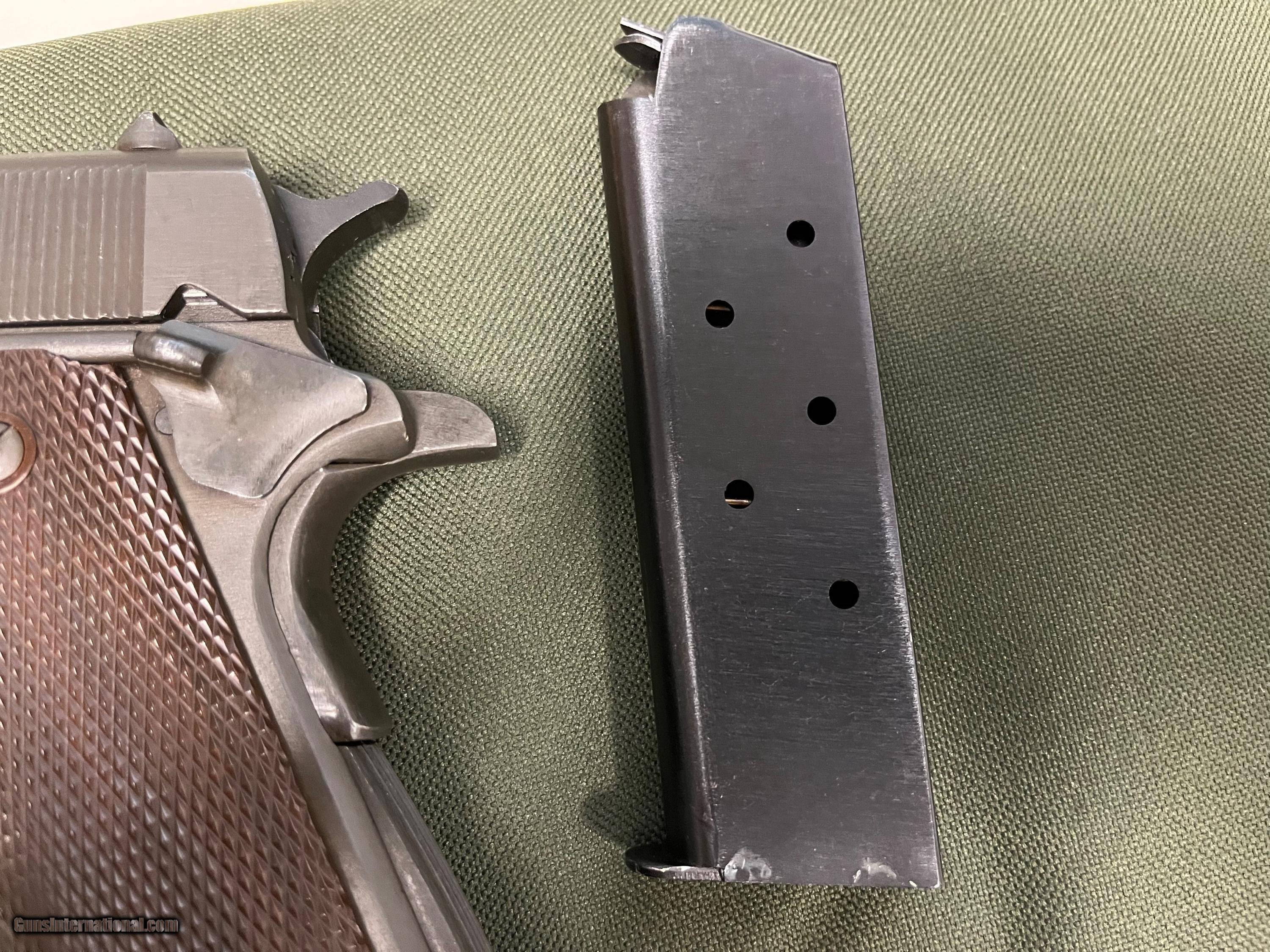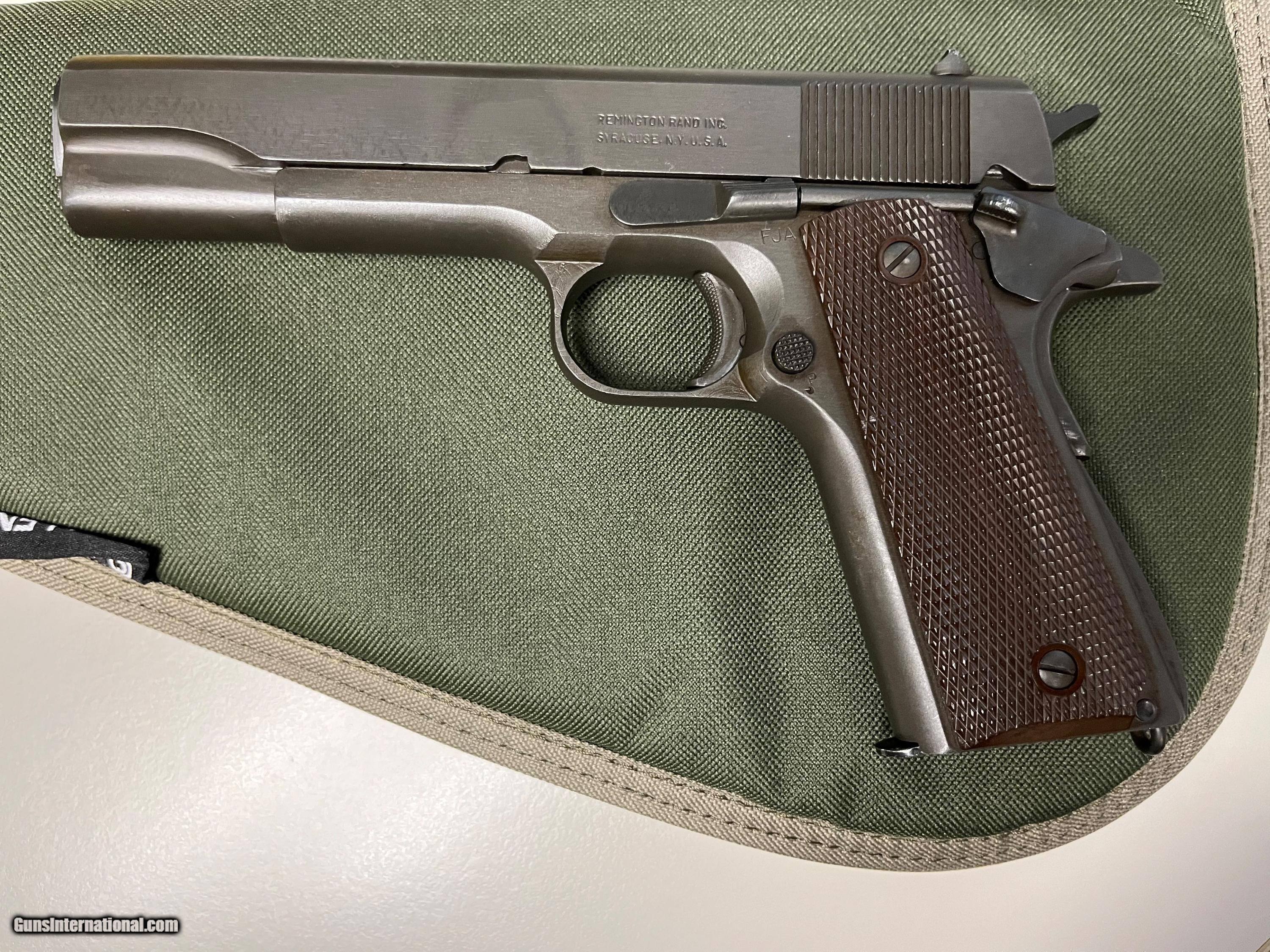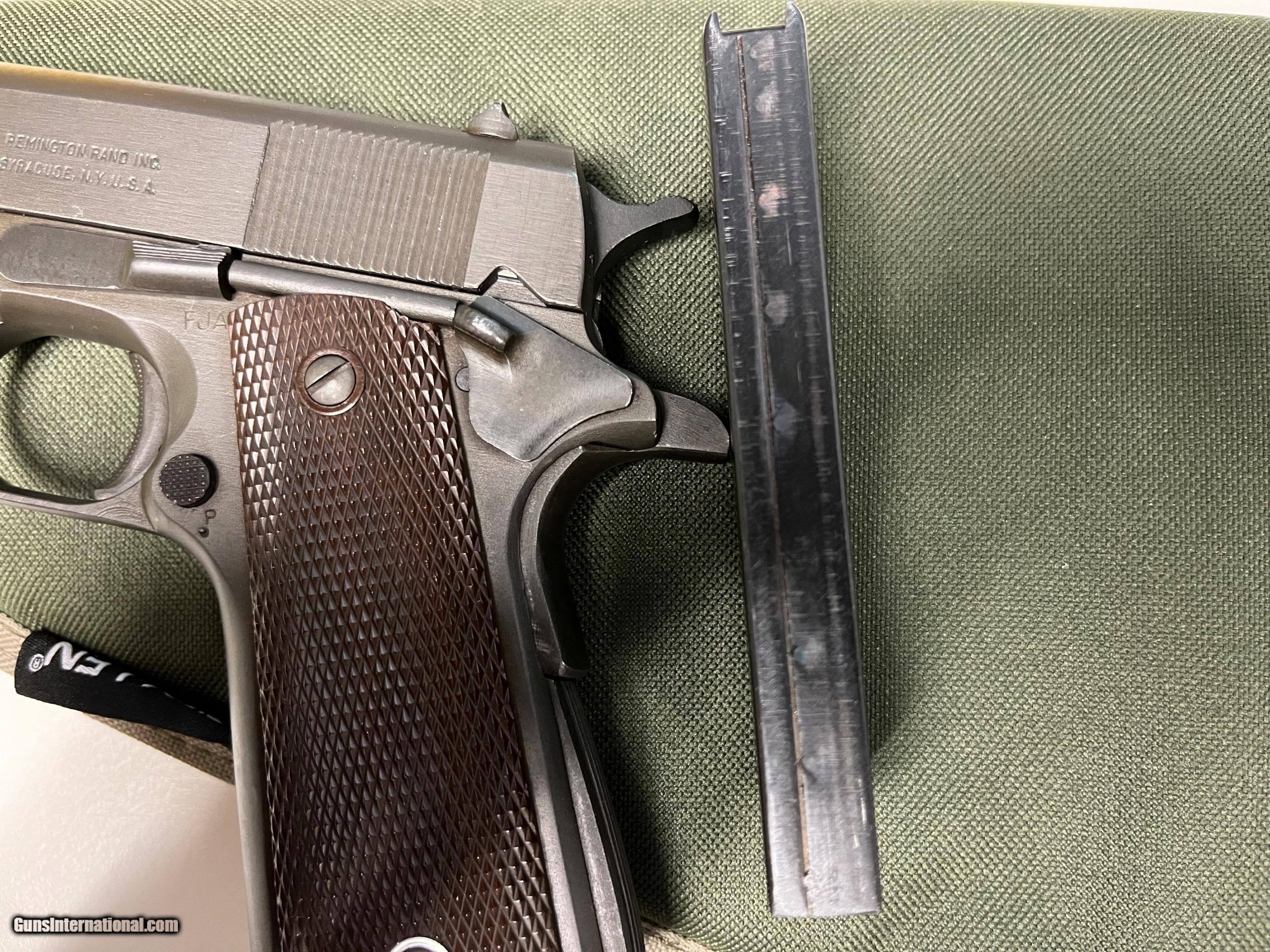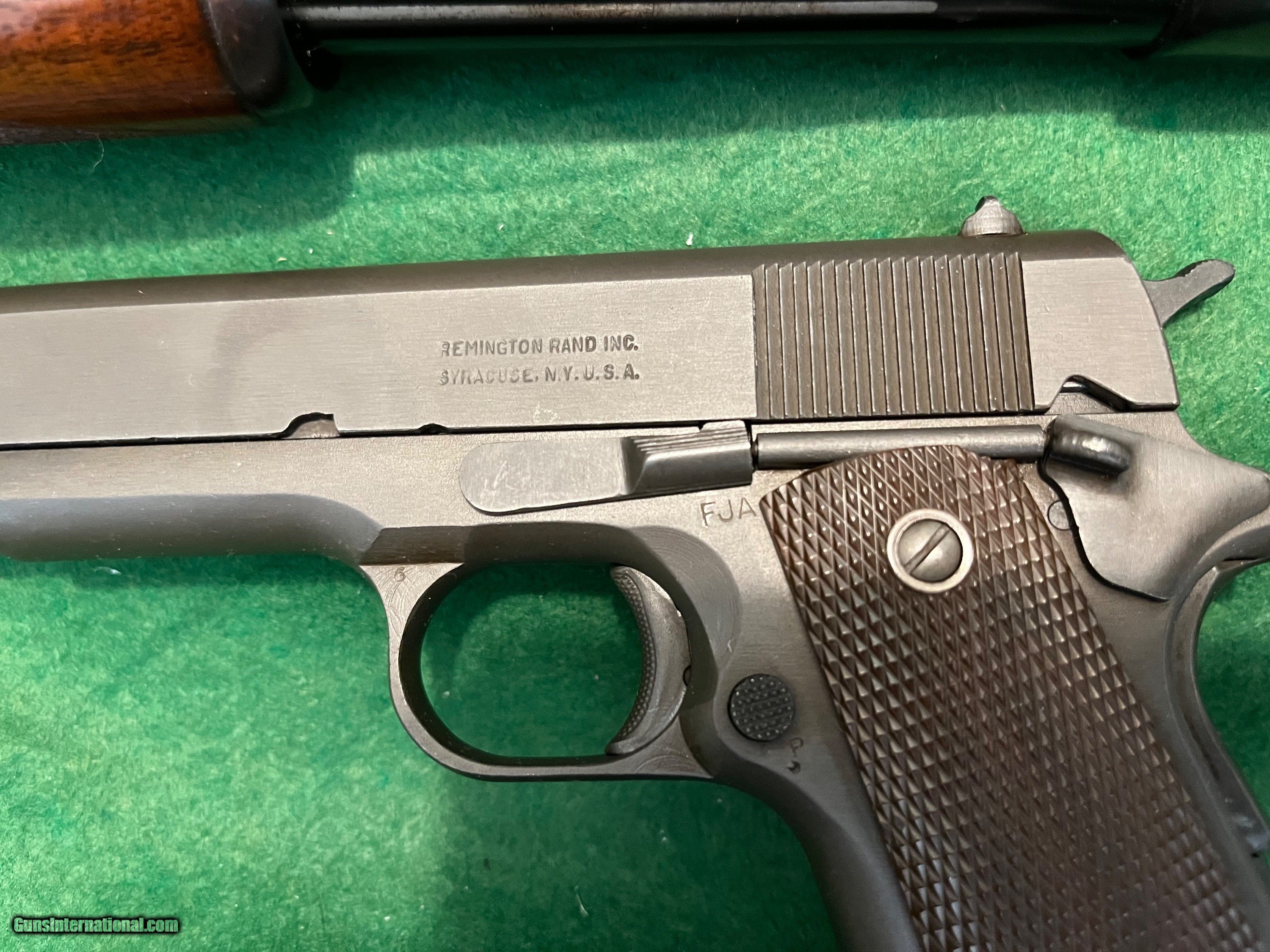 Description: 1944 Remington Rand 1911A1. 99% Original Condition. This one is Flat New. General Shaver Magazine. High Standard Barrel. It comes with it's 1945 dated USMC M7 Boyt Shoulder Holster. It also is in new condition. SOLD Handgun Caliber: .45 ACP (.45 Auto) |
