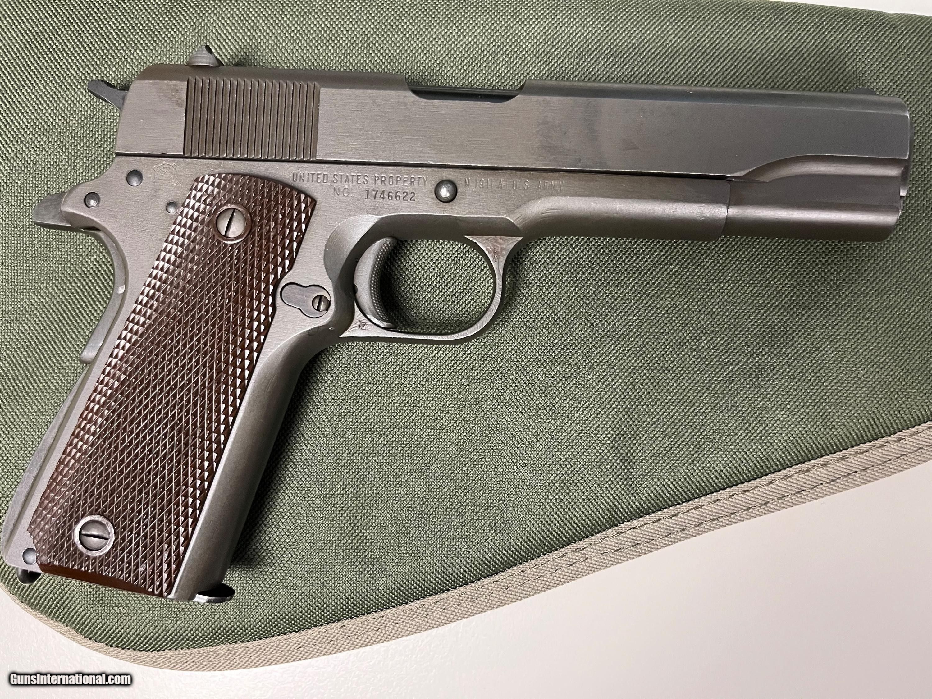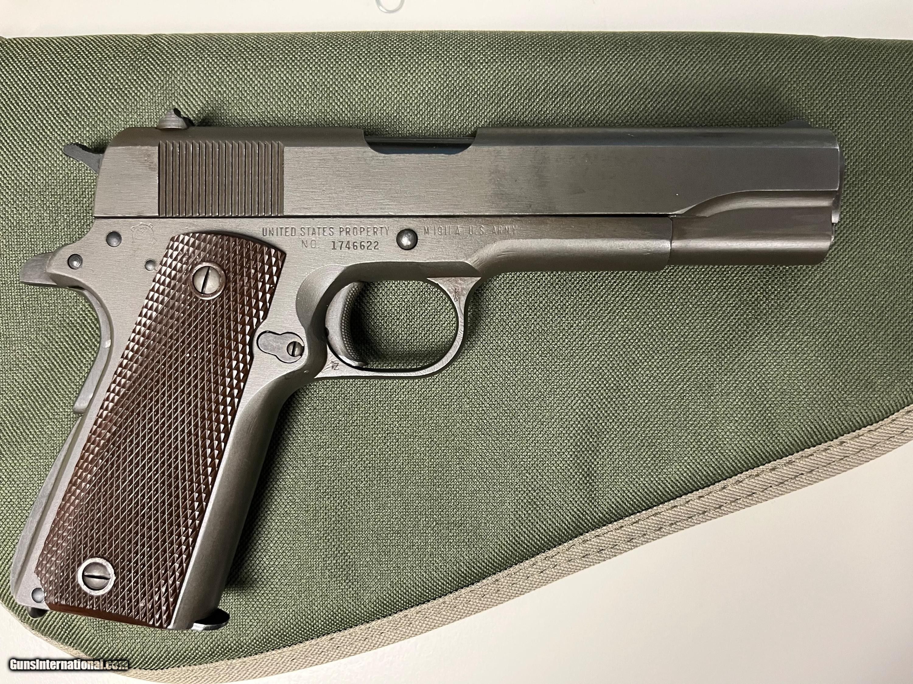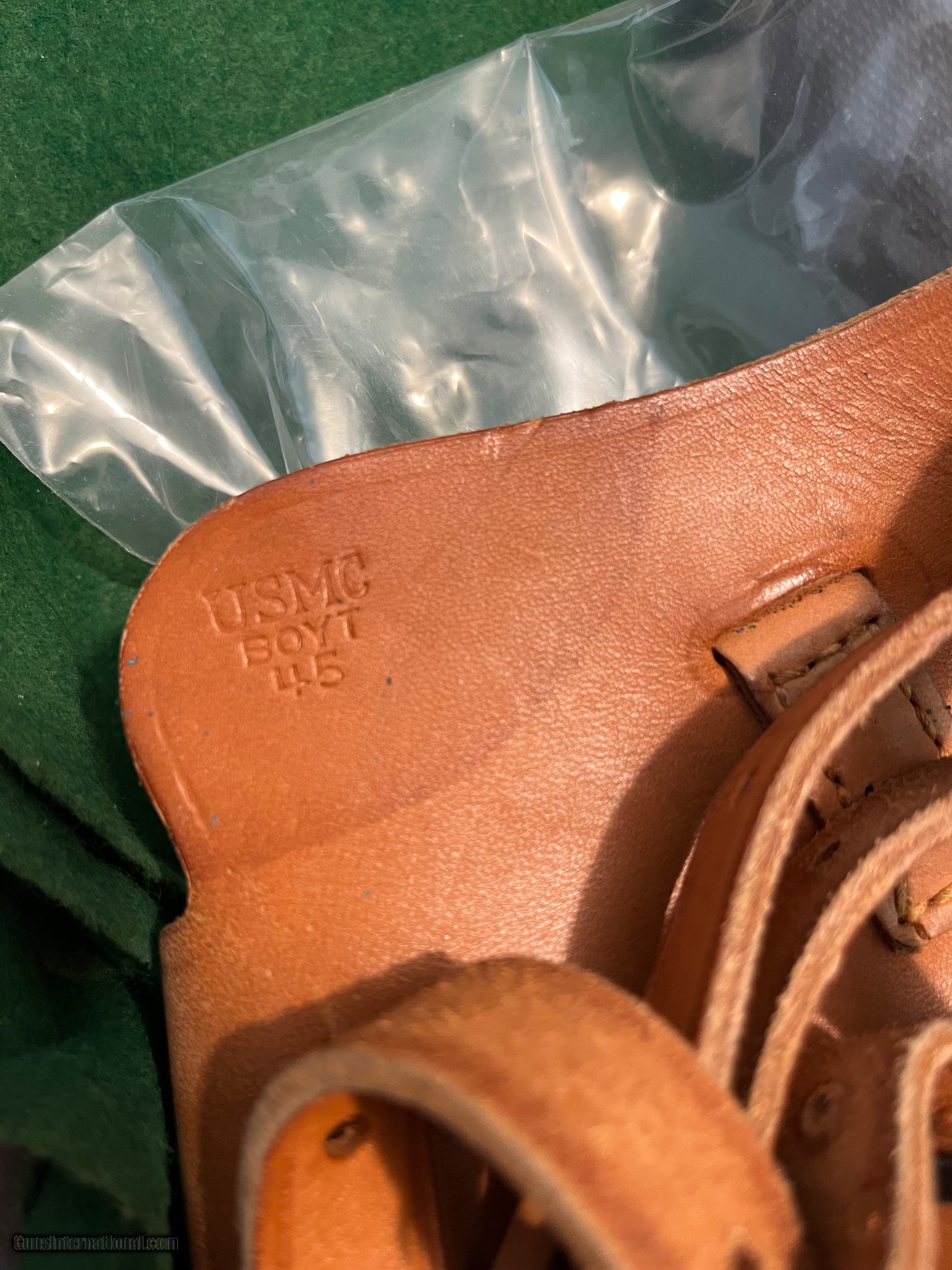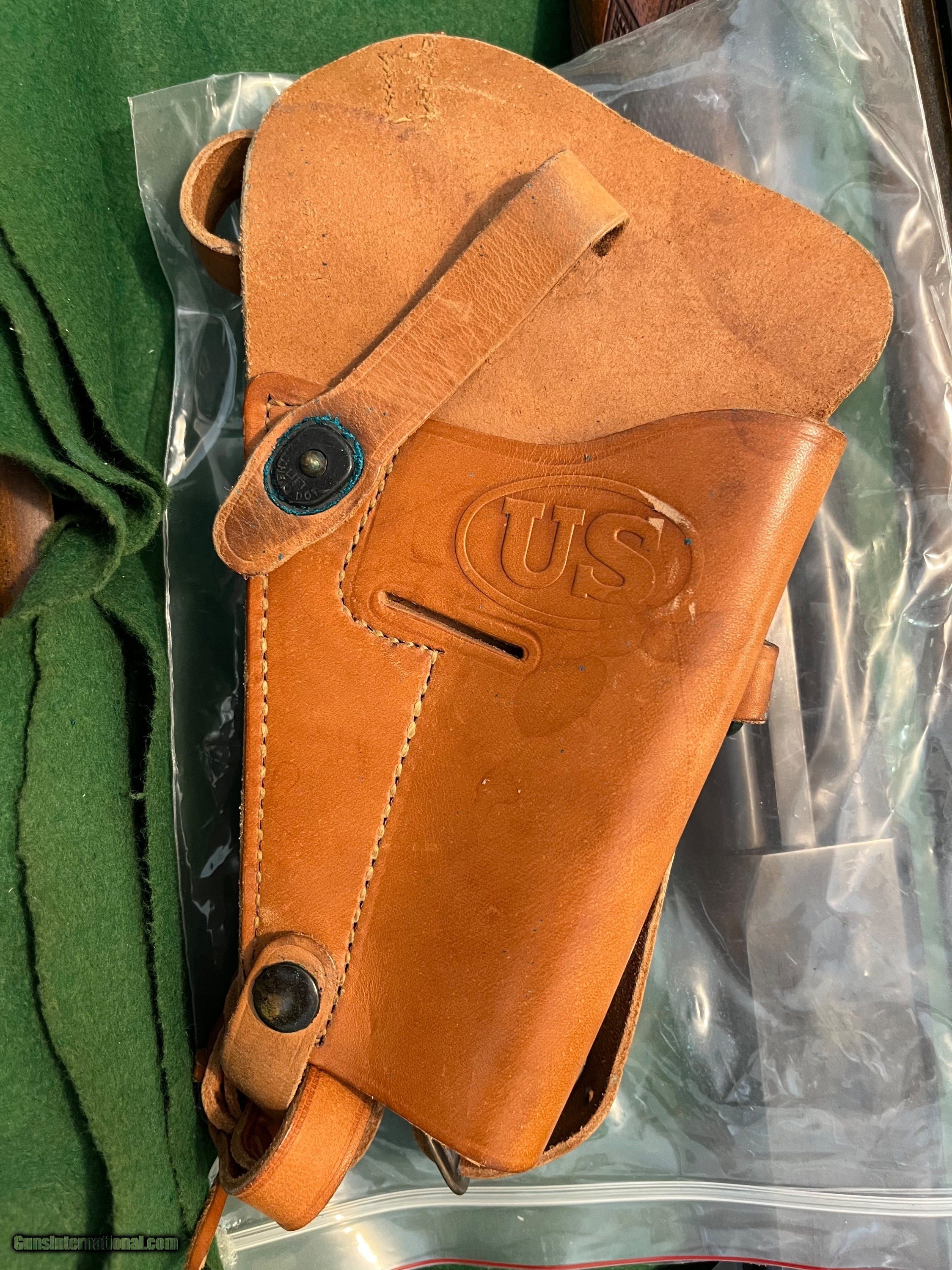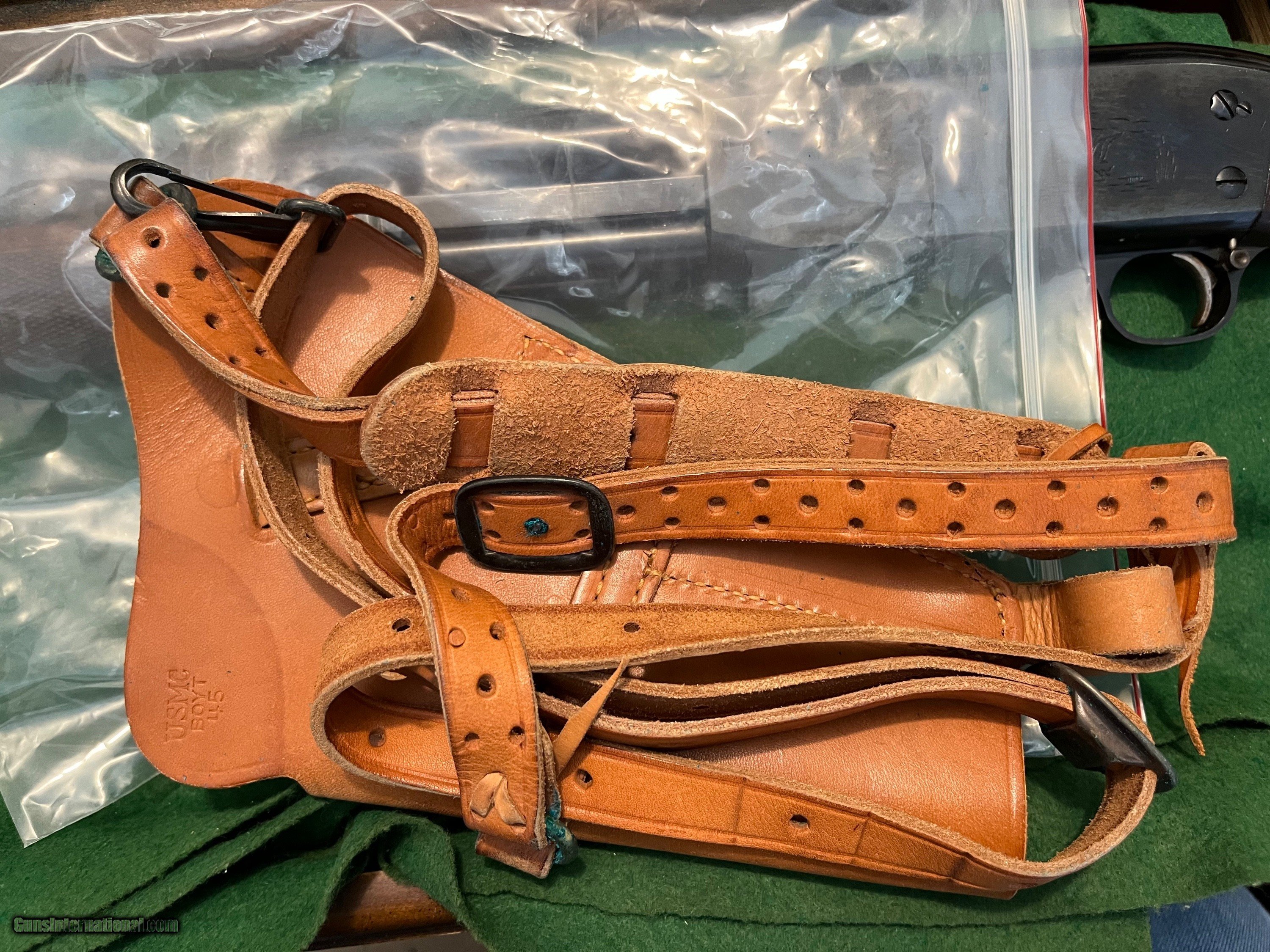 Description: 1944 Remington Rand 1911A1. 99% Original Condition. This one is Flat New. General Shaver Magazine. High Standard Barrel. It comes with it's 1945 dated USMC M7 Boyt Shoulder Holster. It also is in new condition. SOLD Handgun Caliber: .45 ACP (.45 Auto) |