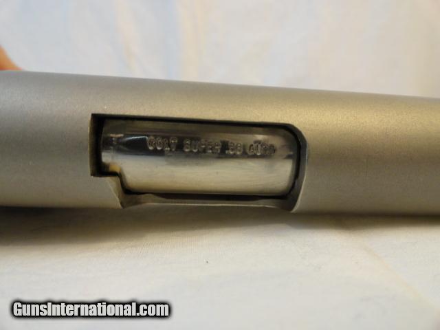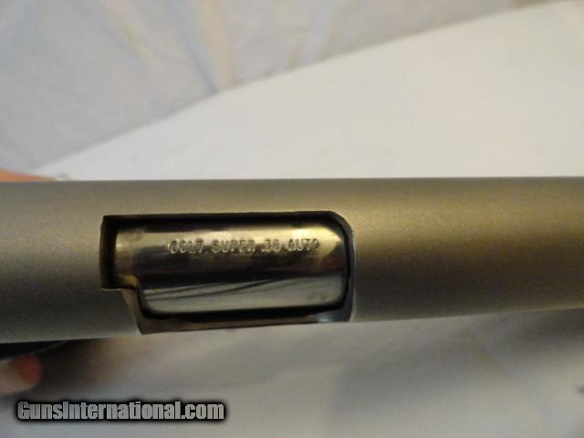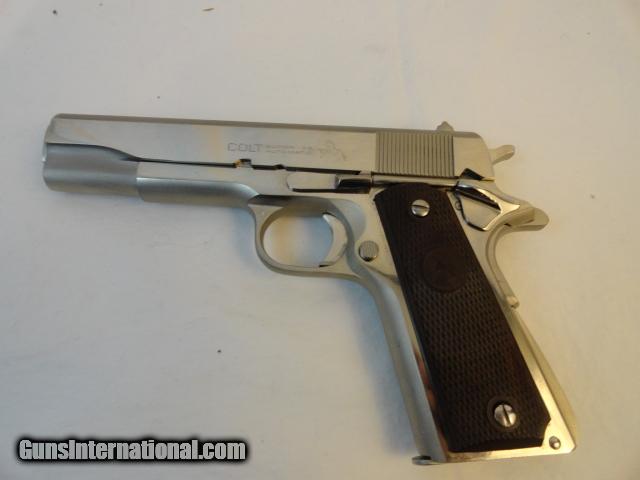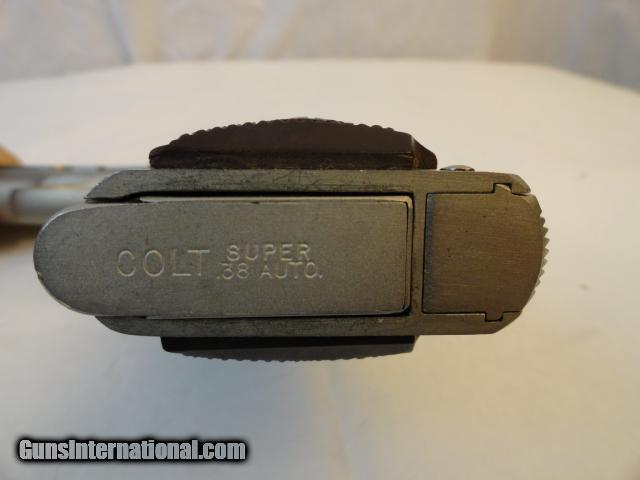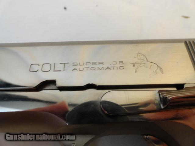Almost completely disappeared from the market with only 2 % of total production post war .38 Supers finished in full factory high polish nickel. This example is near mint with 100% factory nickel finish, with only a light idiot mark and a few of the usual minor surface abrasions keep this out of the mint category. Proper brown Colt grips with no cracks and a hint of the usual shrinkage. Mint bore and action. Original period matching clip. Outstanding gun.