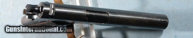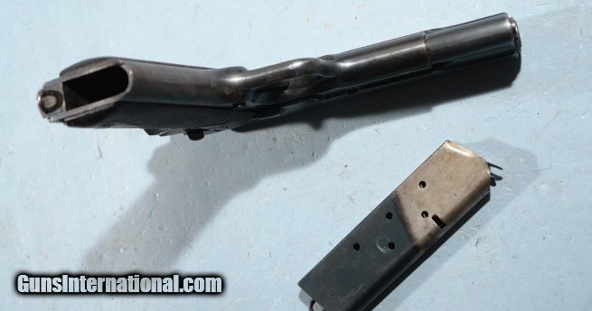 Description: SUPERIOR EARLY PRE WW1 COLT U.S. MODEL 1911 SEMI-AUTO .45 ACP PISTOL CA. 1914. All matching (66,xxx range) and original with exception of early Springfield replacement barrel and bushing with barrel toggle proofed "S" and “P”(commonly replaced by arsenals after WWI). 80% plus original military blue(beginning to fade to plum) and excellent original grips with period of use wear. Slide with early style address and patent date format. Original early military magazine with lanyard loop. Perfect working order and excellent, bright bore. Factory records indicate it was shipped from Colt March 18, 1914. SOLD Curio/Relic: Yes |