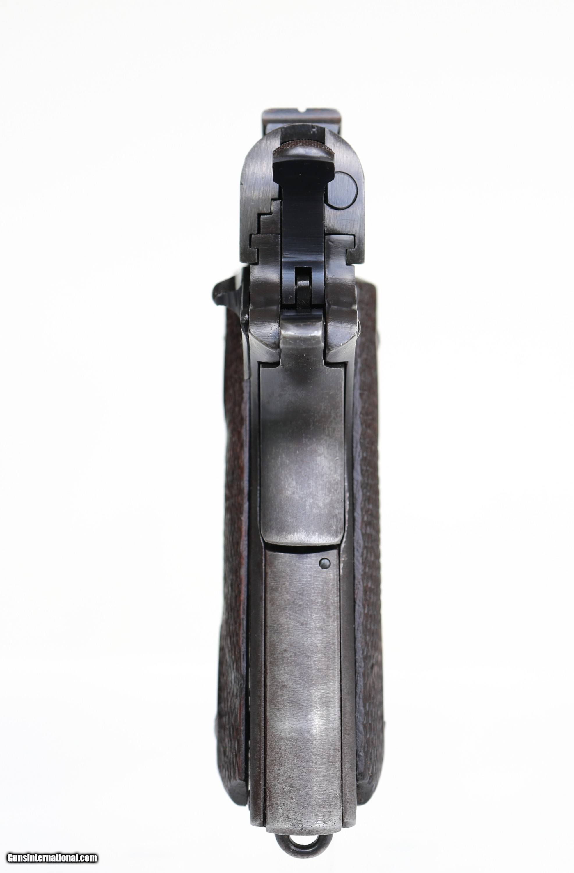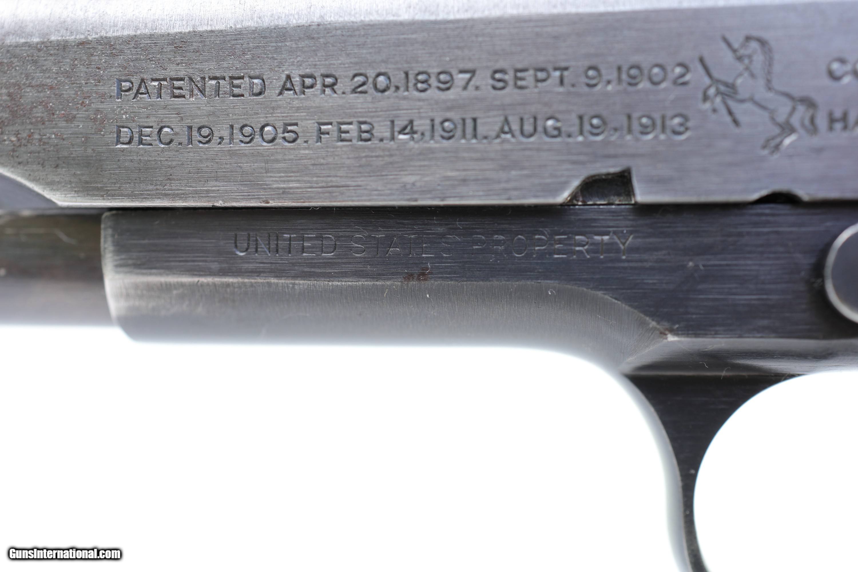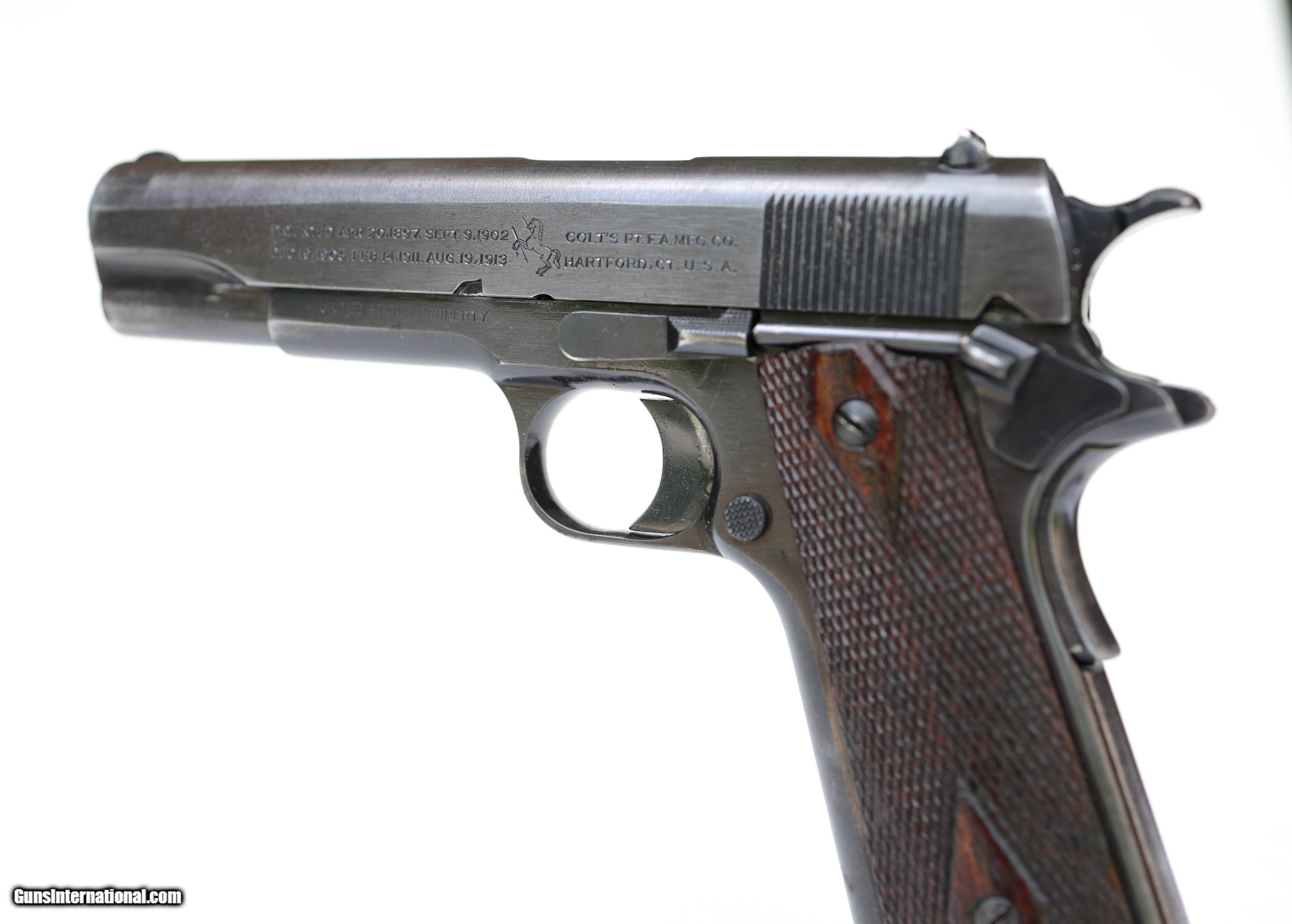 Description: Edited 9/17/23 Price reduced. Extra mags and mag pouch not included. For sale is a very nice Colt M1911 made in mid 1918, s/n 321654. This pistol appears to be all original except for the slide stop which is Springfield. Original blued finish rates about 80%. Finish on the front and back grip straps is worn to a grey patina. There is a spot on the right side of the slide by the spring plug, and some mild discoloration around the lanyard loop. There is a trace of peppering on the left front top of the slide and some minor discoloration on the frame under the grips. Overall condition rates good. Slide has period correct Colt roll stamp, H mark, and early disconnector recess. Eagle’s head proof on the frame. Wear marks on slide and frame match. Barrel is marked H P on the barrel hood and 5 on the bottom in front of the lugs. Wear marks on the slide face, barrel lug, and breach match which indicates that the barrel is original to the gun. Bore is good. Lands are clean, grooves are a little gray. Recoil spring is the early long type with 32¾ coils. Long smooth wide hammer, checkered slide stop and thumb safety. Small parts retain nearly all of the original finish. Short grip safety. Early front sight. Rear sight is early U notch. Walnut grips are in good shape and appear original. Comes with two-toned, Colt pinned base, unmarked magazine. This is a very nice original Colt M1911 pistol from 1918. $2500 shipped insured to FFL 01. Add $50 for shipment to FFL 03. Payment by cashier’s check, postal money order, Visa, Mastercard, or personal check with shipment after check clearance. Add 4% for credit card payment. Kansas residents add 9.7% sales tax. Offered with three day non-firing return. Buyer pays return shipping. Sorry, no international sales. By purchasing this firearm, buyer acknowledges, accepts and agrees to the following terms of sale: Terms of Sale I. Credit card purchases add 4%. II. State and Local Laws It is the responsibility of the buyer to know and respect the state and local laws where you reside. Firearms laws for each state can be found here: ://atf.gov/firearms/state-laws-and-published-ordinances-firearms-34th-edition III. Waiver of Liability By on and purchasing this item, buyer/ acknowledges and agrees to this waiver of liability and hold harmless clause, and accepts as a term of sale. 1. RELEASE, WAIVE, DISCHARGE AND COVENANT NOT TO SUE, Kansas Military Firearms LLC, Olathe, KS, its principal, or employees (hereinafter referred to as RELEASEES) from any and all liability, claims, demands, actions and causes of action whatsoever arising out of or related to any loss, damage, or injury, including death, that may be sustained by Buyer/, or any of the property belonging to buyer/, WHETHER CAUSED BY THE NEGLIGENCE OF THE RELEASEES, or otherwise, while participating in such use. 2. Buyer/ acknowledges havingon and purchased a used firearm. Buyer/ is fully aware of the potential risks involved and hazards connected with any kind of use of such firearm, and buyer/ agrees to have said firearm examined by a competent gunsmith before attempting to fire or in any way use said firearm. Buyer/ VOLUNTARILY ASSUMES FULL RESPONSIBILITY FOR ANY RISKS OF LOSS, PROPERTY DAMAGE OR PERSONAL INJURY, INCLUDING DEATH, which may be sustained by buyer/, or any loss or damage of property owned by buyer/, as a result of any kind of use of this firearm, WHETHER CAUSED BY THE NEGLIGENCE OF RELEASEES OR OTHERWISE. 3. Buyer/ hereby AGREES TO INDEMNIFY AND HOLD HARMLESS the RELEASEES from any loss, liability, damage or costs, including court costs and attorney fees, that may incur due to use of said firearm by buyer/, WHETHER CAUSED BY NEGLIGENCE OF RELEASEES or otherwise. 4. It is the express intent of buyer/ that this Waiver of Liability and Hold Harmless Agreement shall bind the members of buyer/'s family and spouse, if buyer/ is alive, and buyer/'s heirs, assigns and personal representative, if buyer/ is deceased, and shall be deemed as a RELEASE, WAIVER, DISCHARGE AND COVENANT NOT TO USE SUE the above-named RELEASEES. I hereby further agree that this Waiver of Liability and Hold Harmless Agreement shall be construed in accordance with the laws of the State of Kansas and specifically, Johnson County. IV. Return Policy This item is sold with a three day non-firing return. Three day period begins with receipt at /buyer's designated delivery address. Disassembly is allowed. Buyer pays return shipping. Discharge of this firearm i.e. shooting, and/or damage of any kind including but not limited to scratches, take down marks, dents, etc. caused by but not limited to buyer, buyer's friends, relatives, or associates, and not readily identifiable in listing photos voids return, as does substitution or removal of any part whatsoever. V. Shipping and Insurance Shipping cost does not include insurance unless specifically stated. We strongly advise insuring your purchase for a minimum of the purchase price. In the case of a firearm lost or damaged in shipment, buyer/ is responsible for retaining all packaging, obtaining pictures of damaged item and packaging, and for notification of loss or damage to Kansas Military Firearms LLC within 48 hours of receipt or intended delivery time at buyer/'s designated delivery address. Filing and administering any and all claims with the delivering carrier is the responsibility of buyer/. Kansas Military Firearms LLC will promptly assist buyer/ with said claim to the very best of our ability. SOLD Curio/Relic: Yes Handgun Caliber: .45 ACP (.45 Auto) |