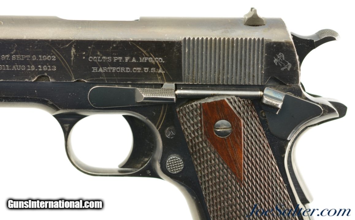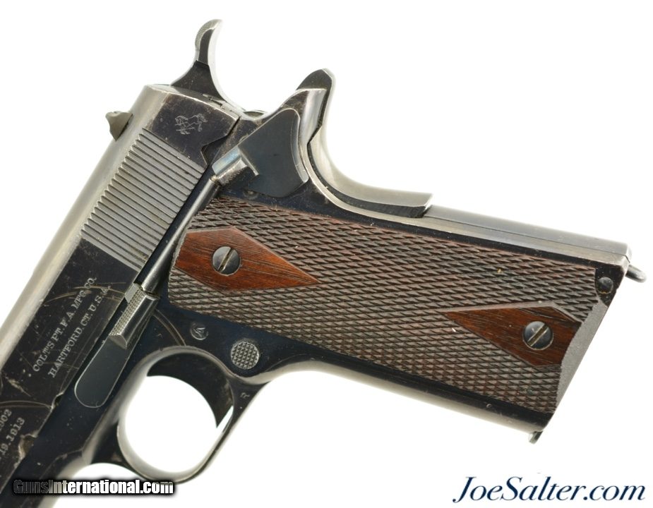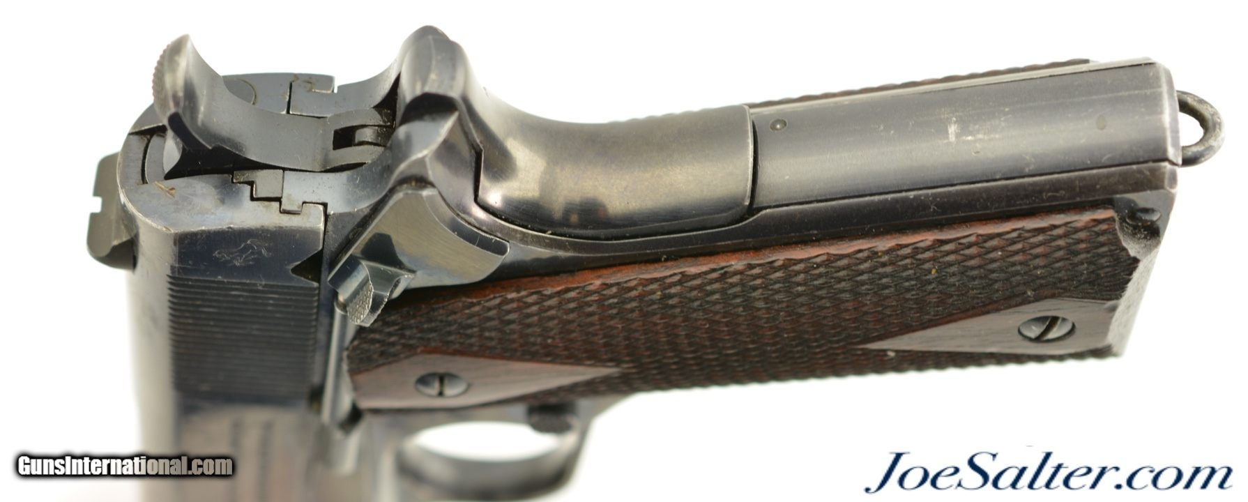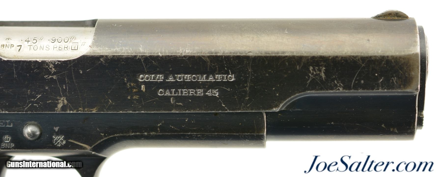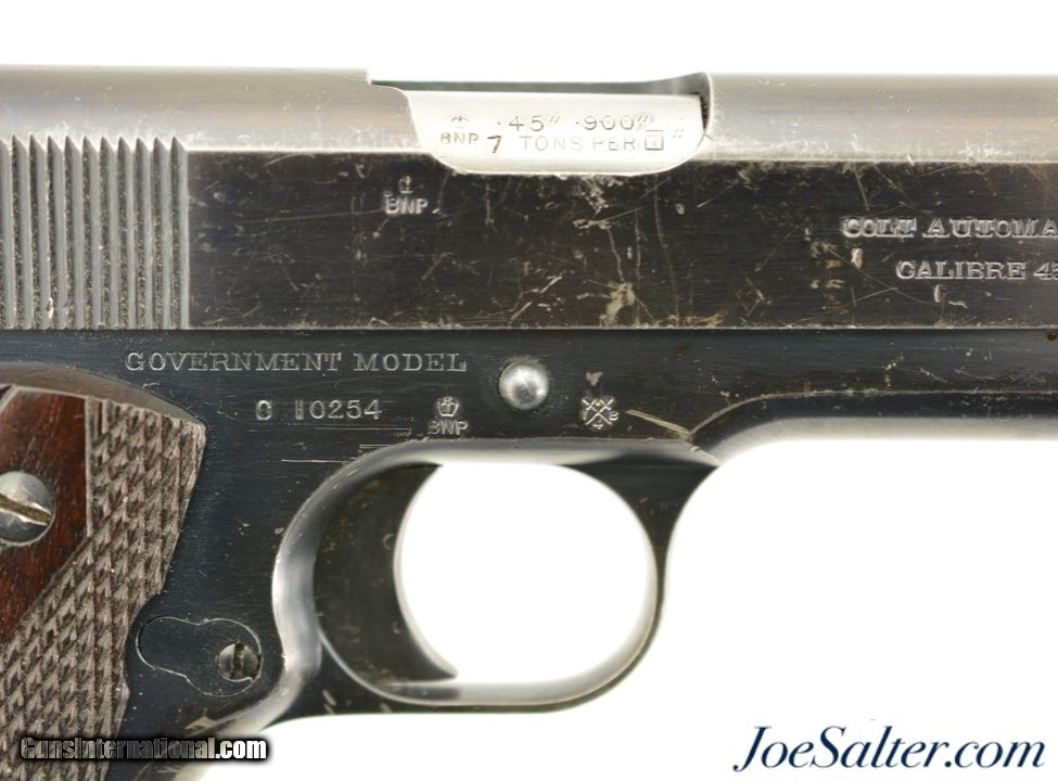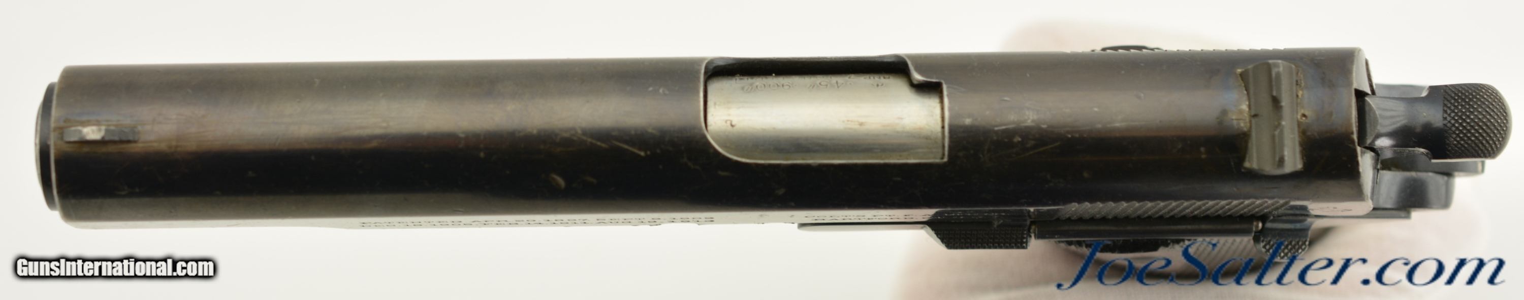 Description: Serial #C10254, .45 ACP, 5" barrel with an excellent, bright bore. This is a 1914-made pistol that has 95-97% of the original blue finish remaining with some mild silvering at the muzzle, as well as at the rear of the slide next to the rounded rear sight. There are some further small surface scratches and minor finish loss scattered about. The pistol has a later, rounded spring guide installed, and has a Canadian "C (Broad Arrow)" property stamp on the left side of the frame, as well as Birmingham commercial proofs on the right side of the frame and slide. The checkered double-diamond grips are in fine condition with only some minor surface blemishes and light wear, mostly around the butt, and mild flattening of the points. The left grips is a Springfield Armory-made panel with 11 rows of checkering between the diamonds, while the right panel is a Remington-UMC-made panel with 13 rows. The interior of the right panel is stamped: "MAJOR / VOLNEY STEPHENS / DCM / YPRES 1916." We have done an extensive search and have not been able to find a listing for any Canadian officer with that name. Further research might prove fruitful. A single period two-tone magazine is included. This pistol was one of 5000 commercial 1911's purchased between September and October of 1914 and was one of the last 1,000 guns of the order, shipped to H.W. Brown of Quebec, Canada (Canadian purchase agent at the time) on October 31, 1914. A 2014-dated Colt factory letter accompanies the pistol and confirms the shipping date and destination. This is a fine example of a Canadian-issued Model 1911, and would make a great addition to any collection. FFL or C&R SOLD |