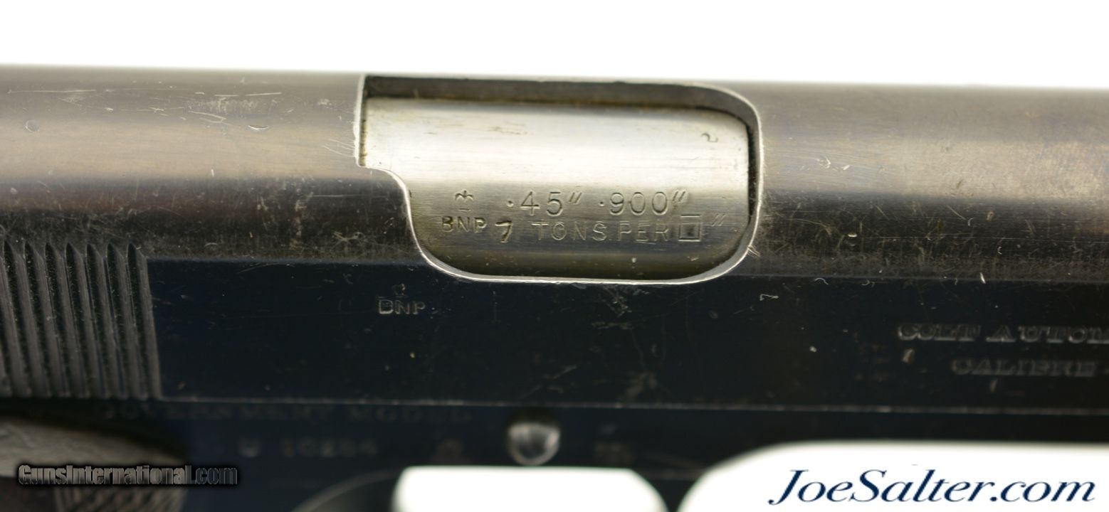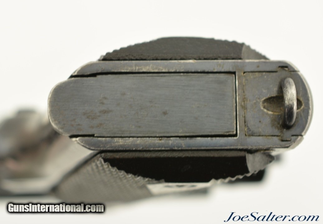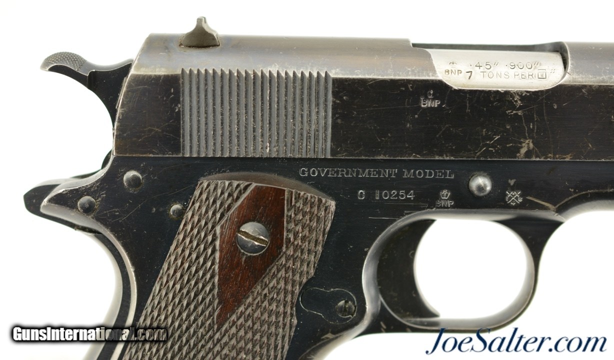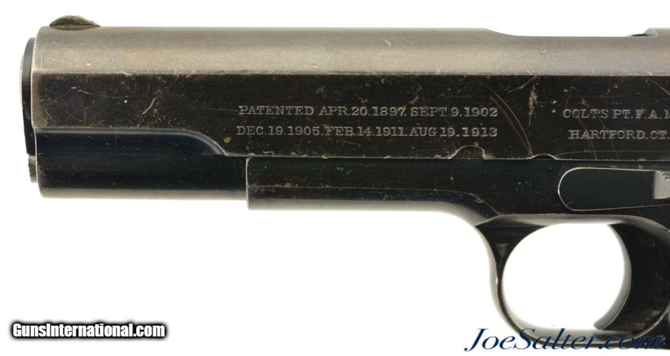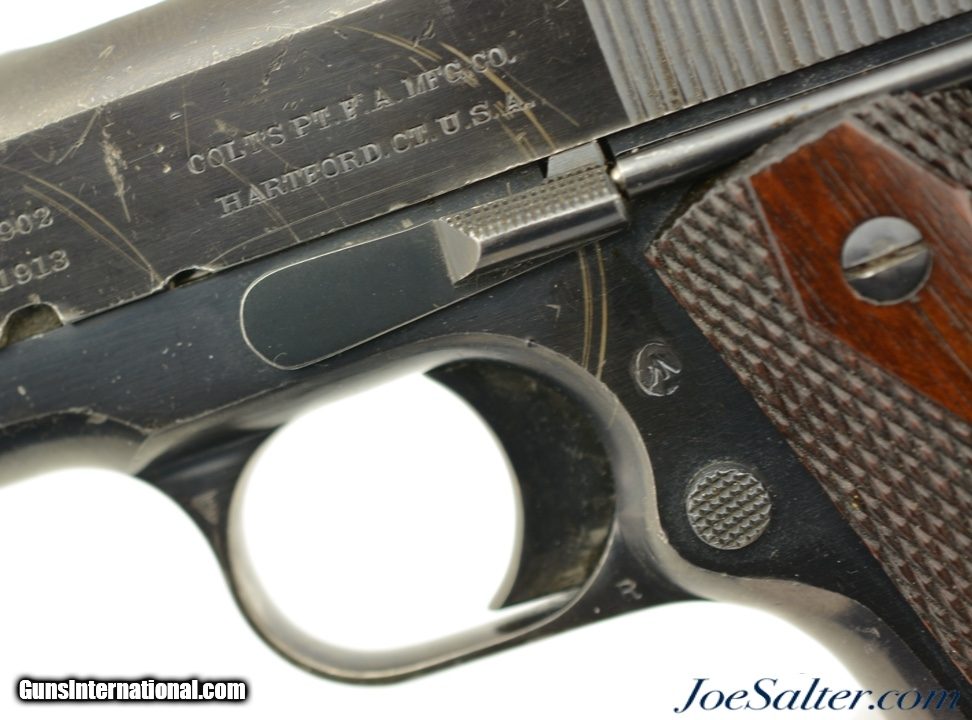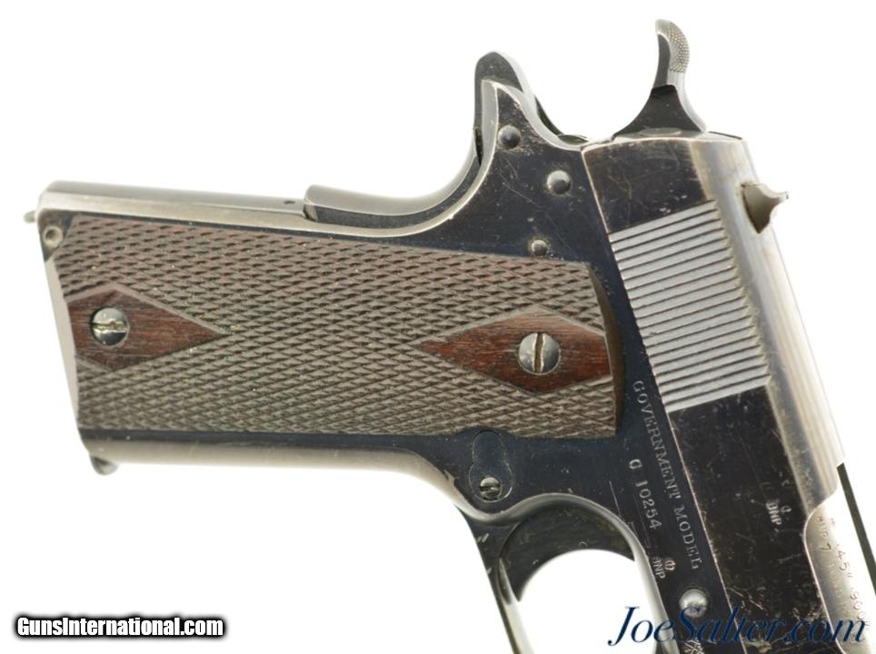 Description: Serial #C10254, .45 ACP, 5" barrel with an excellent, bright bore. This is a 1914-made pistol that has 95-97% of the original blue finish remaining with some mild silvering at the muzzle, as well as at the rear of the slide next to the rounded rear sight. There are some further small surface scratches and minor finish loss scattered about. The pistol has a later, rounded spring guide installed, and has a Canadian "C (Broad Arrow)" property stamp on the left side of the frame, as well as Birmingham commercial proofs on the right side of the frame and slide. The checkered double-diamond grips are in fine condition with only some minor surface blemishes and light wear, mostly around the butt, and mild flattening of the points. The left grips is a Springfield Armory-made panel with 11 rows of checkering between the diamonds, while the right panel is a Remington-UMC-made panel with 13 rows. The interior of the right panel is stamped: "MAJOR / VOLNEY STEPHENS / DCM / YPRES 1916." We have done an extensive search and have not been able to find a listing for any Canadian officer with that name. Further research might prove fruitful. A single period two-tone magazine is included. This pistol was one of 5000 commercial 1911's purchased between September and October of 1914 and was one of the last 1,000 guns of the order, shipped to H.W. Brown of Quebec, Canada (Canadian purchase agent at the time) on October 31, 1914. A 2014-dated Colt factory letter accompanies the pistol and confirms the shipping date and destination. This is a fine example of a Canadian-issued Model 1911, and would make a great addition to any collection. FFL or C&R SOLD |
