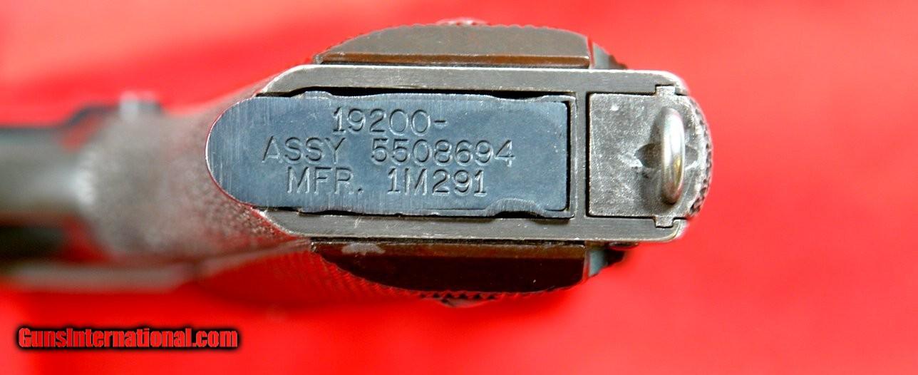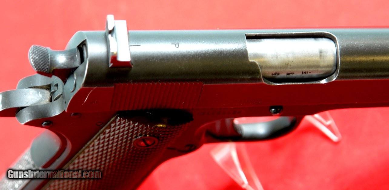 Description: 32952- WW2 WWII COLT U.S. GOVERNMENT MODEL 1911A1 OR 1911-A1 .45 ACP CAL. BRITISH LEND LEASE PISTOL MFG. 1944. Matching original “UNITED STATES PROPERTY” with British proofs on slide, frame and barrel. Slide stamped on left side “RELEASED/BRITISH GOVT. 1952”. Stippled 1911 trigger and front and rear grip straps added as well as match front and rear sights. Excellent with approximately 95% parkerized original finish. Excellent markings. Tight working order and near mint bore. Replacement 1960’s era “1M291” magazine. $2200. SOLD Curio/Relic: Yes Handgun Caliber: .45 ACP (.45 Auto) |