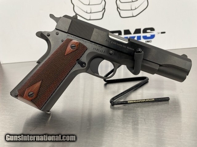 Description: Guns Listing ID: 469833 The Colt 1991 is a semi-automatic handgun and direct descendant of the original M1911. Available in a number of calibers and finishes this pistol like the 1911 has a spur hammer flat mainspring housing and long trigger as well as a grip and thumb safety. Other features include a lowered ejection port and 3-dot sights. The 1991 is built on a carbon steel frame and slide and proven a reliable and rugged pistol thats suitable for self-defense. Details Action Single Action - Caliber 45 ACP - Capacity 71 - Barrel Length 5 - Finish Black Anodized - Frame Aluminum Alloy - Sights Fixed - Grips Double Diamond Rosewood - Overall Length 8.5 - Weight 35 oz. - The Colt 1991 Series is a direct descendant of the original Colt M1911. A long trigger flat mainspring housing and original style recoil spring system remain from the original M1911 design. Upgrades from the original include white dot sights and a lowered ejection port for extra reliability. It still remains the standard that everyone tries to imitate but no one duplicates. - High Profile Sights with Dots - Spur Hammer - Standard Safety Lock - Standard Grip Safety - Solid Aluminum Trigger - Lowered Ejection Port SOLD Manufacturer: COLT Model: 1991 GOVERNMENT Caliber Info: .45 ACP Condition: new Barrels: 5 barrel Finish: BLUED |